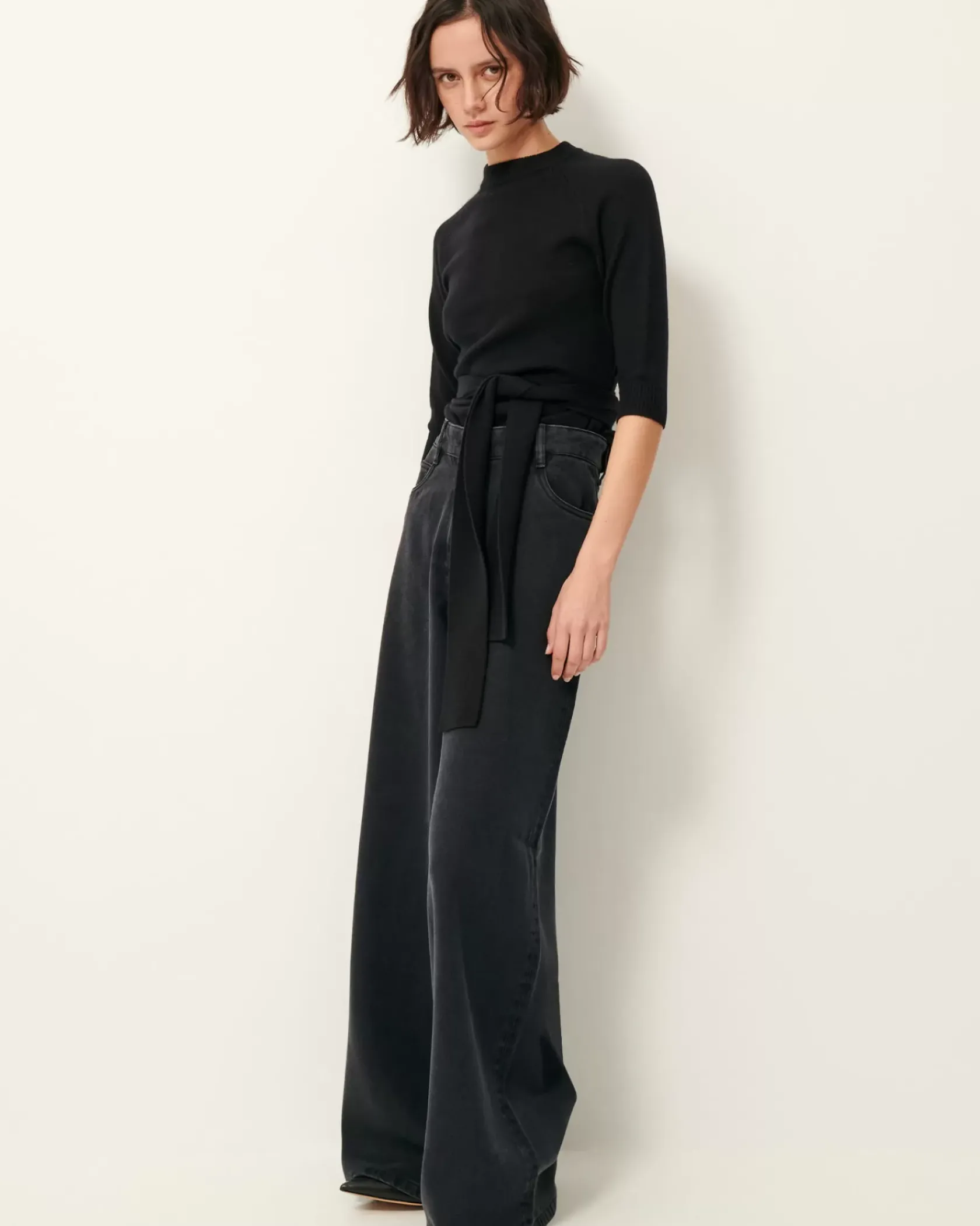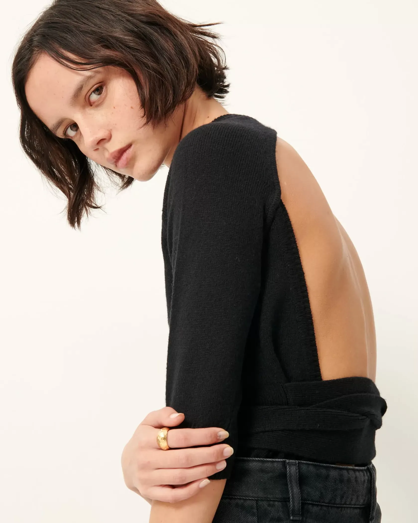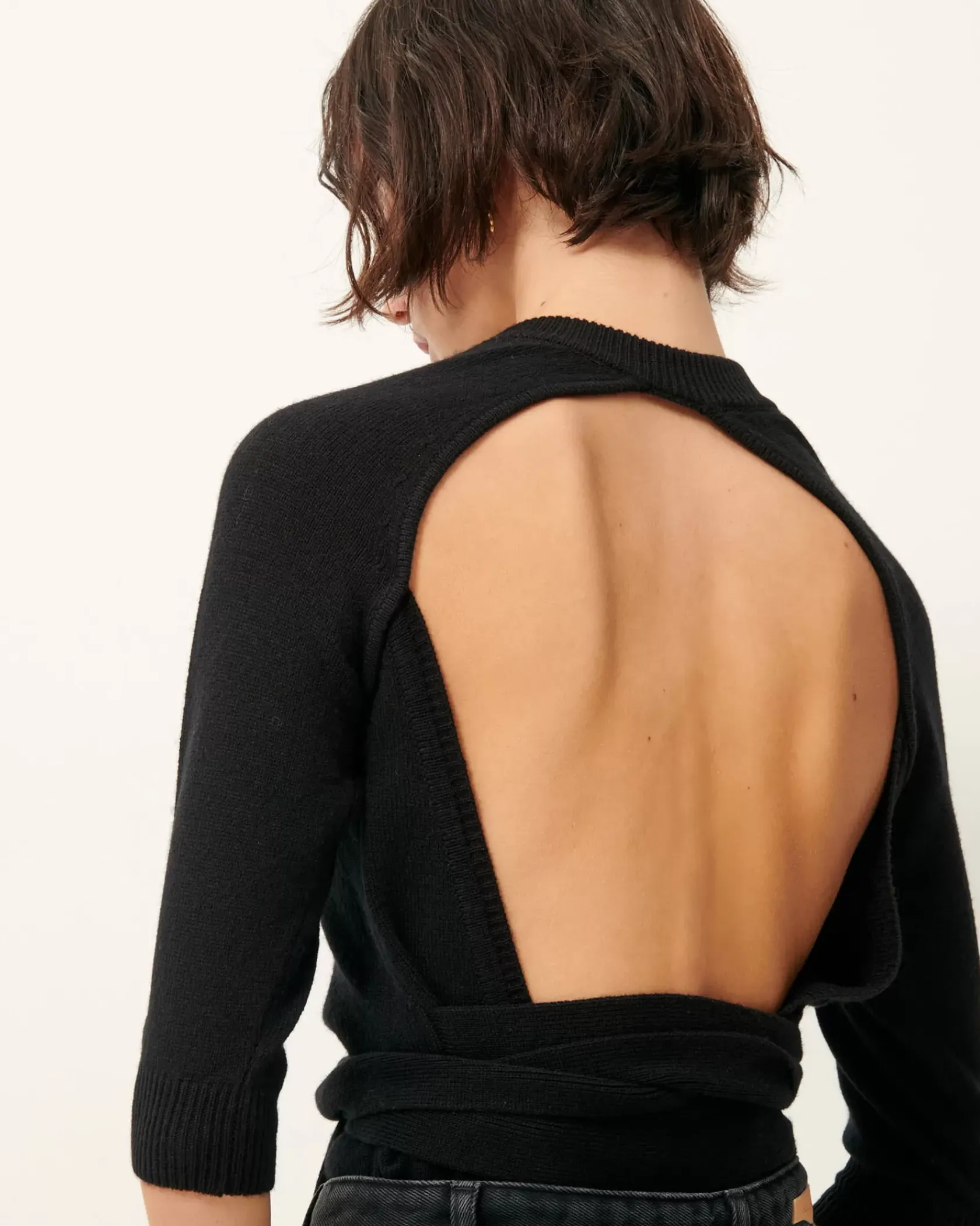 Dos nu et ceinture nouée à la taille.