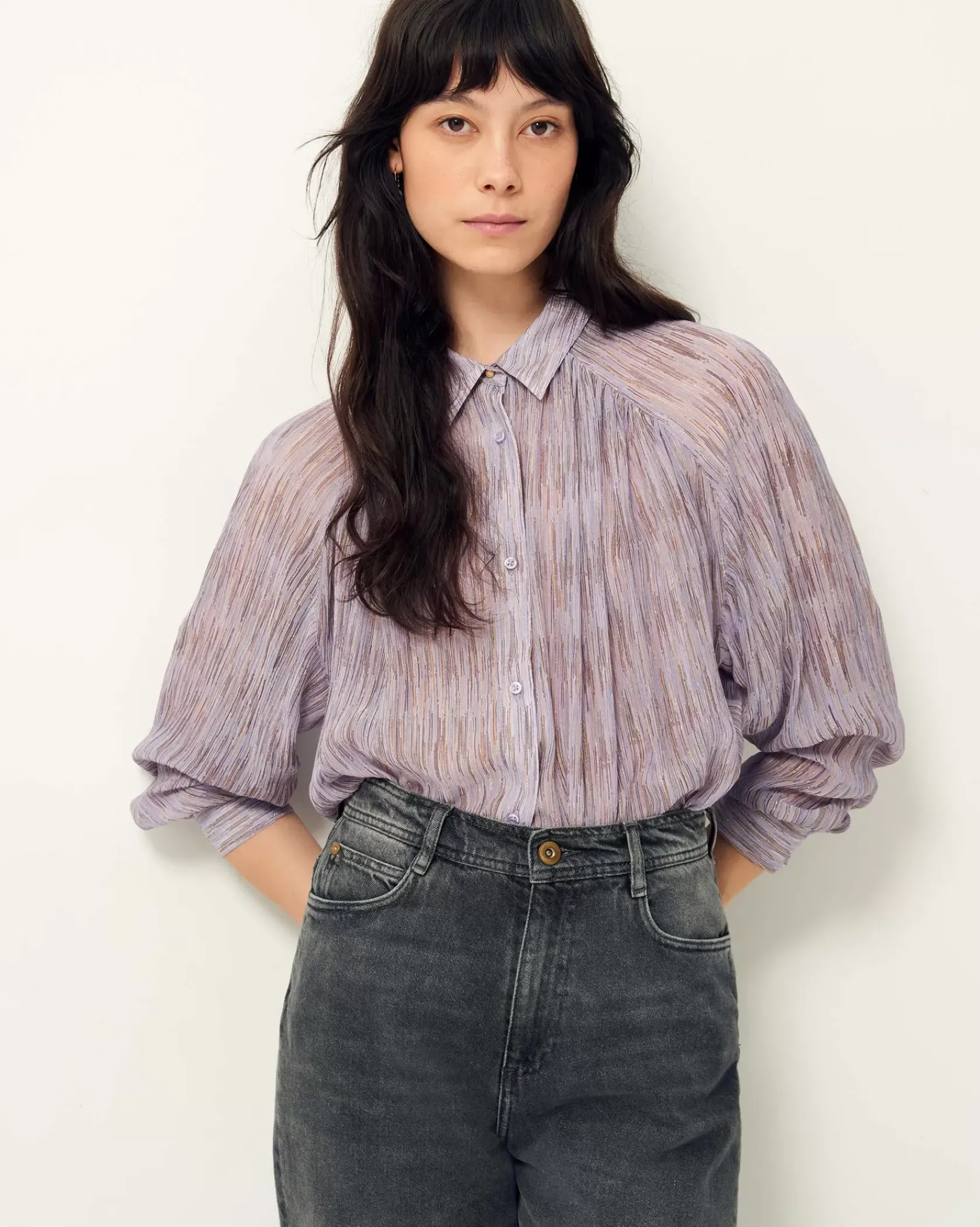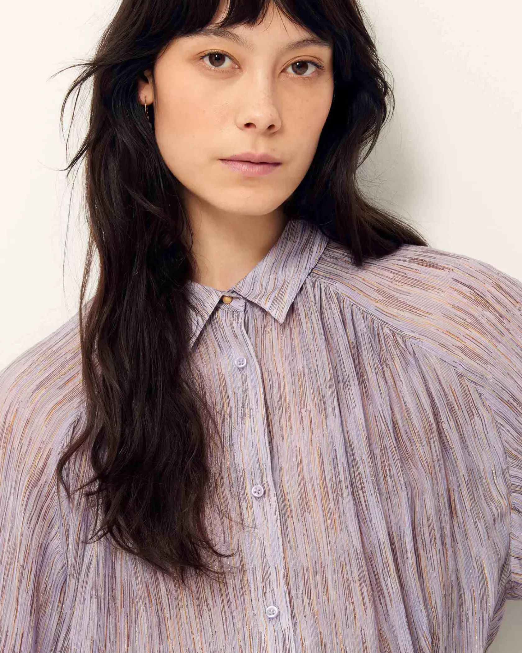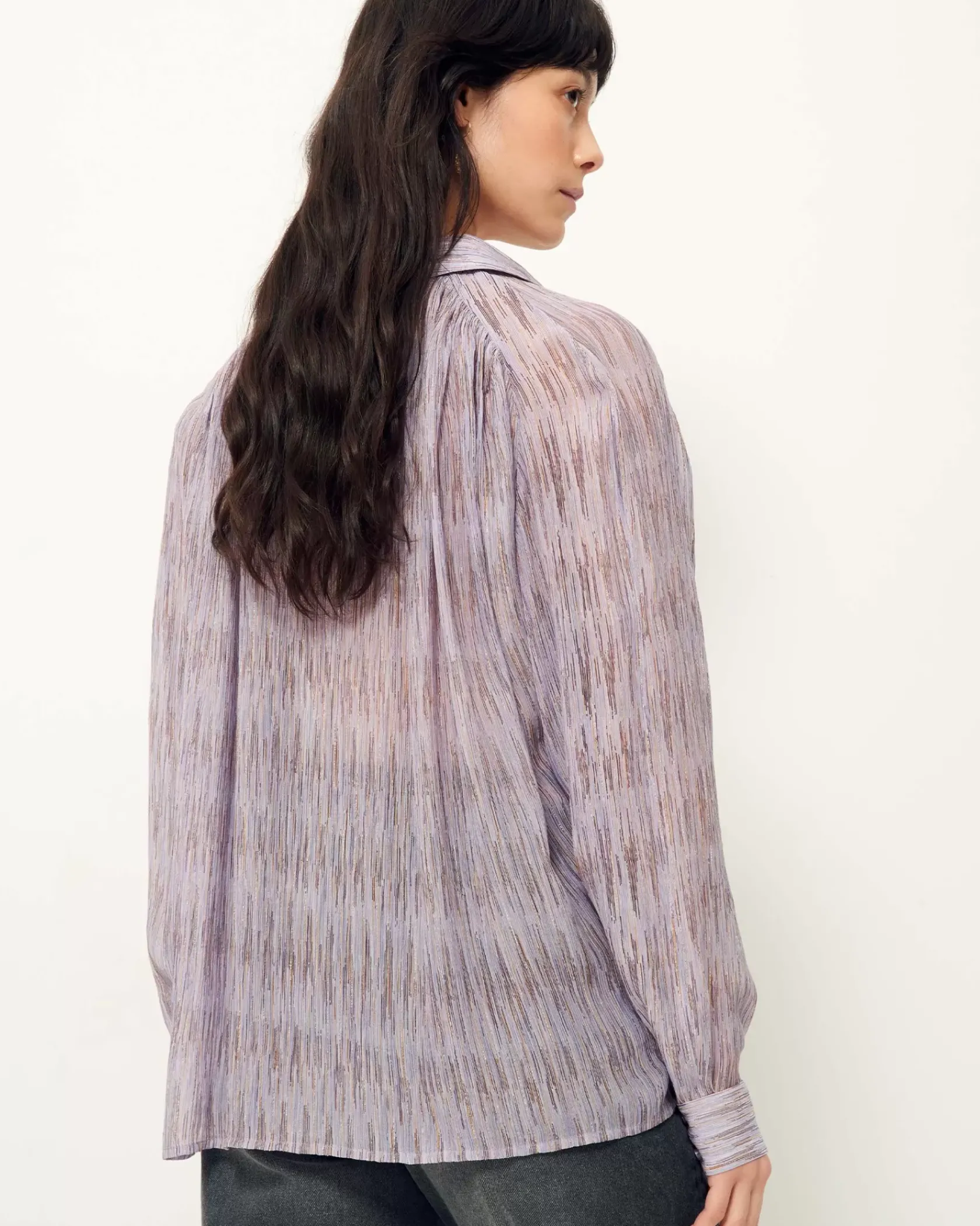 Chemise ample froncée en crépon mousseline de soie viscose imprimé, à fines rayures métallisées, motif exclusif Sessùn.