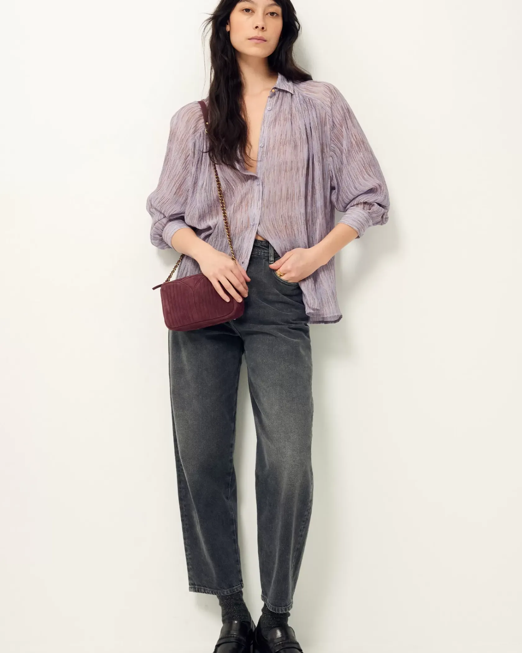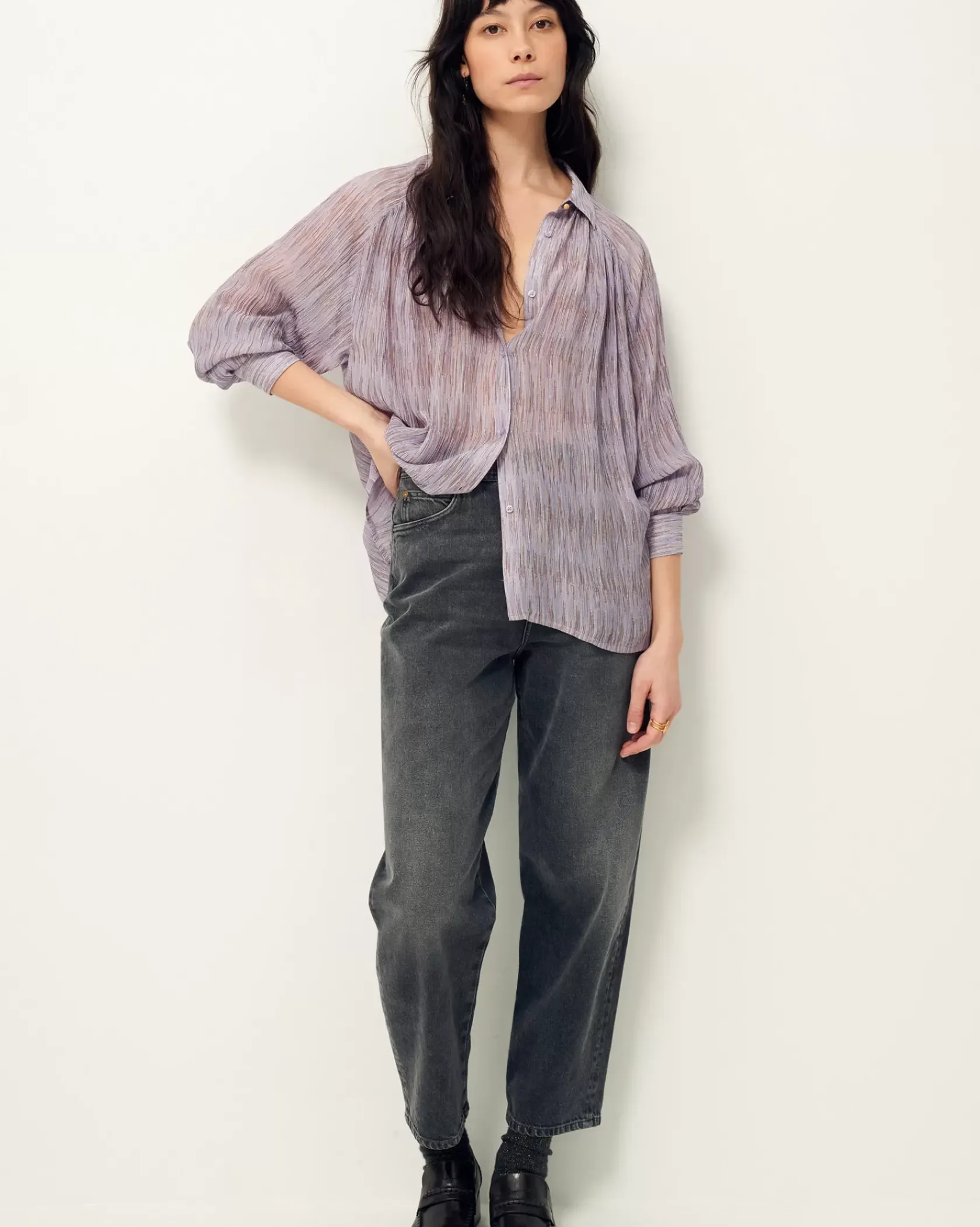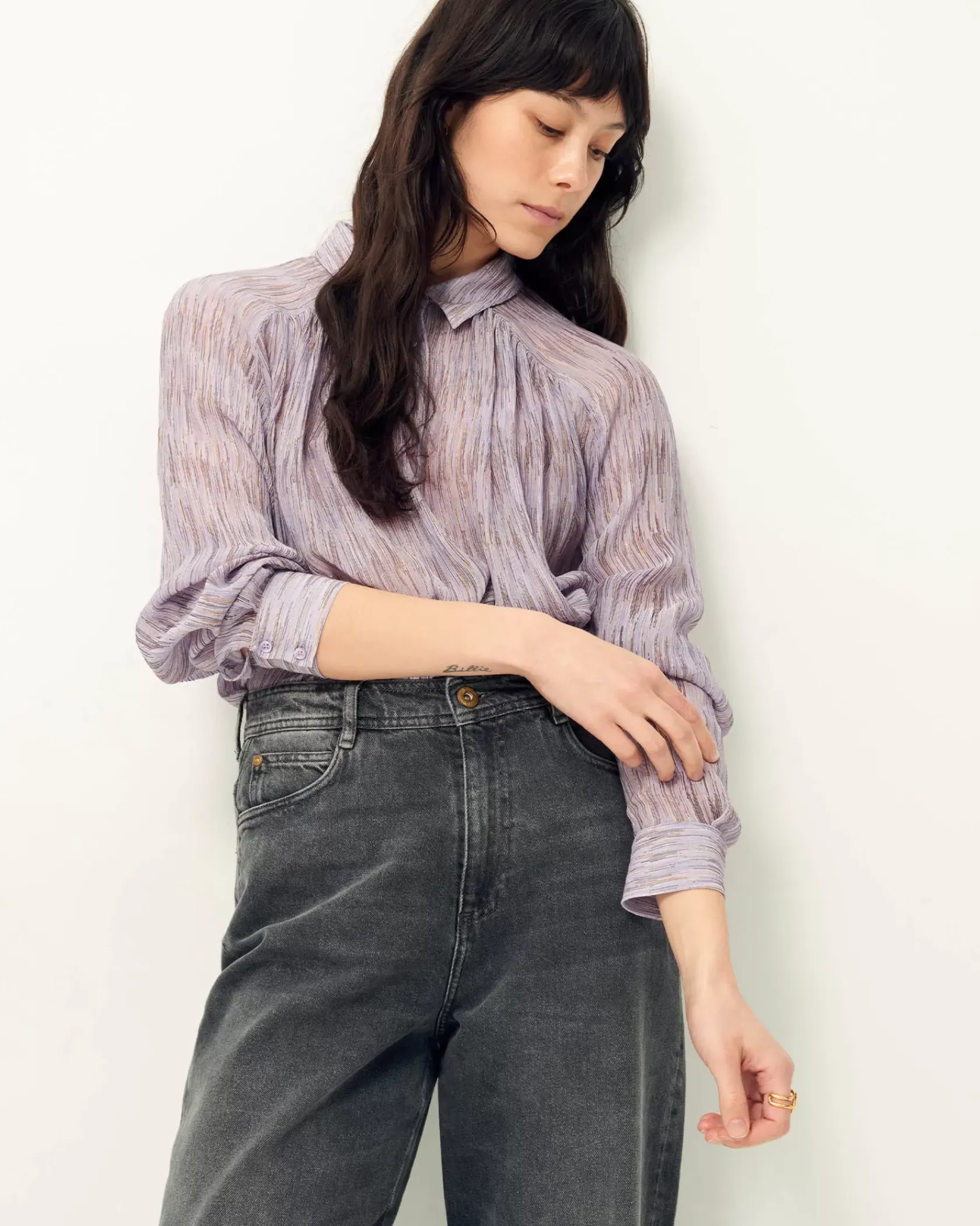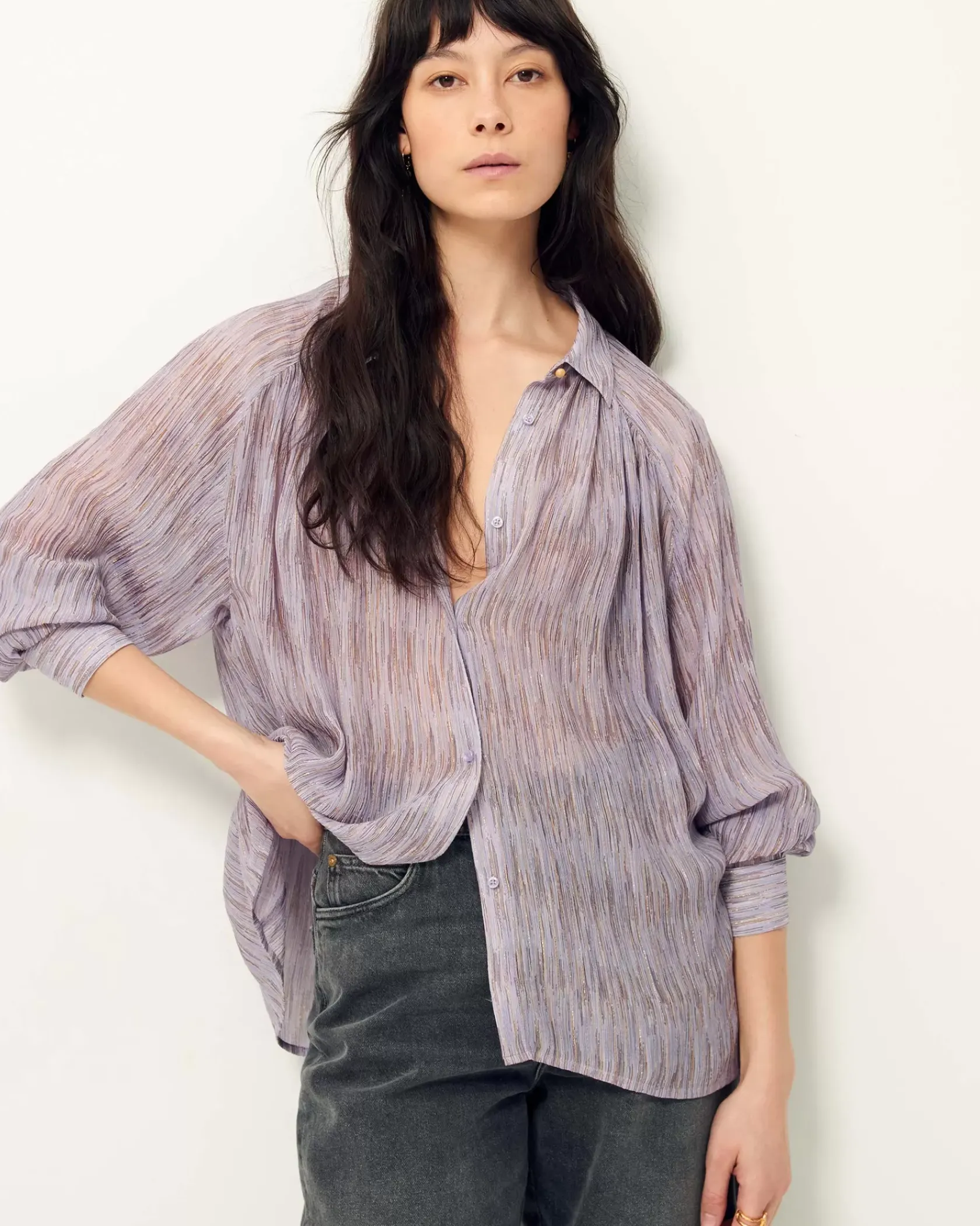 Chemise ample froncée en crépon mousseline de soie viscose imprimé, à fines rayures métallisées, motif exclusif Sessùn.