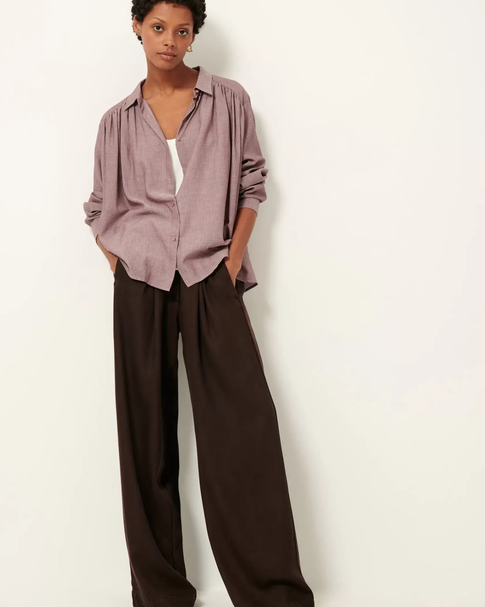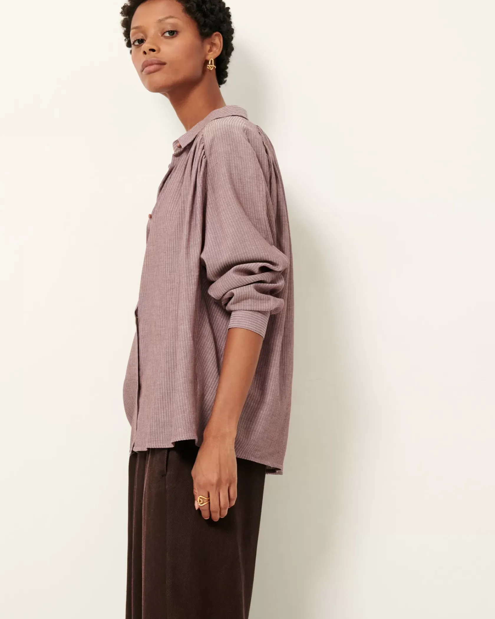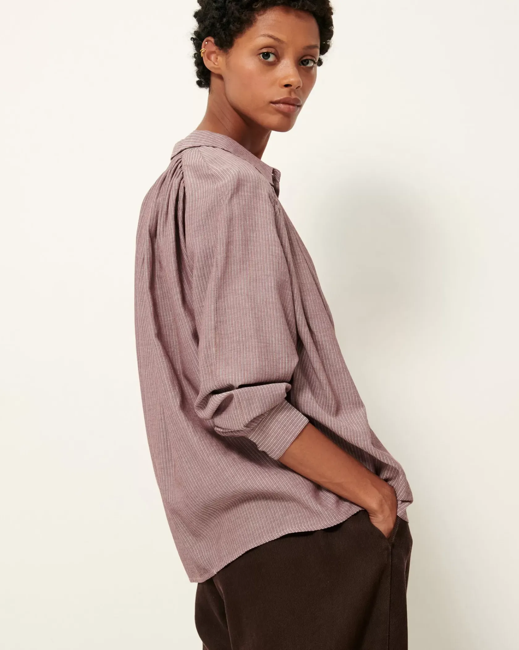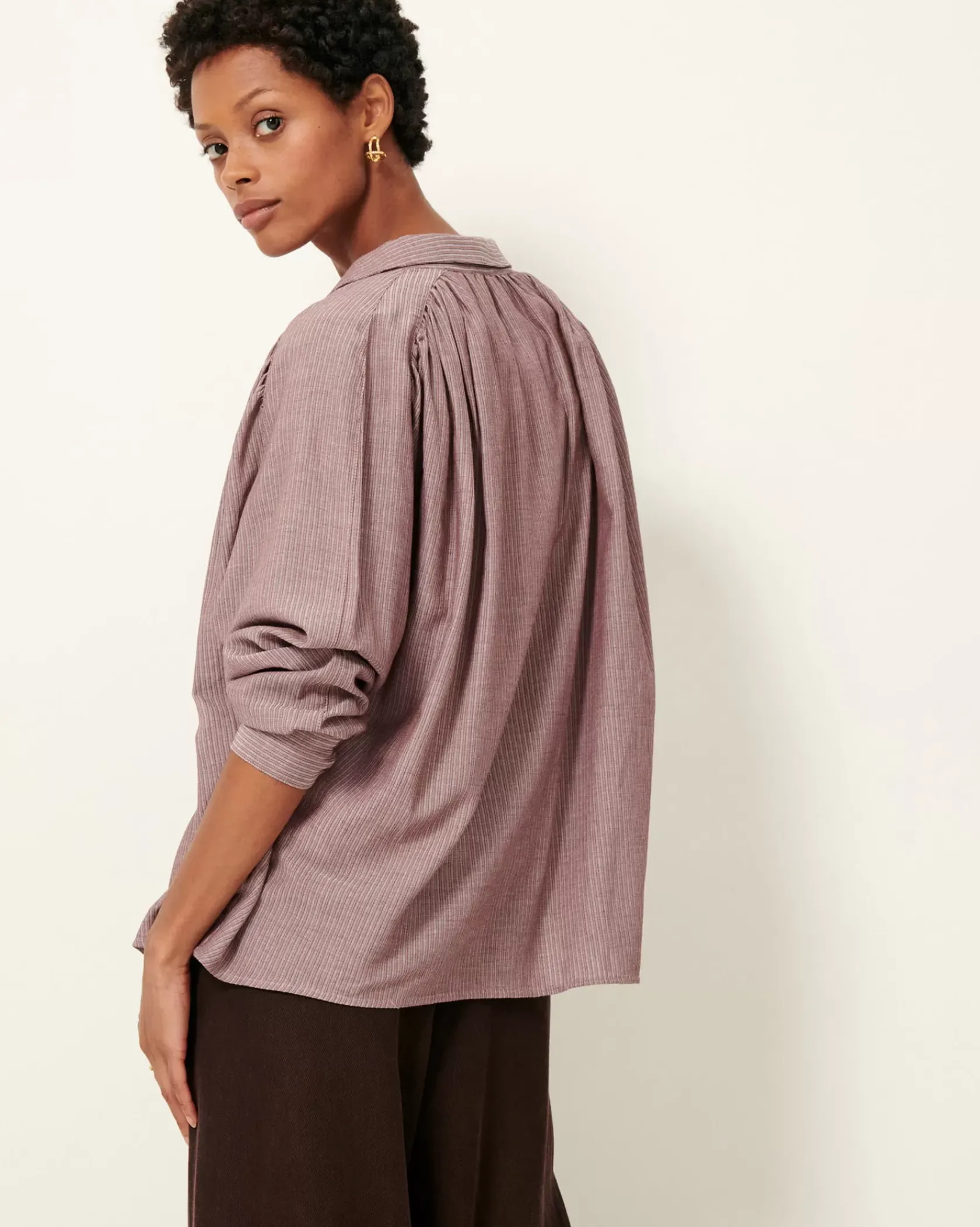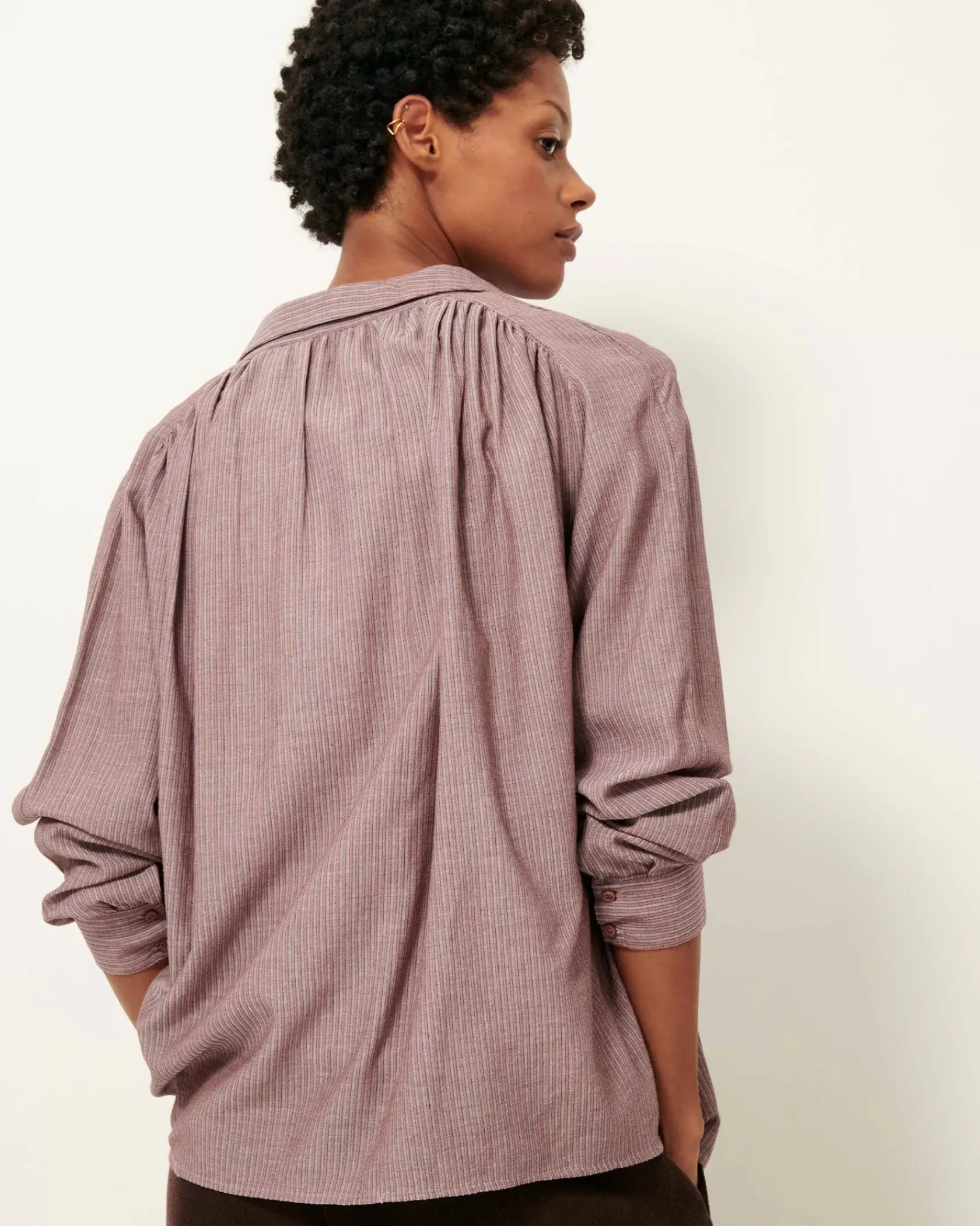Chemise ample froncée en cotonnade rayée bicolore avec travail d’armure tissée en Italie, exclusif Sessùn.
