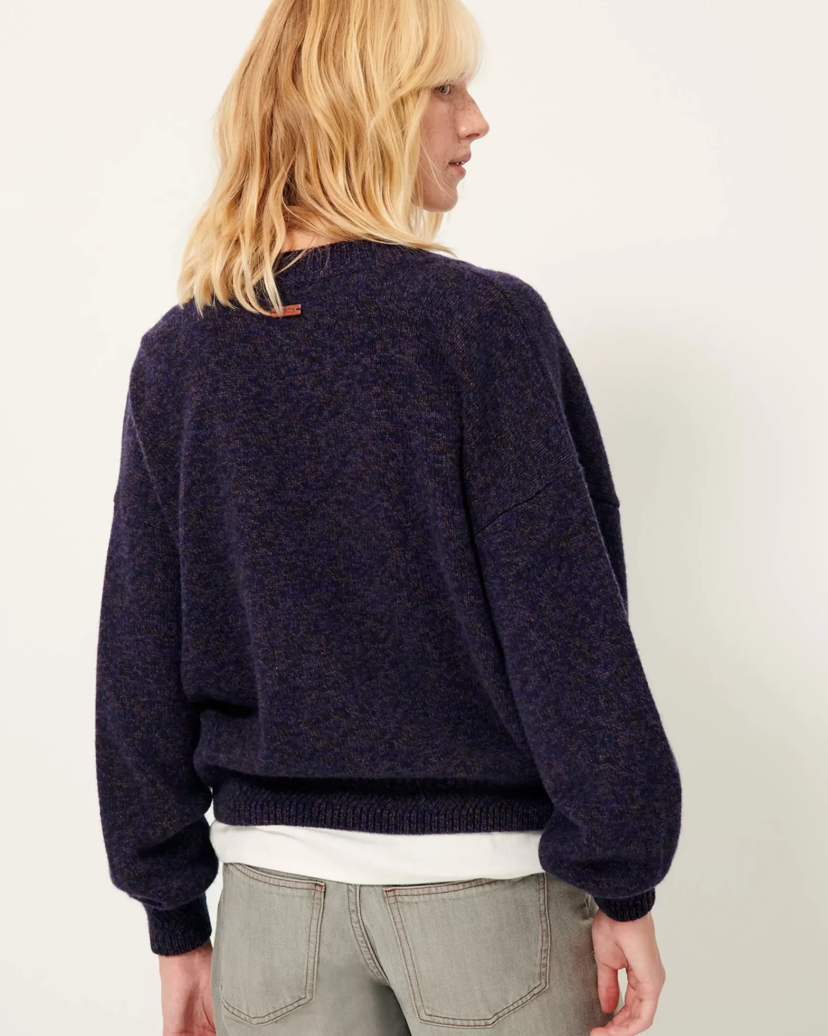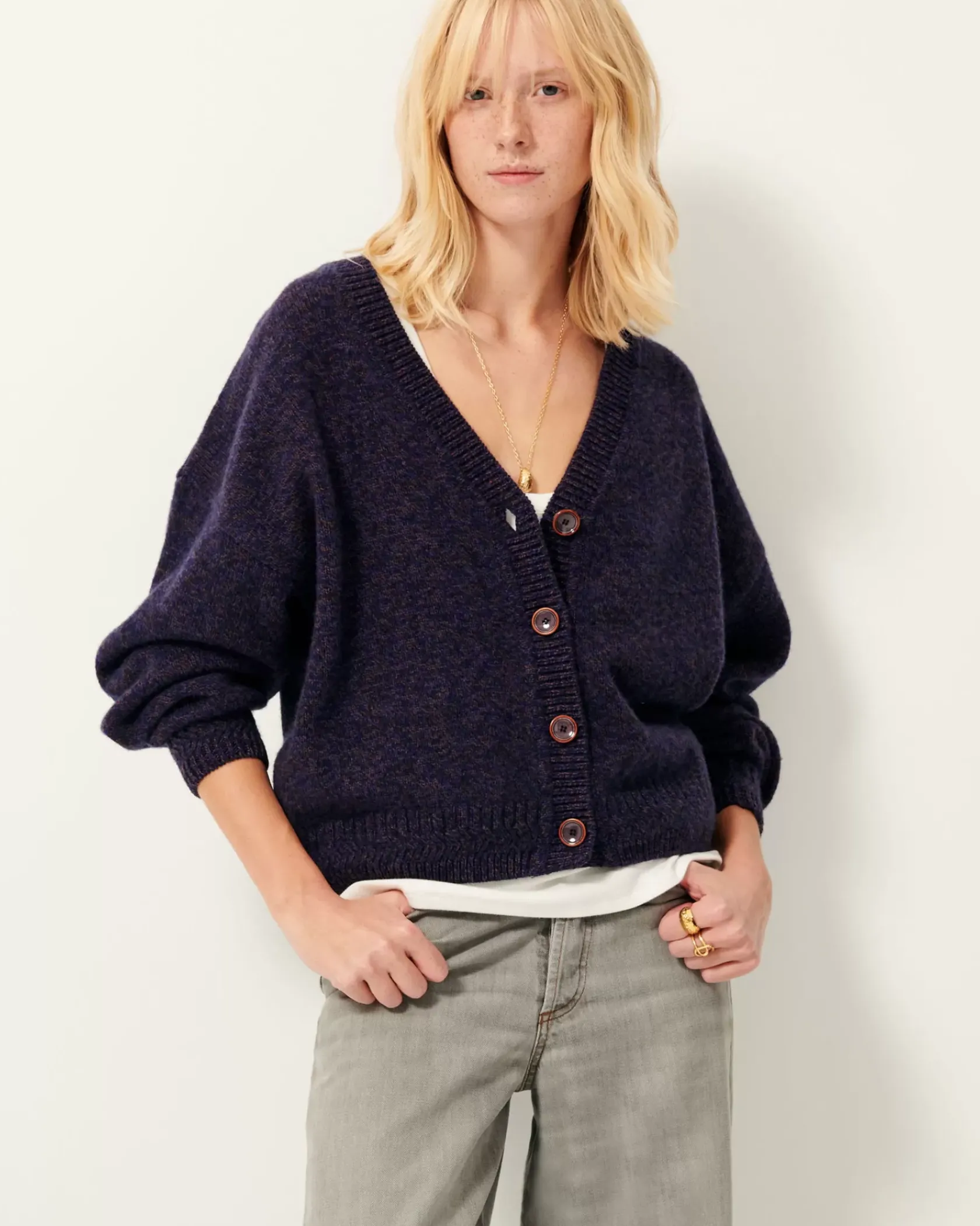 Cardigan généreux col V en maille point jersey en fil mouliné.