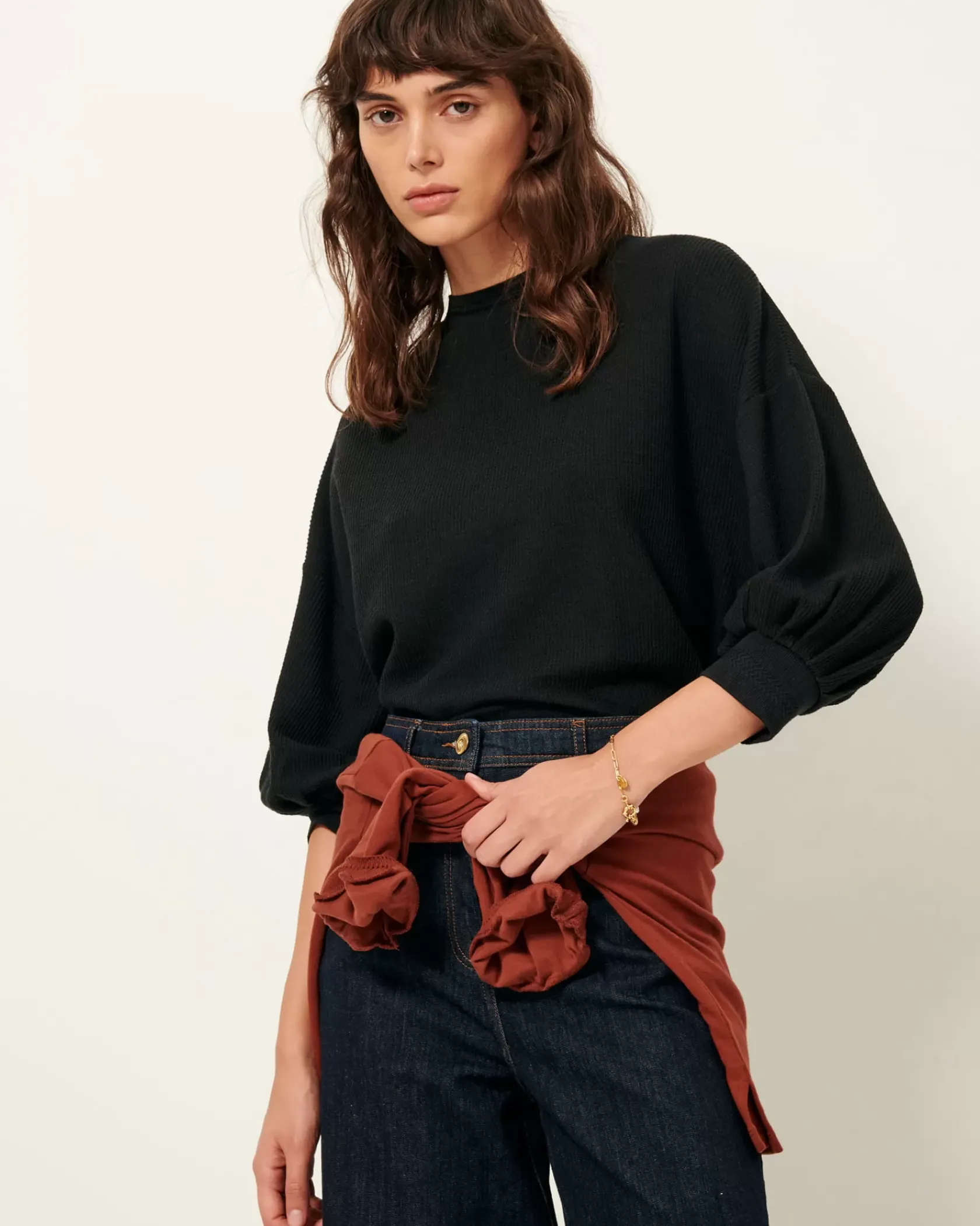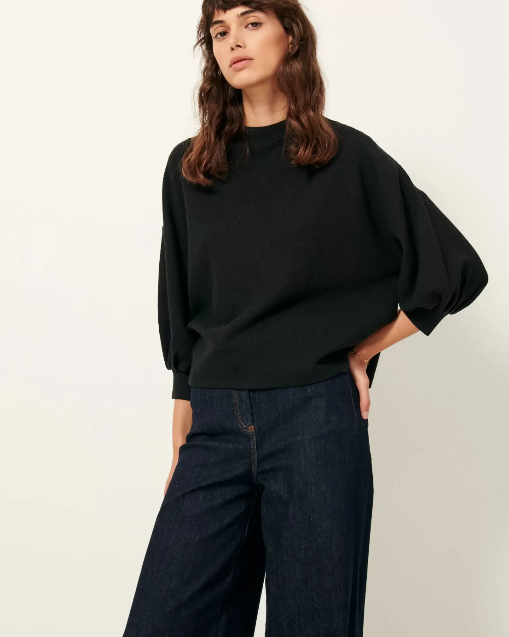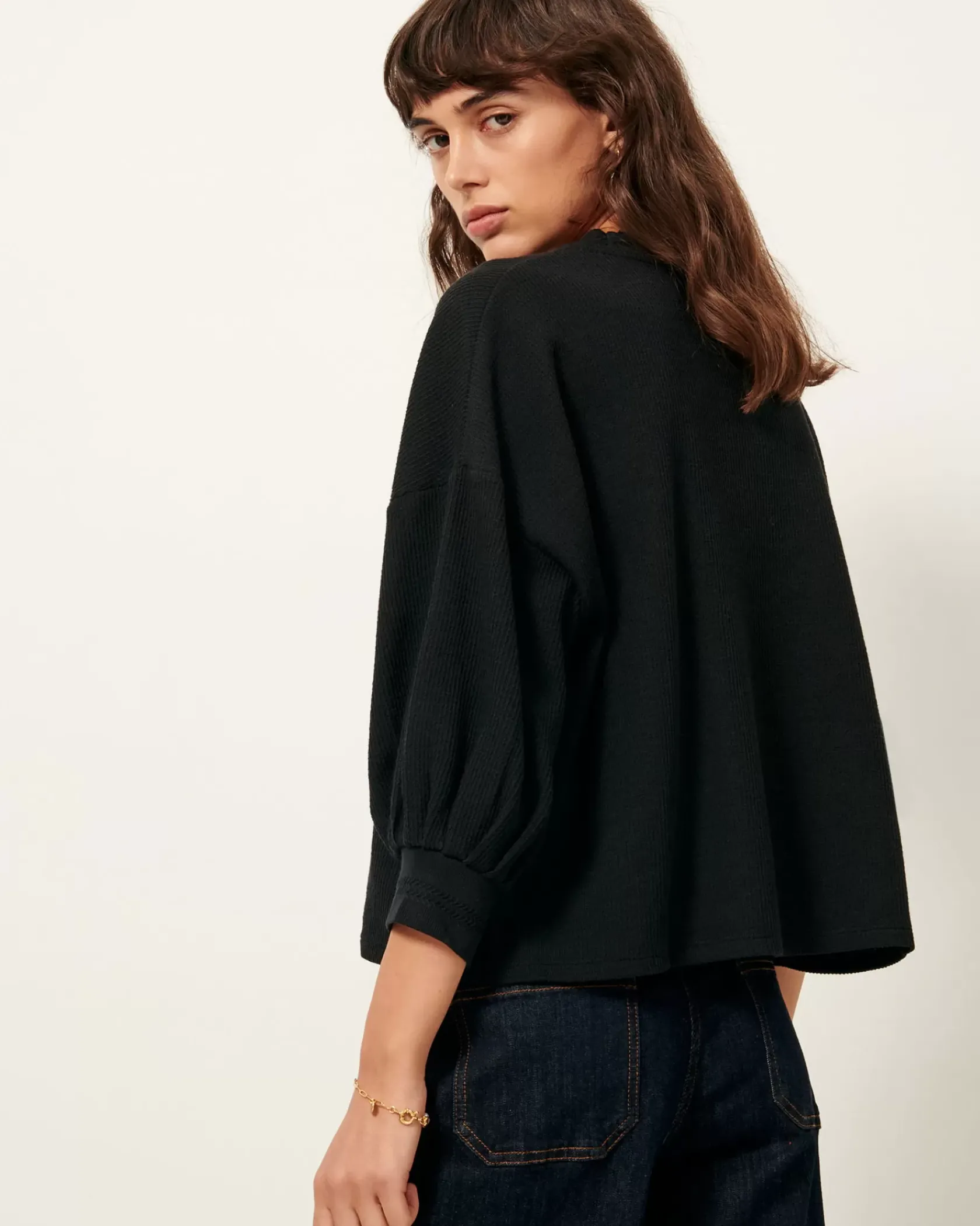 Sweat col montant en jersey lourd gaufré, effet nid d’abeille fantaisie.