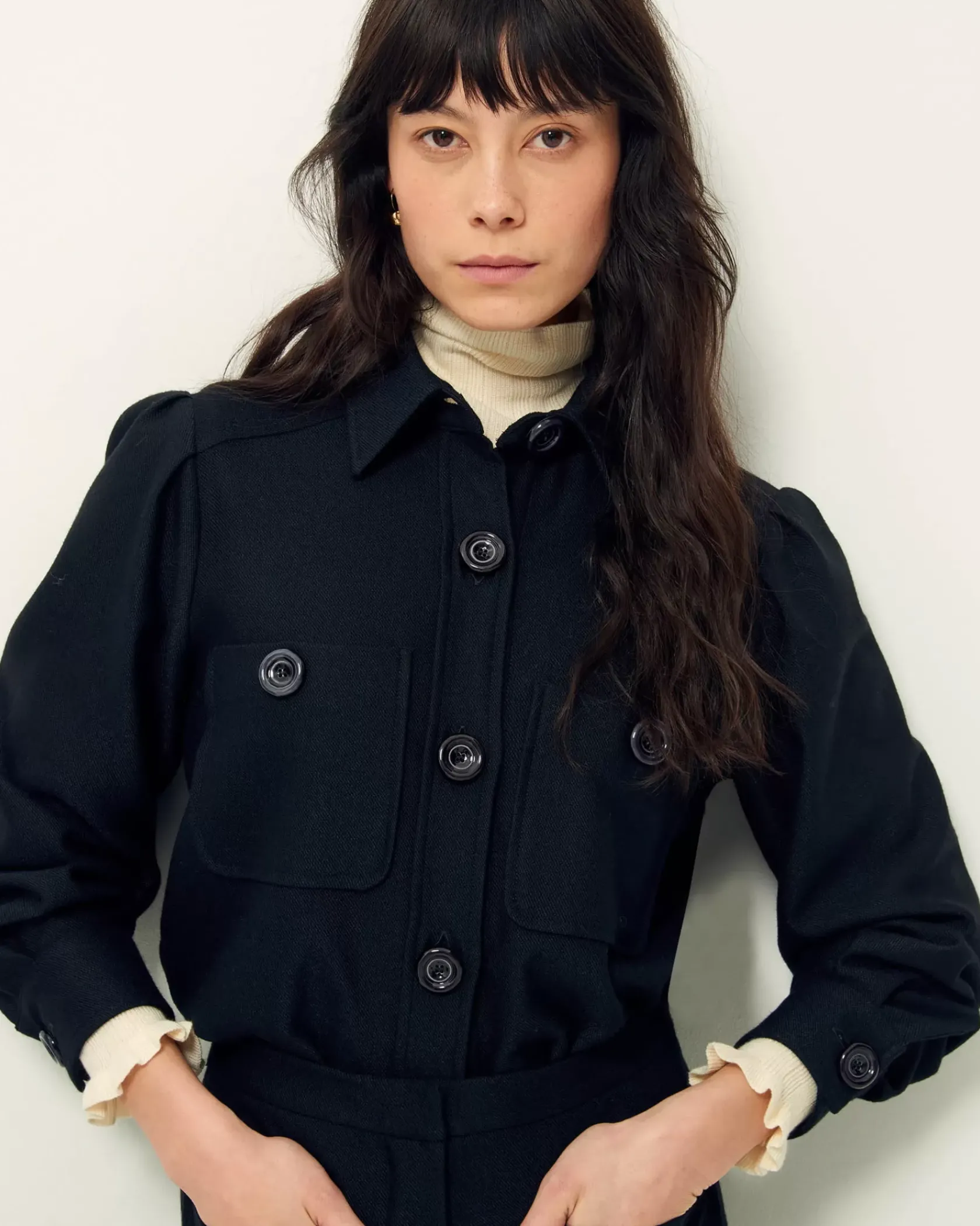 Chemise courte à poches plaquées et plis à l’épaule en tricotine fluide tissée au Portugal.
