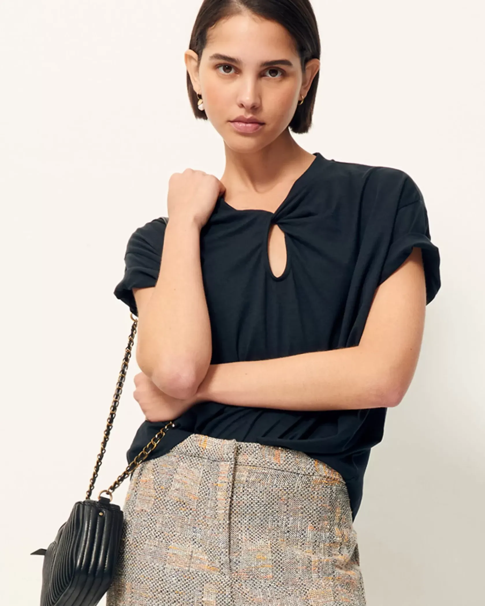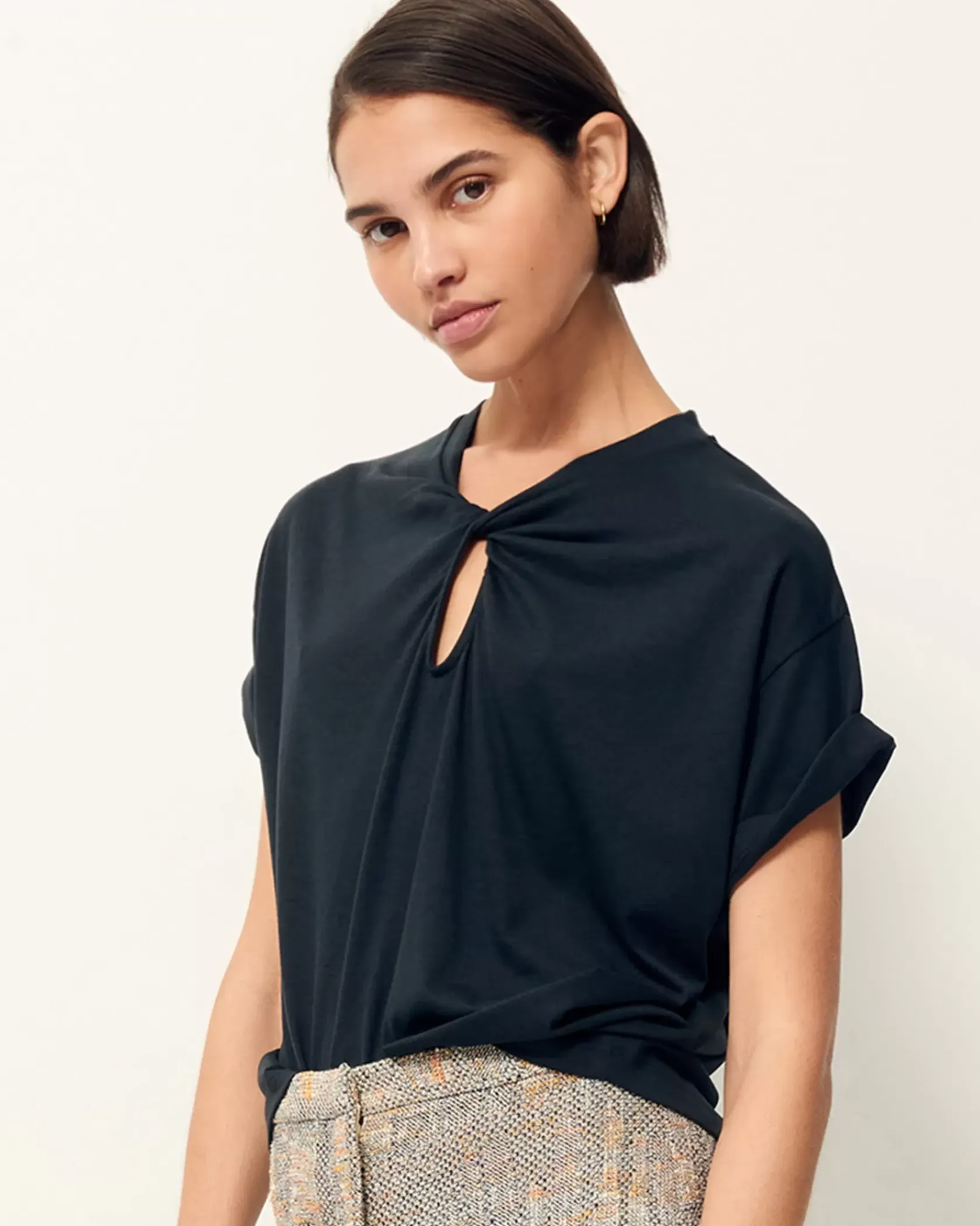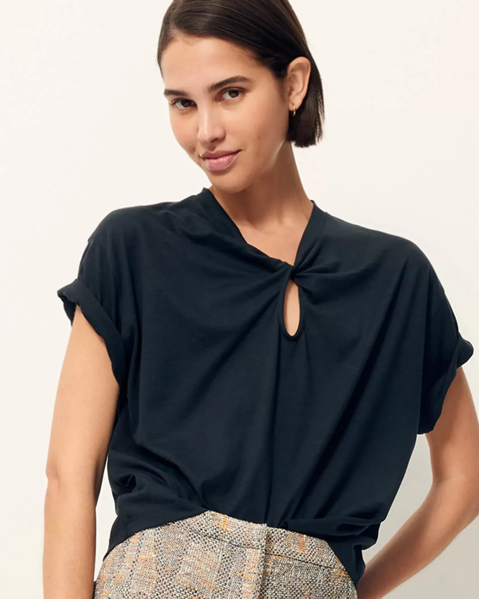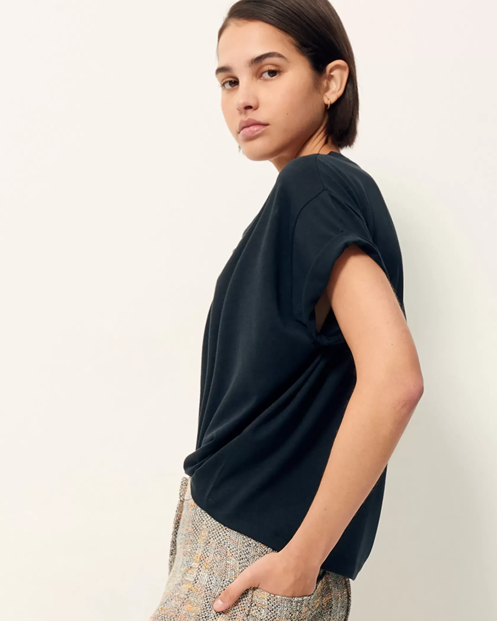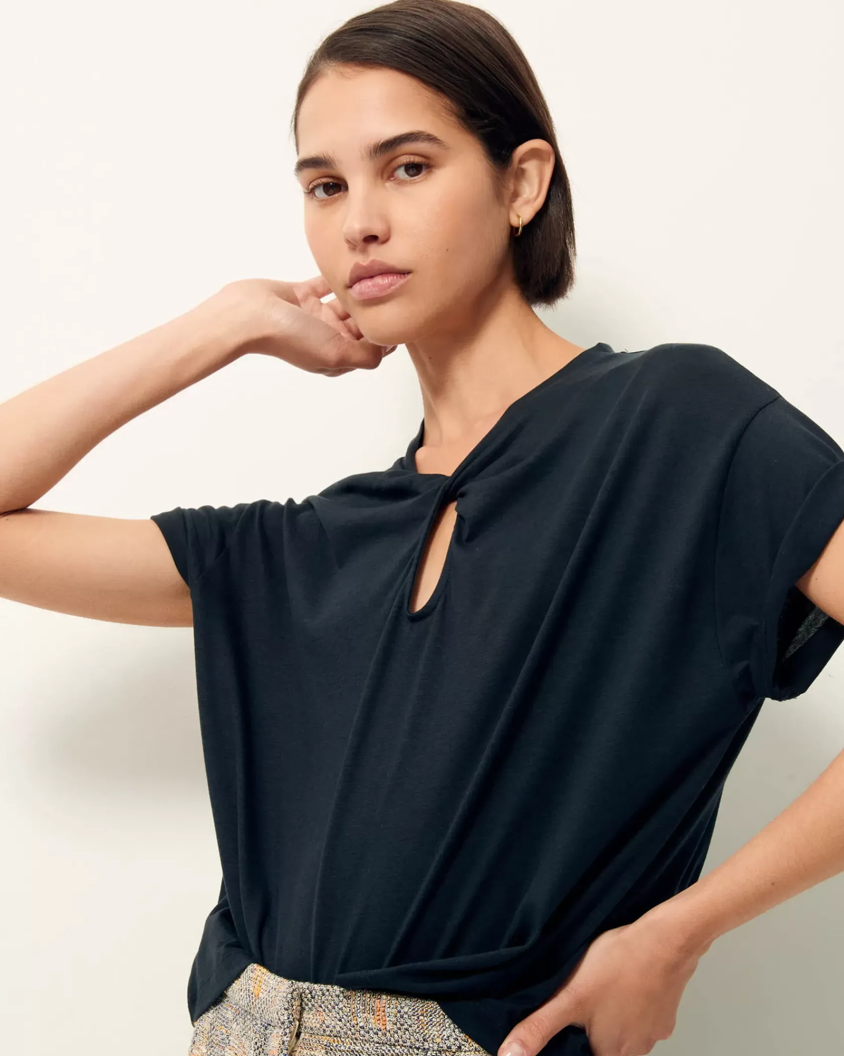 T-shirt ample à manches courtes en jersey fluide et goutte twistée sur l’encolure devant, confectionné au Portugal.