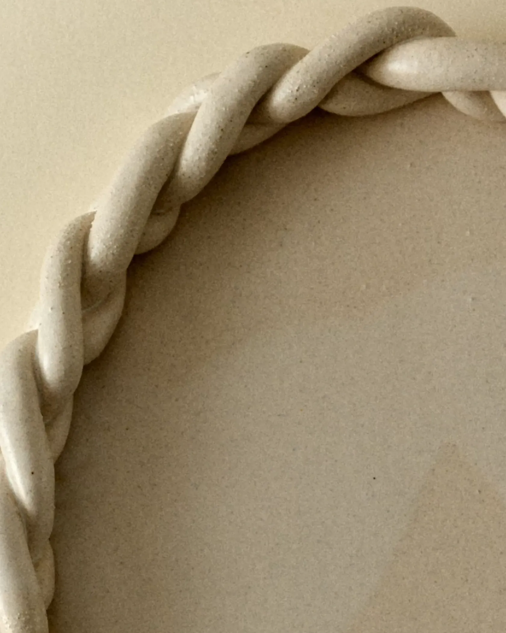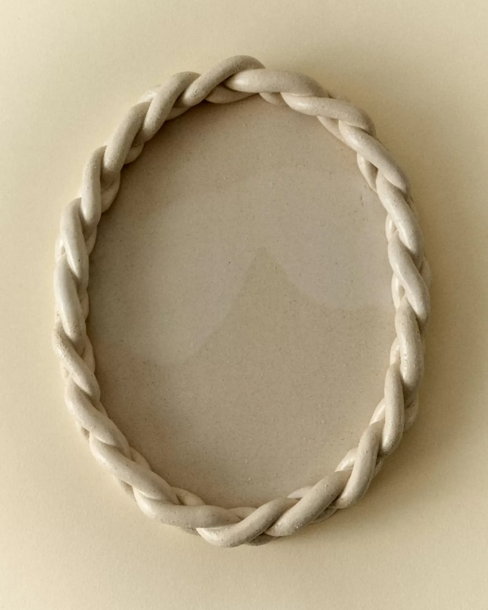 Plateau ovale tressé en grès blanc chamotté, émail blanc mat laiteux.