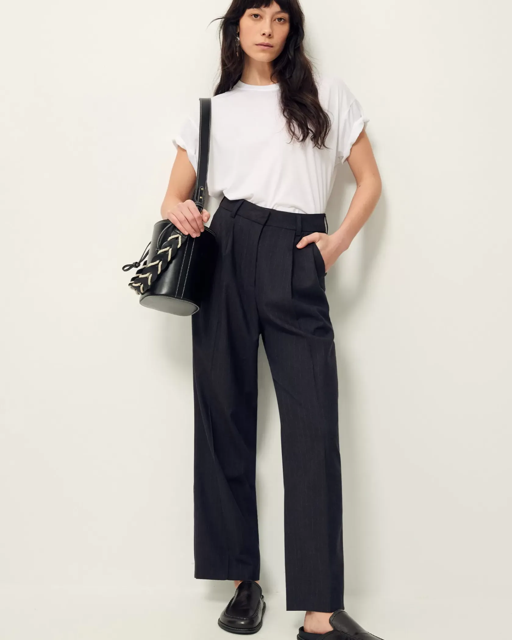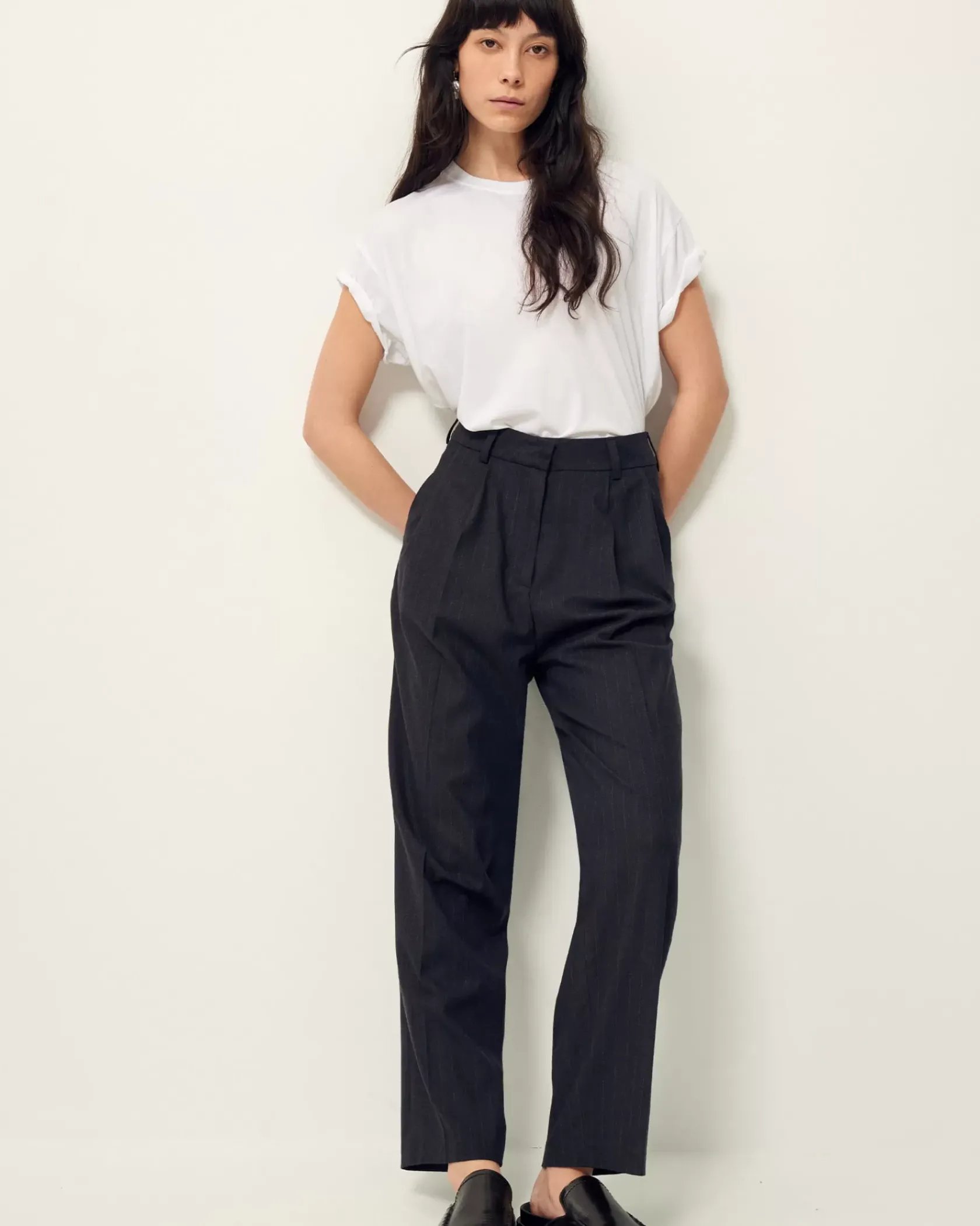 Pantalon de tailleur droit à plis couchés en flanelle à fines rayures tennis, tissée en Italie.