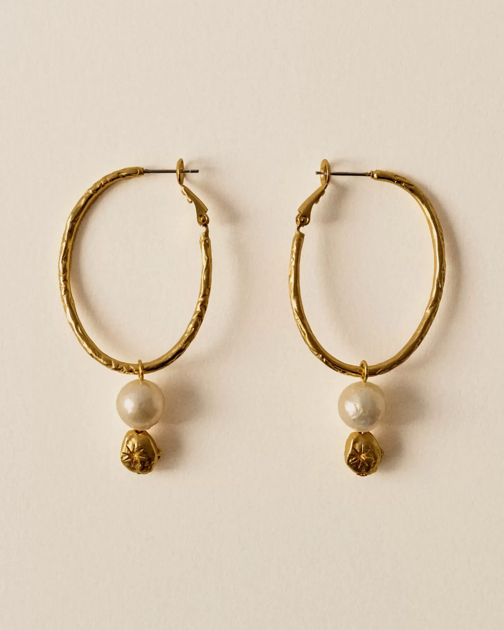 Boucles d’oreilles créole avec perle d’eau douce nacrée et perle dorée étoilée.