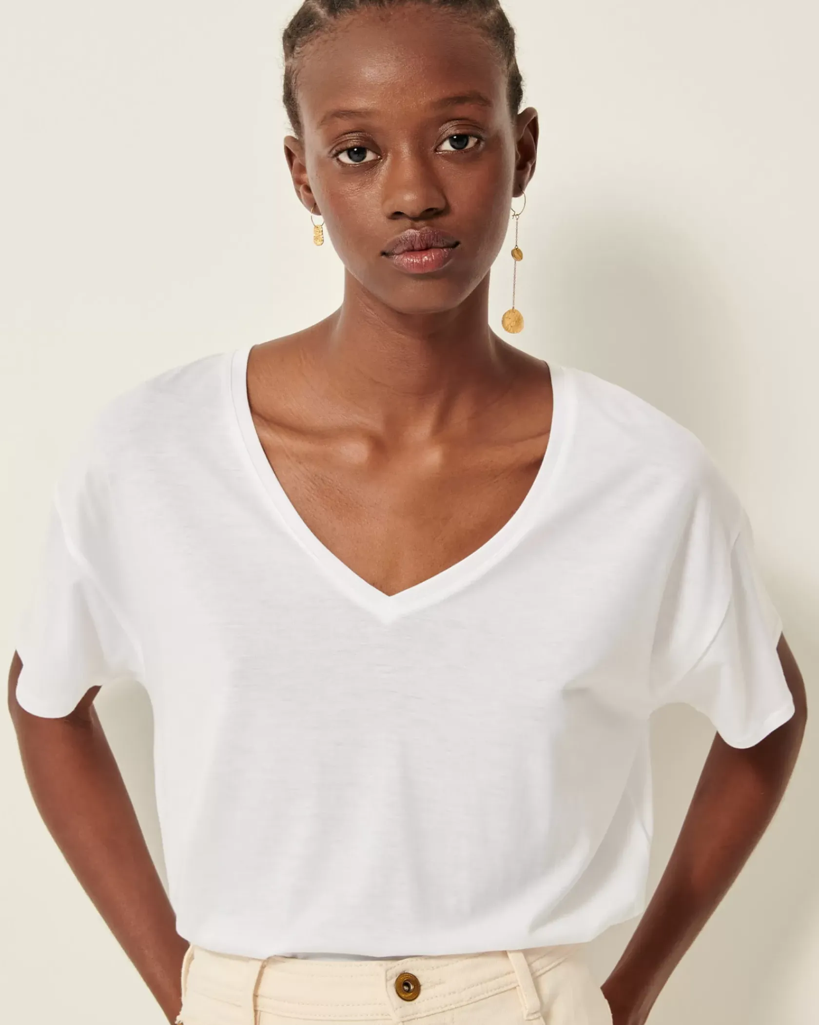 T-shirt large à décolleté en V et manches courtes en jersey fluide confectionné au Portugal.