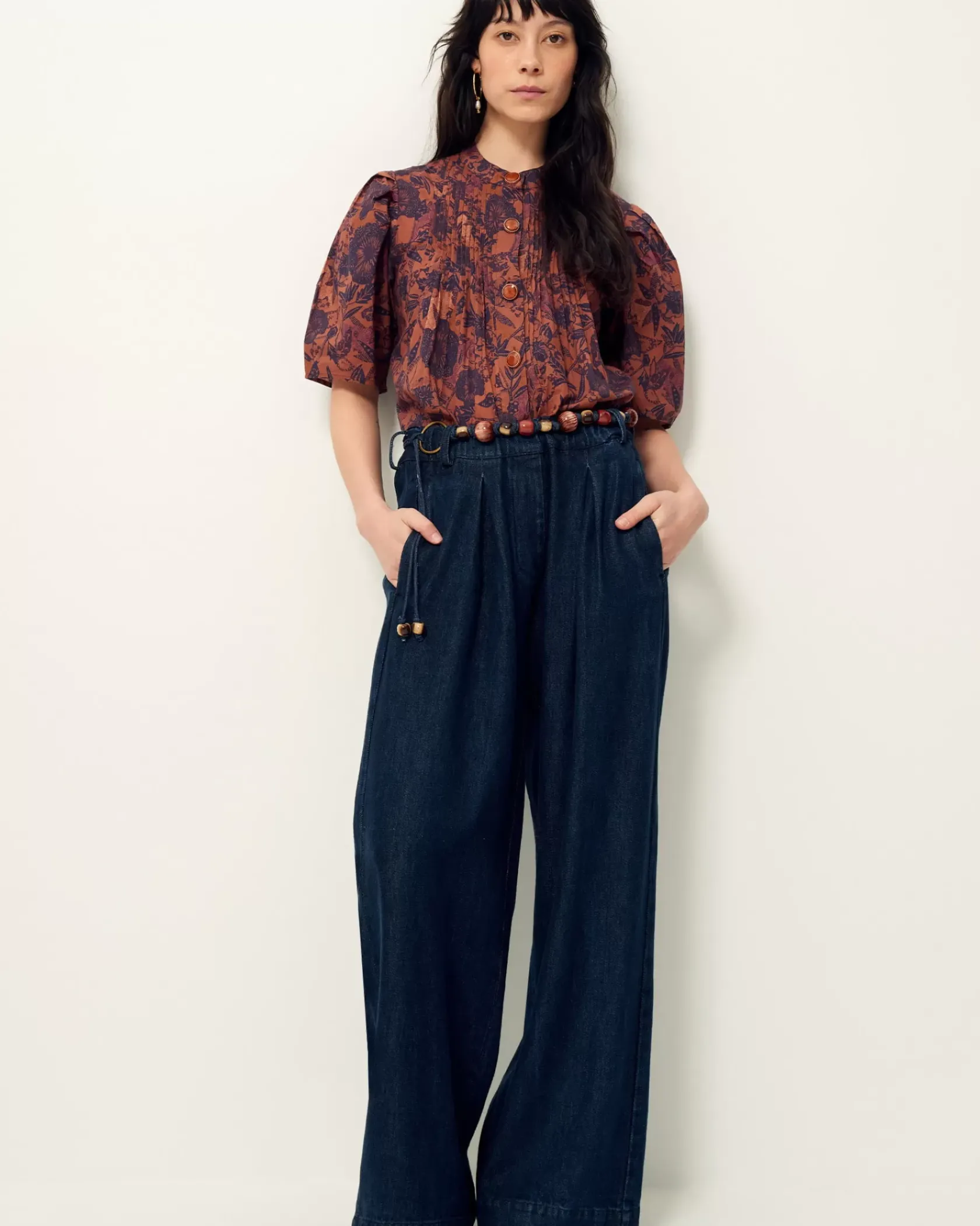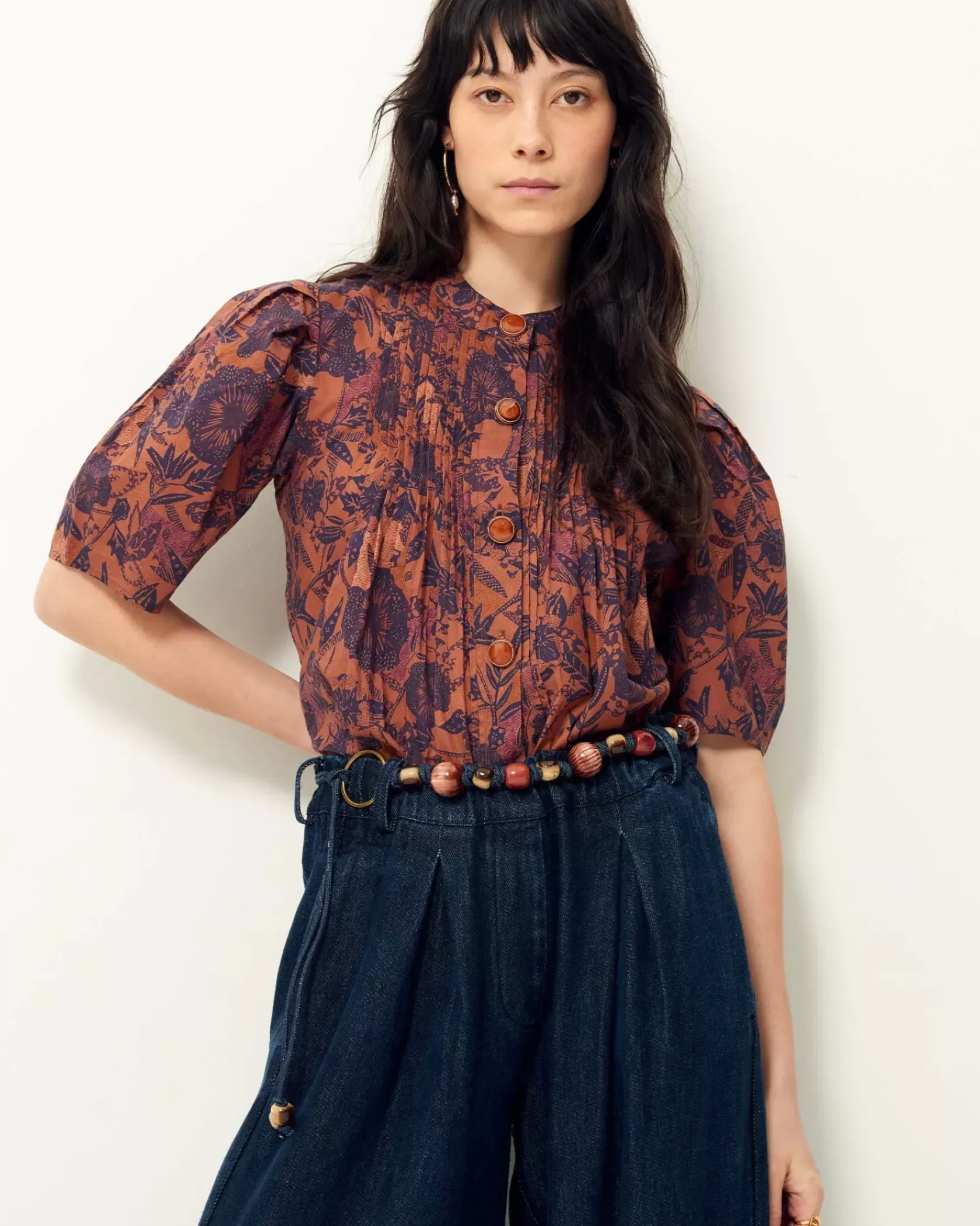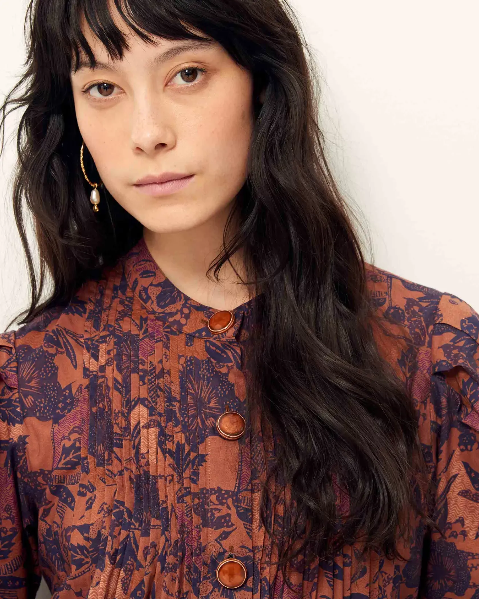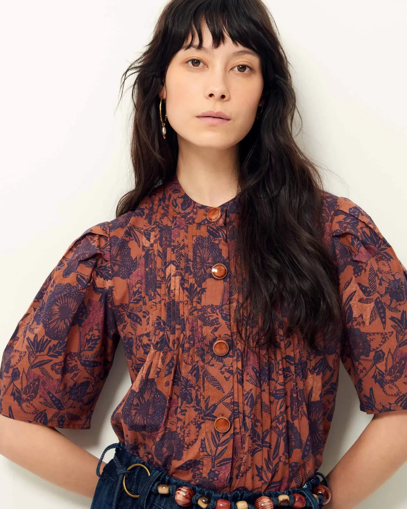 Chemisier à col montant et détails de mini plis surpiqués en batiste de coton imprimée esprit « block print », motif exclusif Sessùn.
