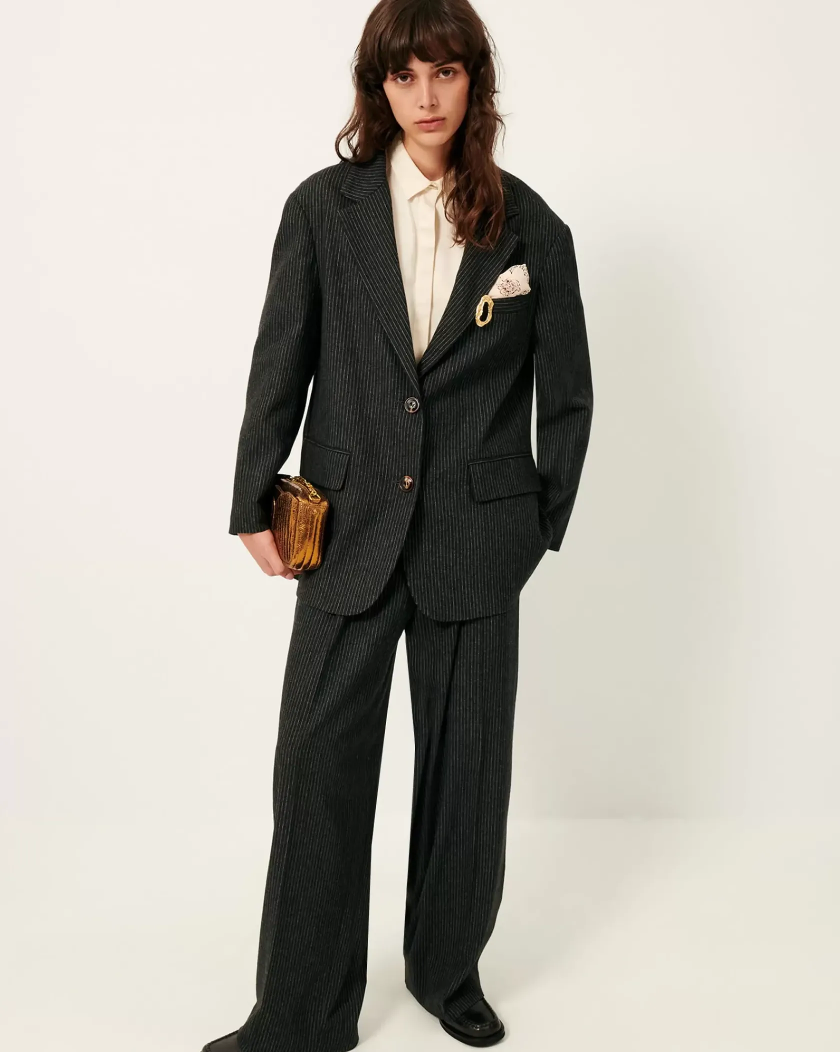 Veste de costume oversize en flanelle marengo à rayures tennis tissée en Italie.