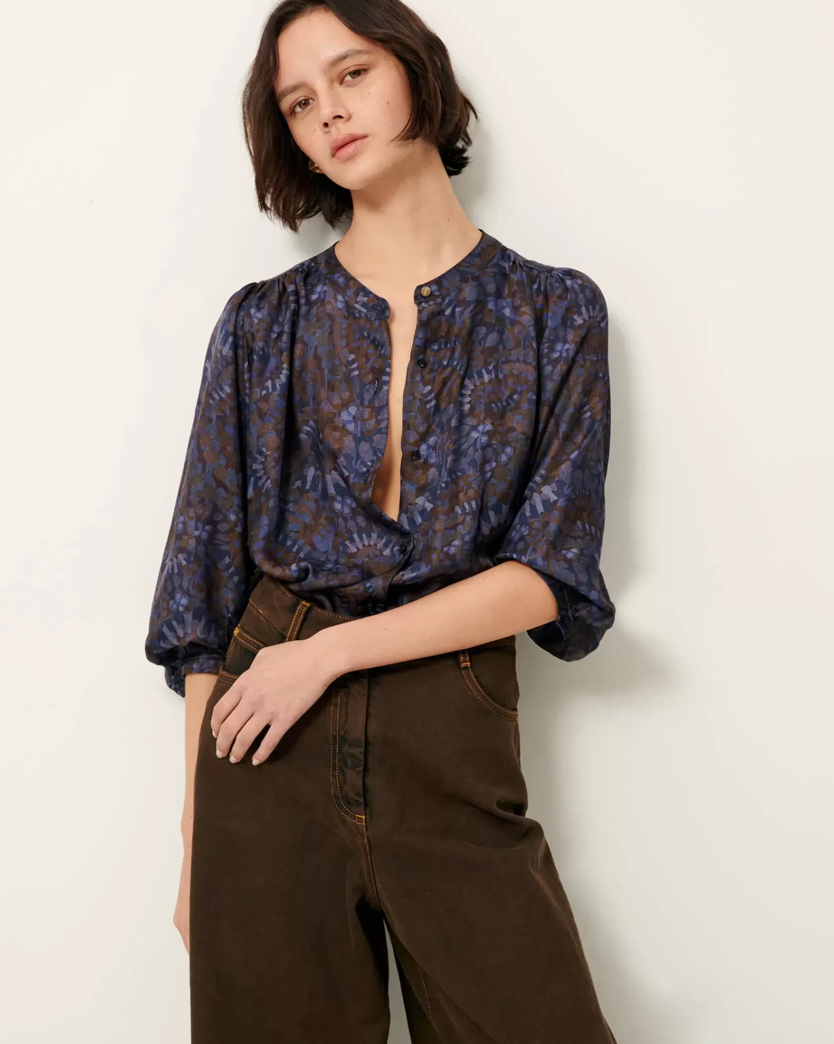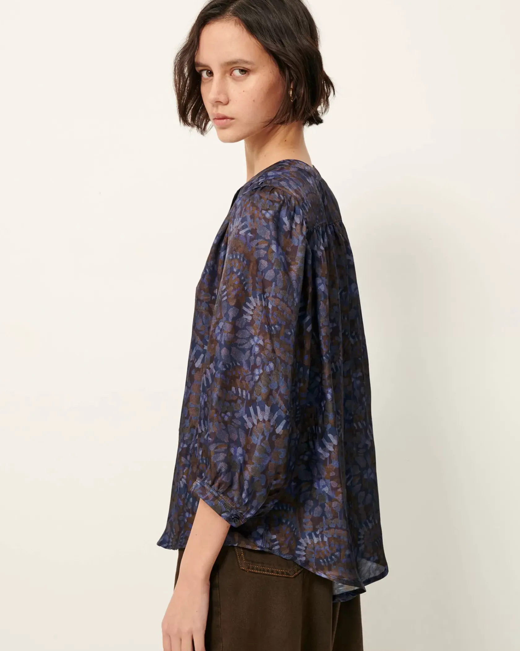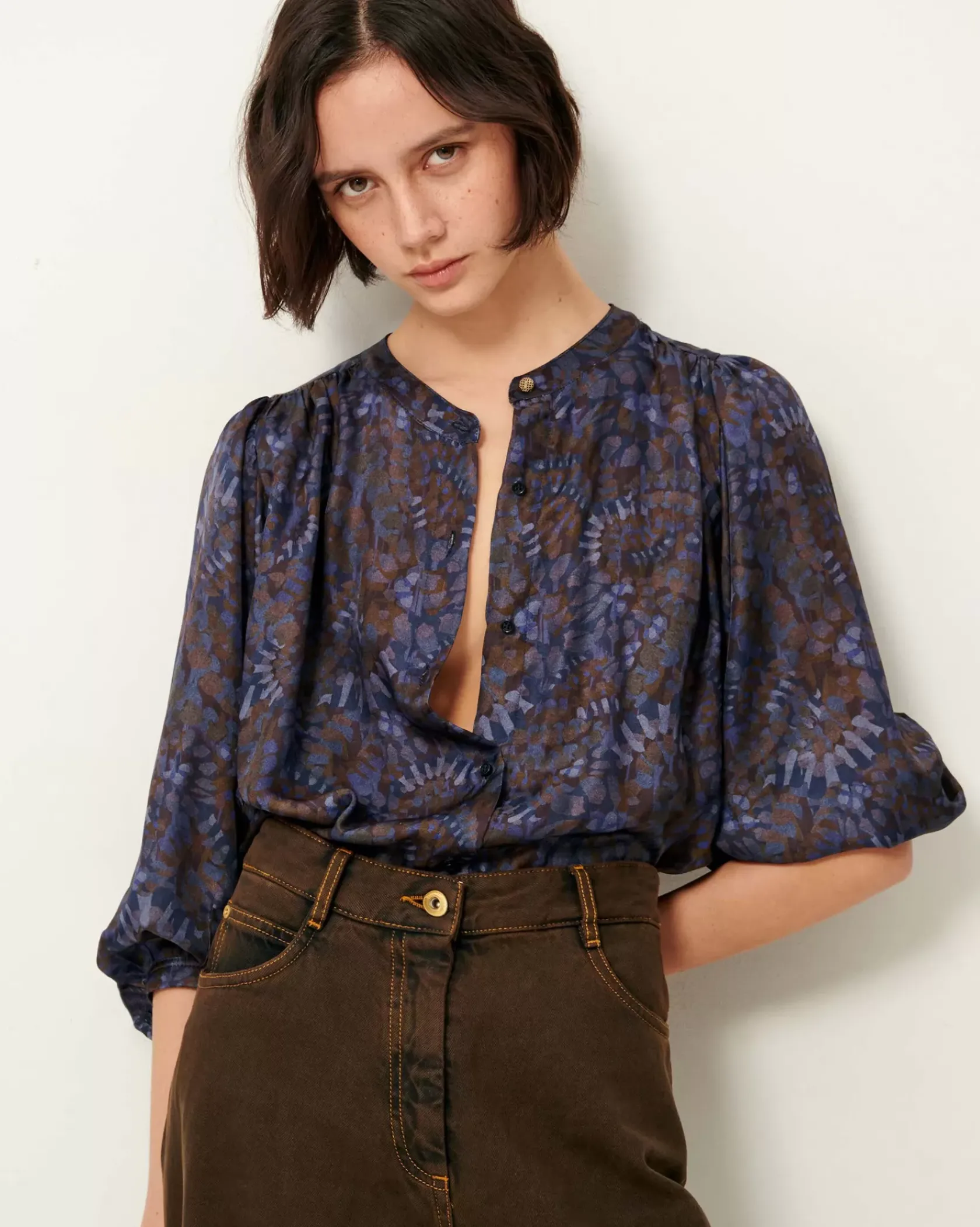 Blouse à manches ballon 3/4 en satin de viscose fluide imprimé, motif exclusif Sessùn, apprêté en Italie.