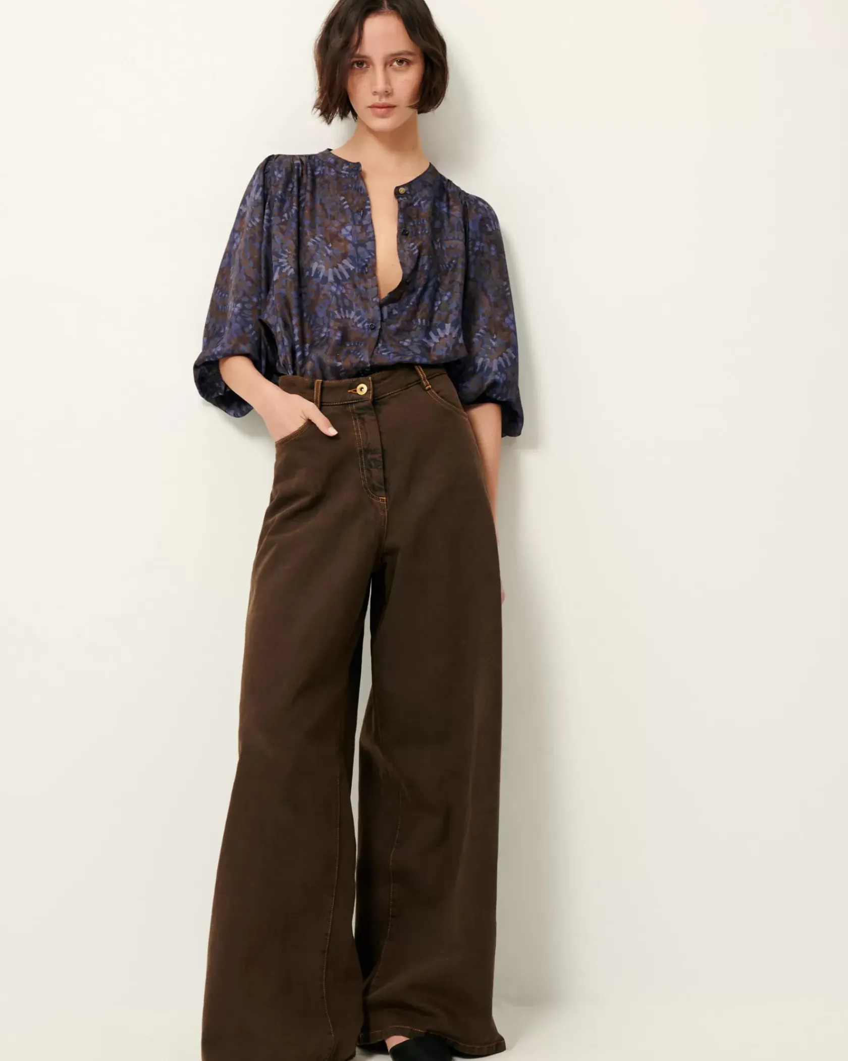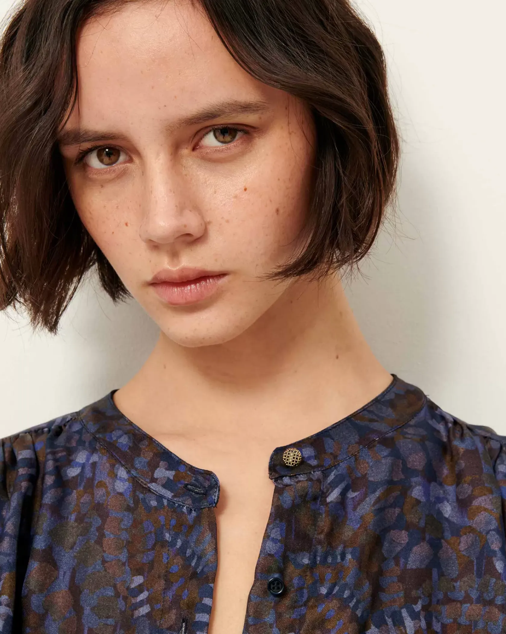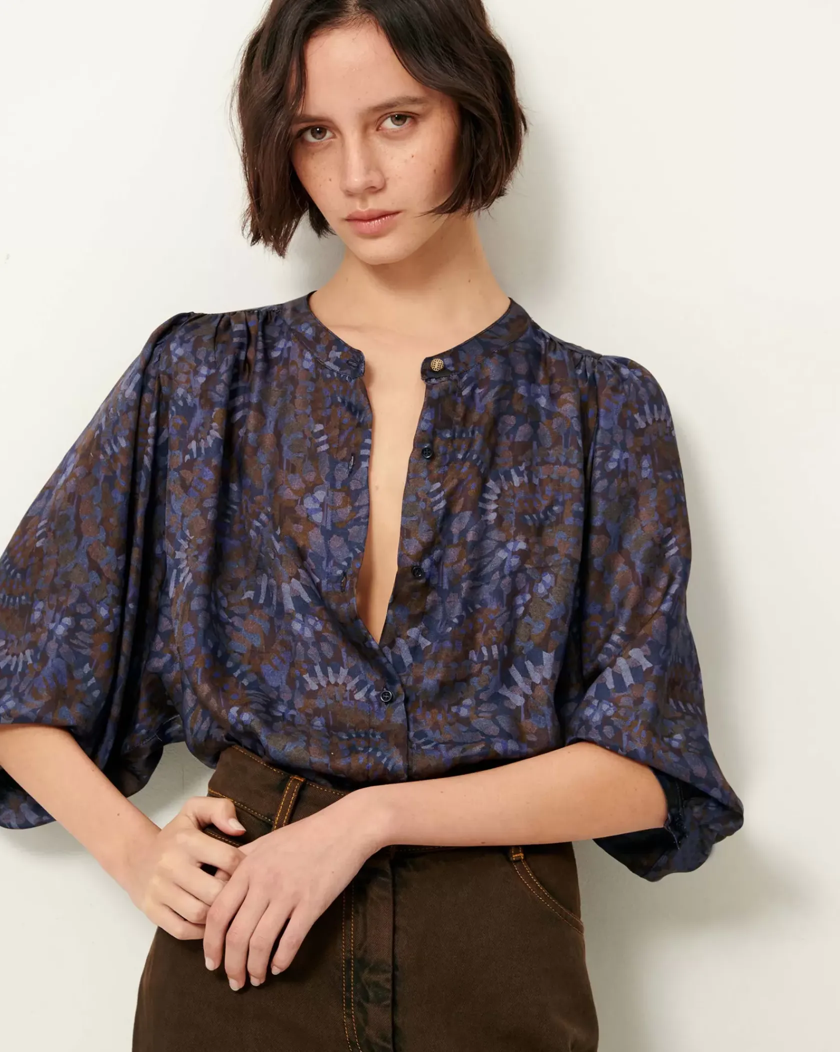 Blouse à manches ballon 3/4 en satin de viscose fluide imprimé, motif exclusif Sessùn, apprêté en Italie.