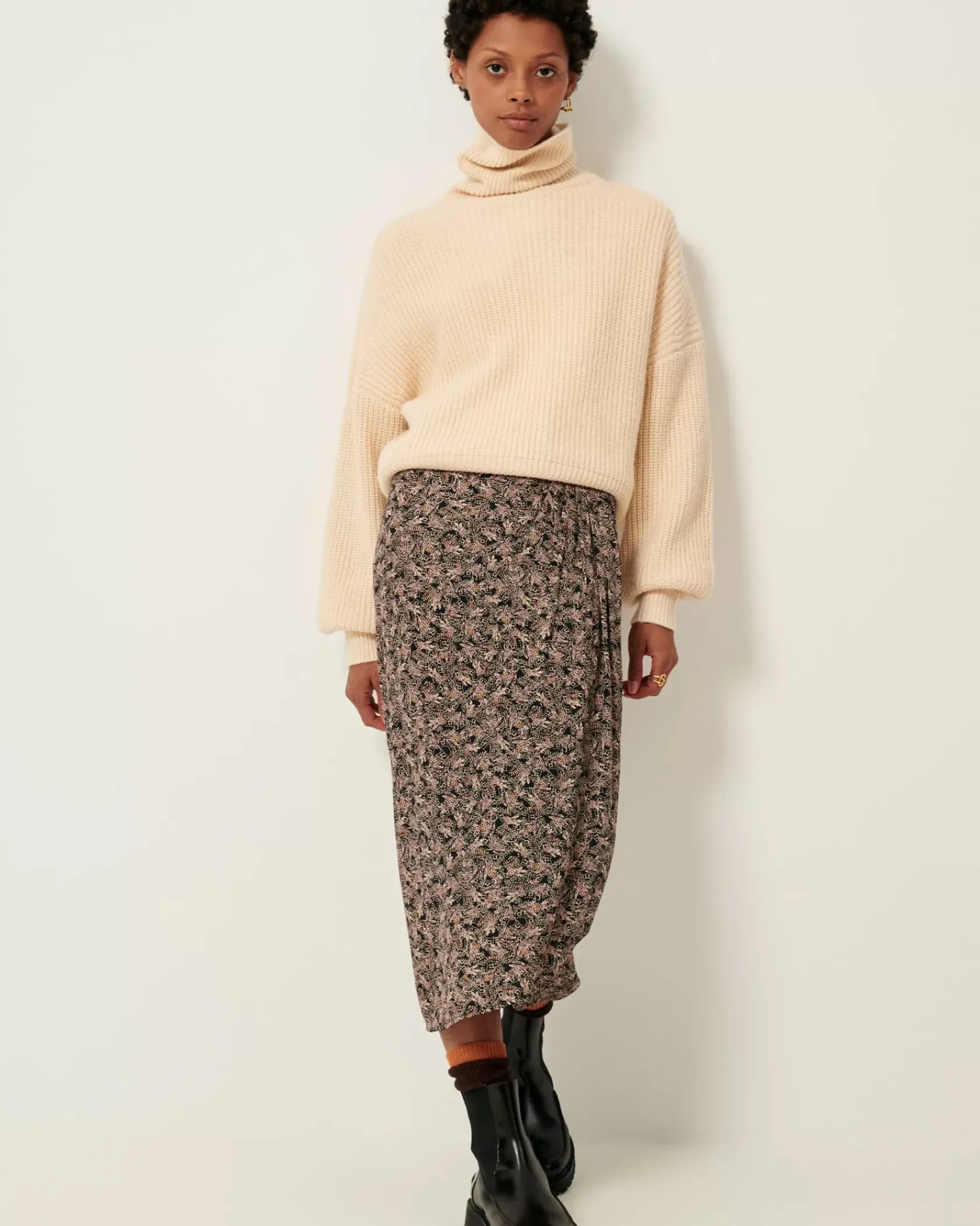 Jupe portefeuille à plis couchés à la taille, mi-longue en toile de viscose fluide et aérienne imprimée, motif exclusif Sessùn.