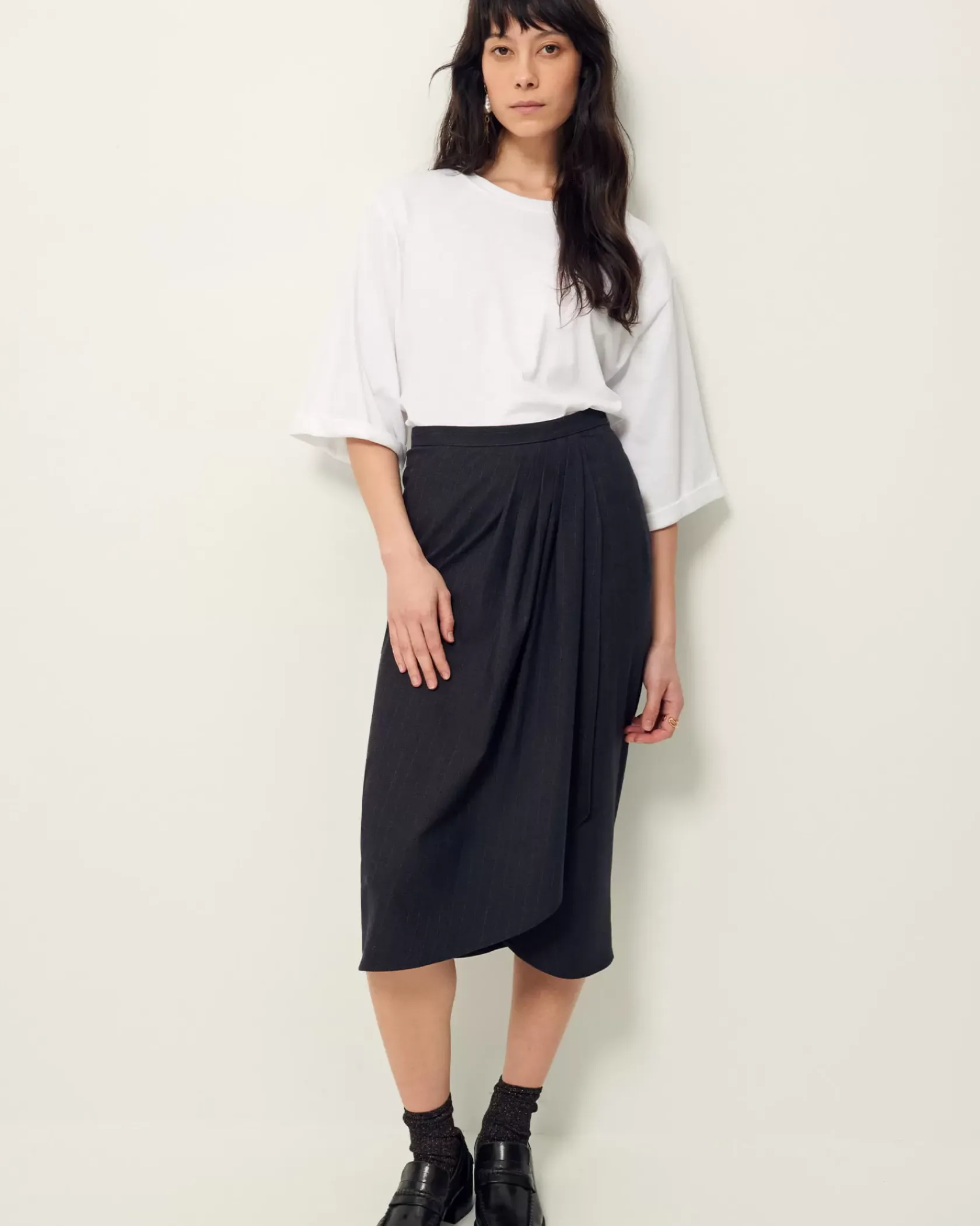 Jupe portefeuille à plis couchés à la taille, mi-longue en flanelle chinée à fines rayures tennis, tissée en Italie.