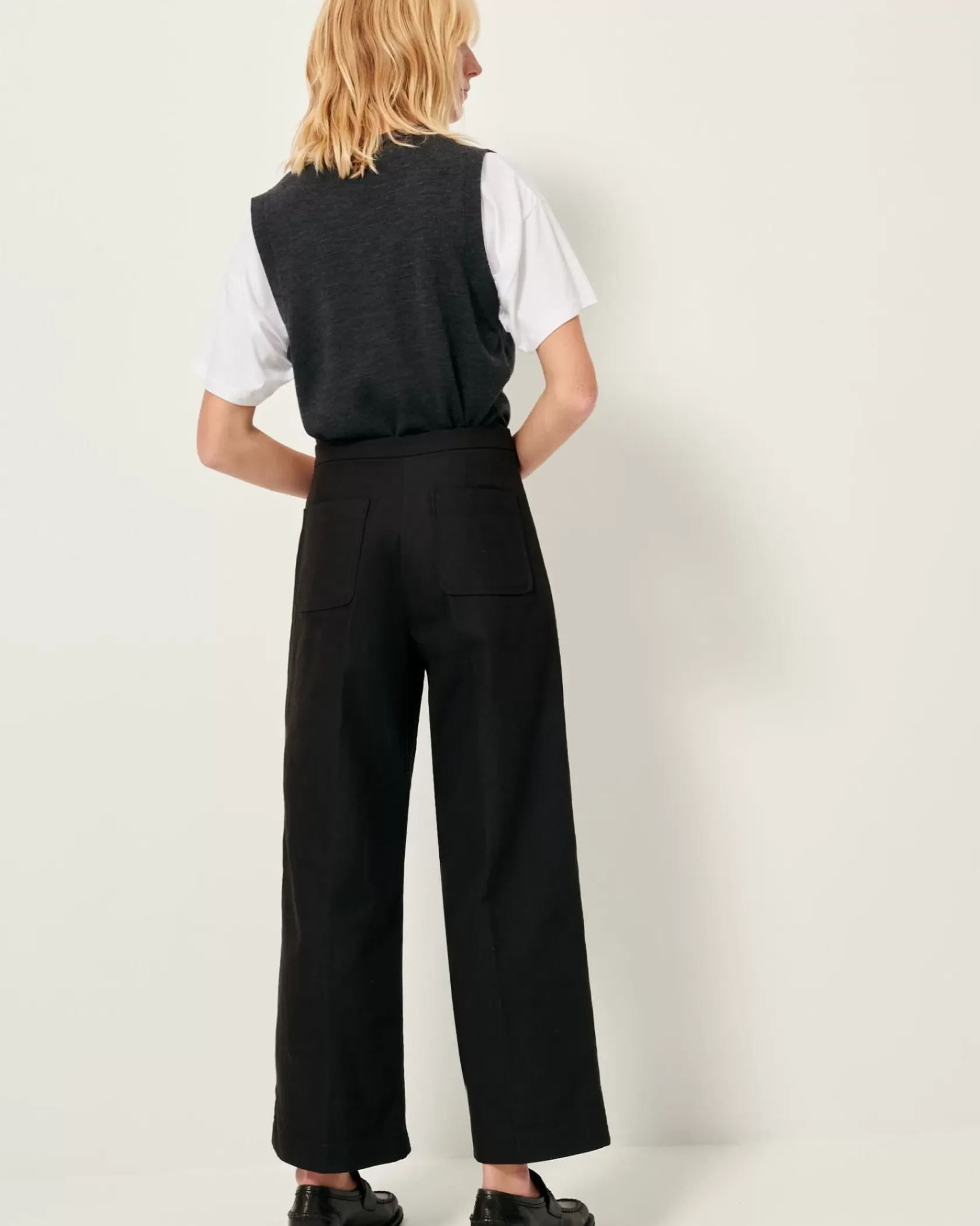 Pantalon droit à plis marqués en gabardine à armure fantaisie, lavée et émerisée.