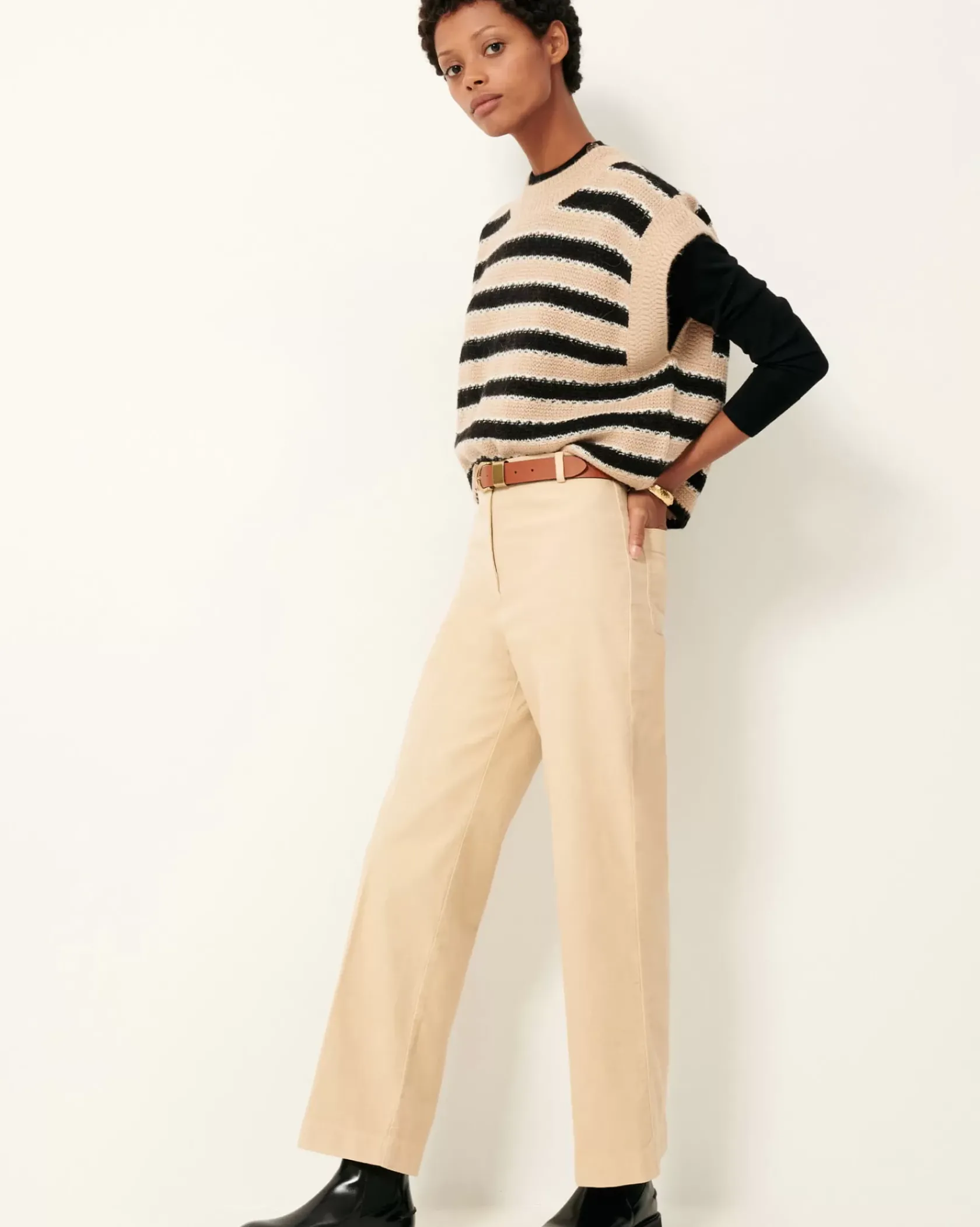 Pantalon droit à plis marqués en gabardine grattée, finition velvet, teint en plongée.
