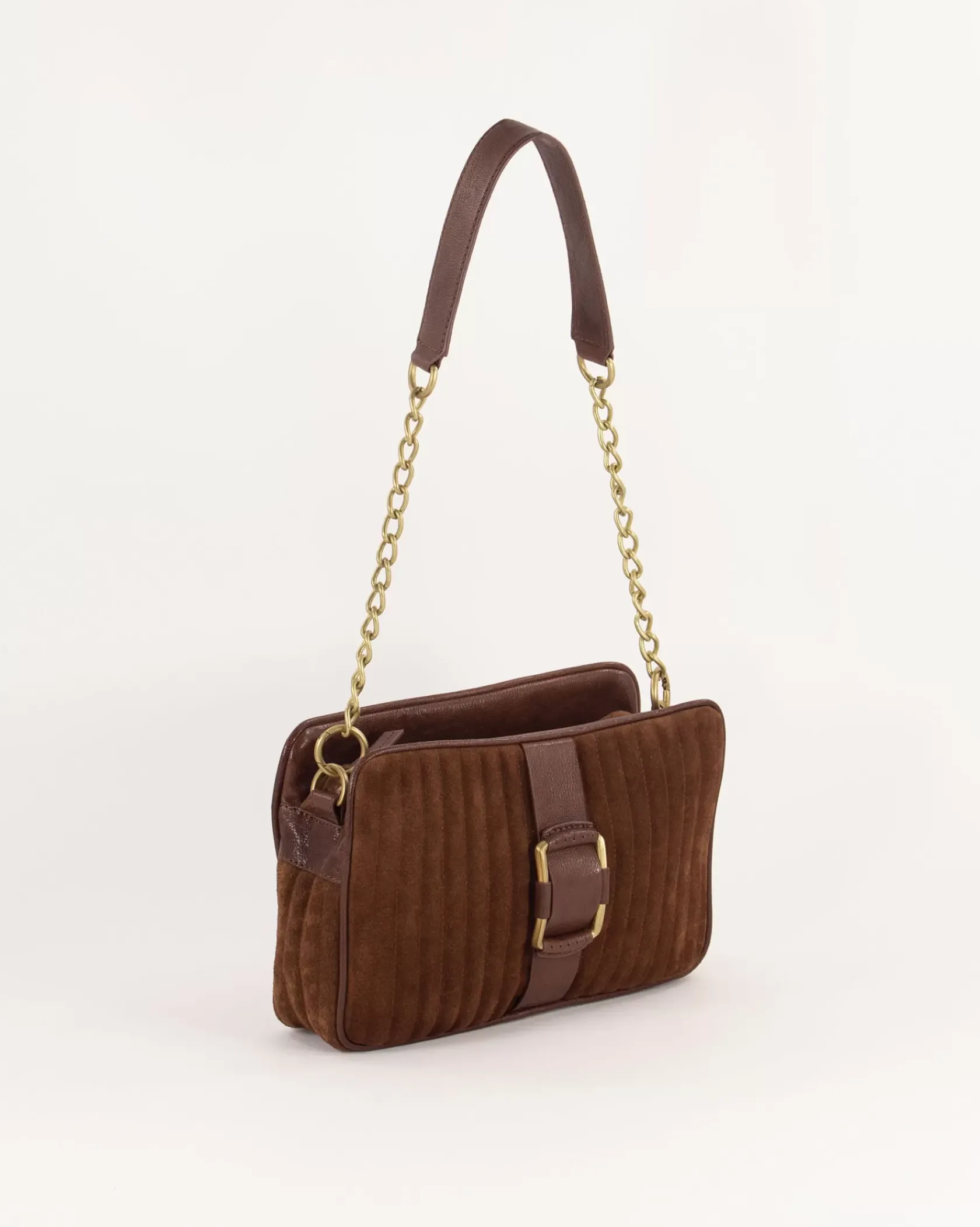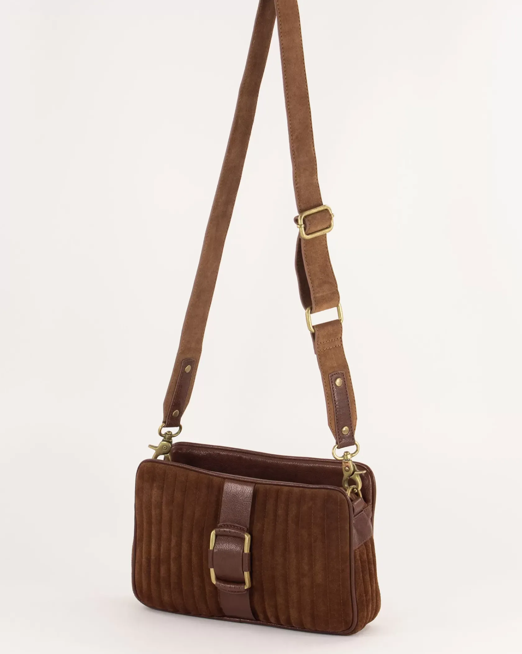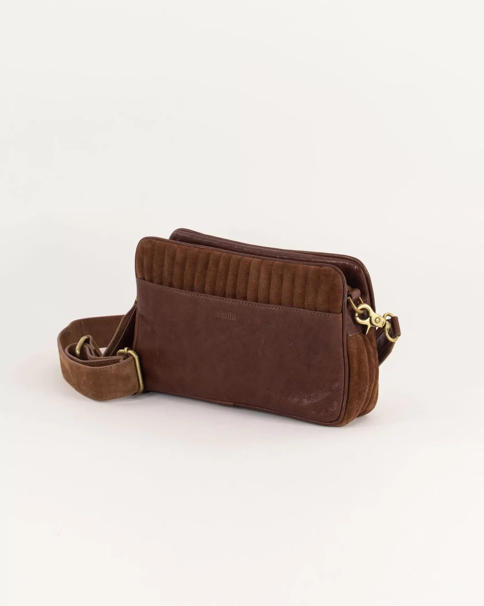 Sac en cuir de vache suédé matelassée et détails en cuir de chèvre.