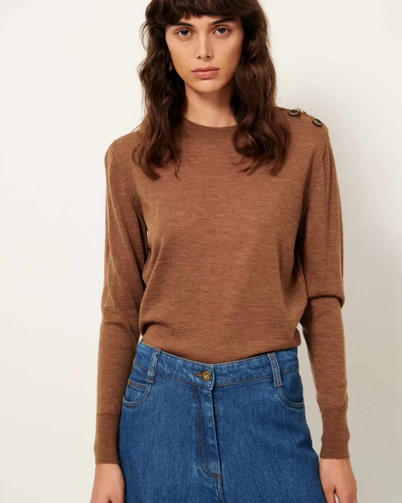 Pull ajusté à patte épaule boutonnée en maille fine jauge mérinos, point jersey.