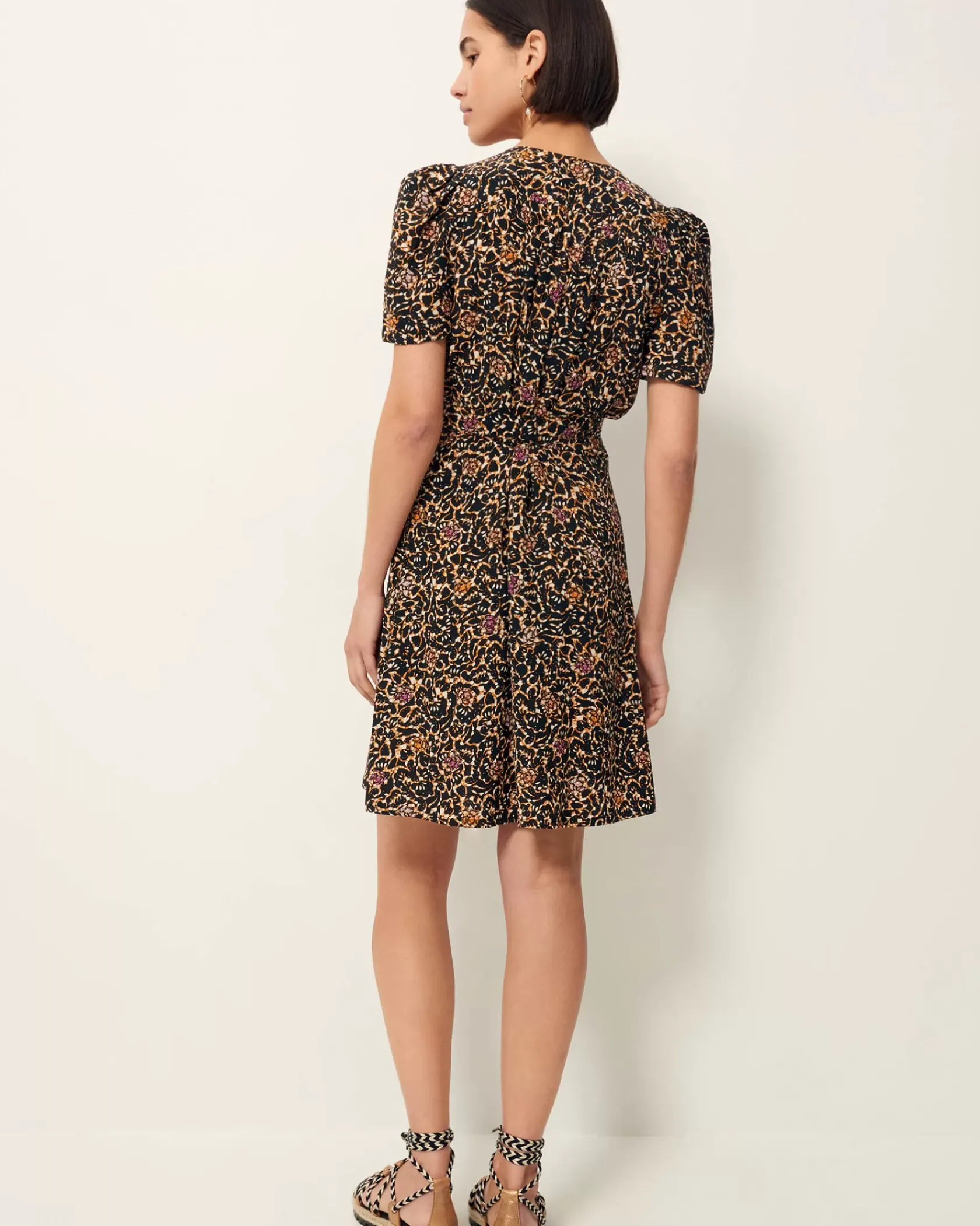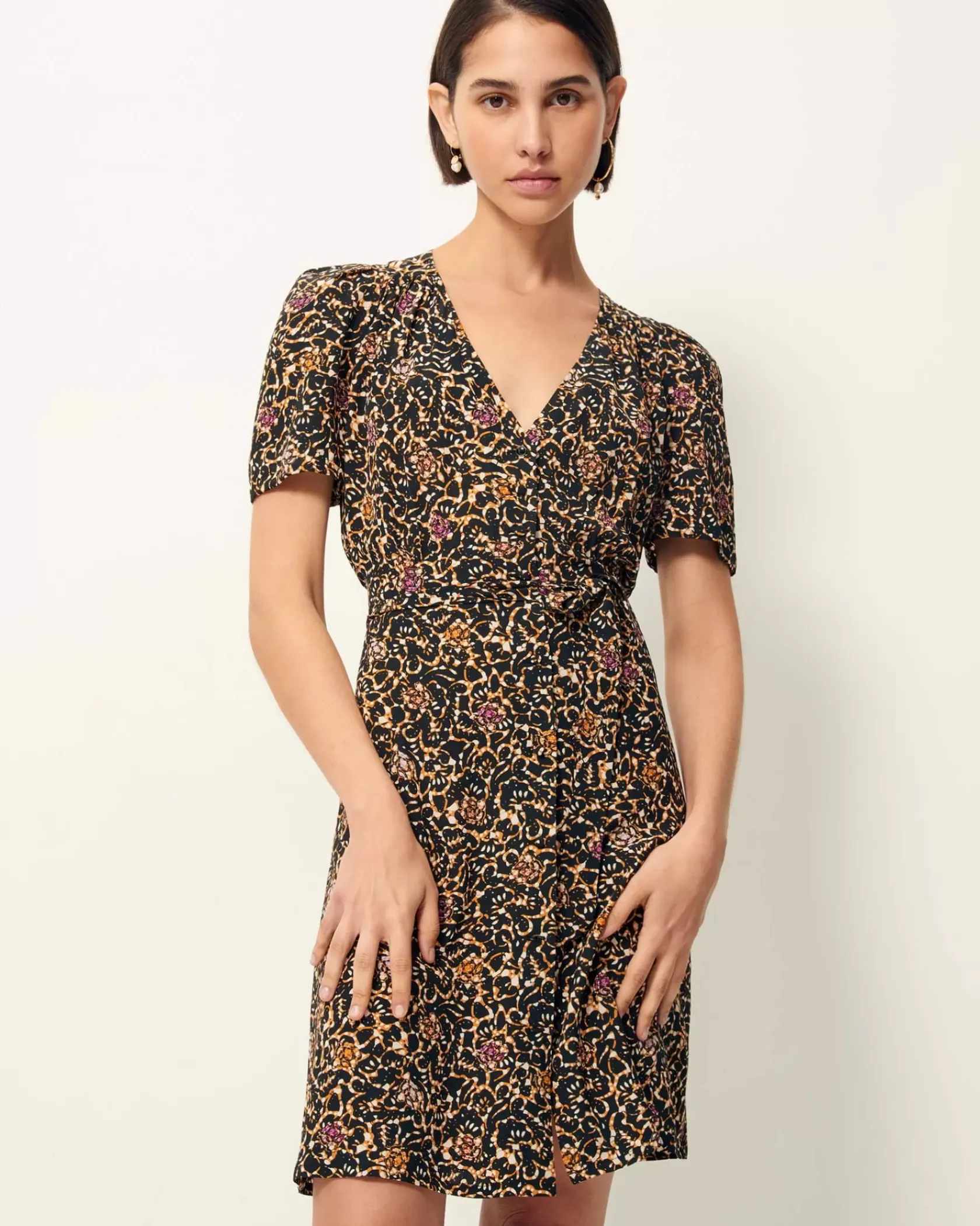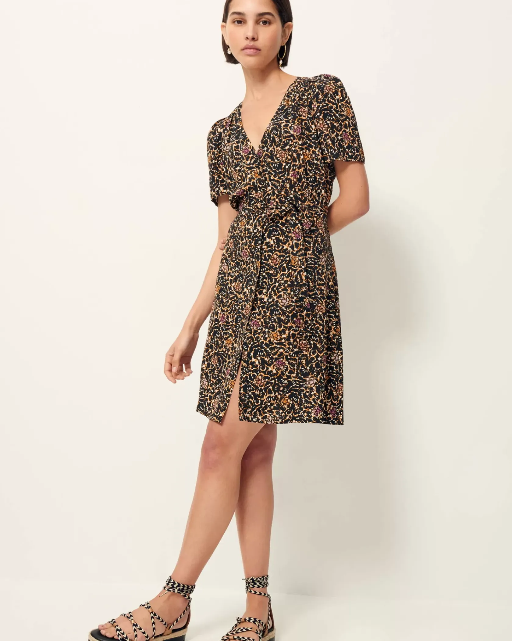Robe courte boutonnée en toile de viscose fluide et aérienne imprimée, motif exclusif Sessùn.