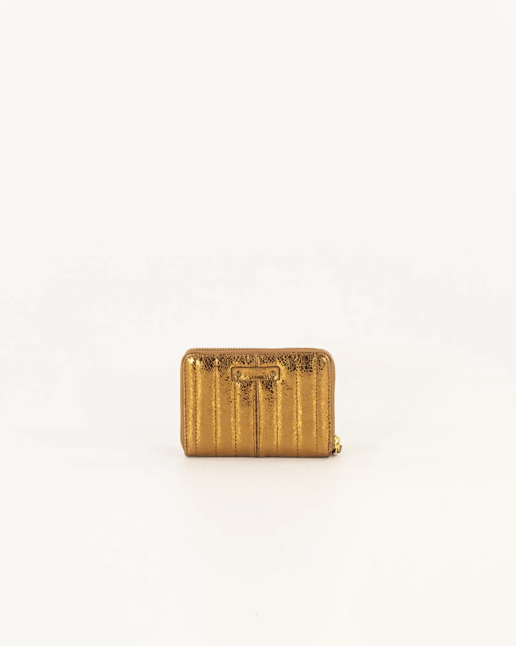 Portefeuille compact zippé en cuir de chèvre suédé métallisé matelassé et surpiqué.