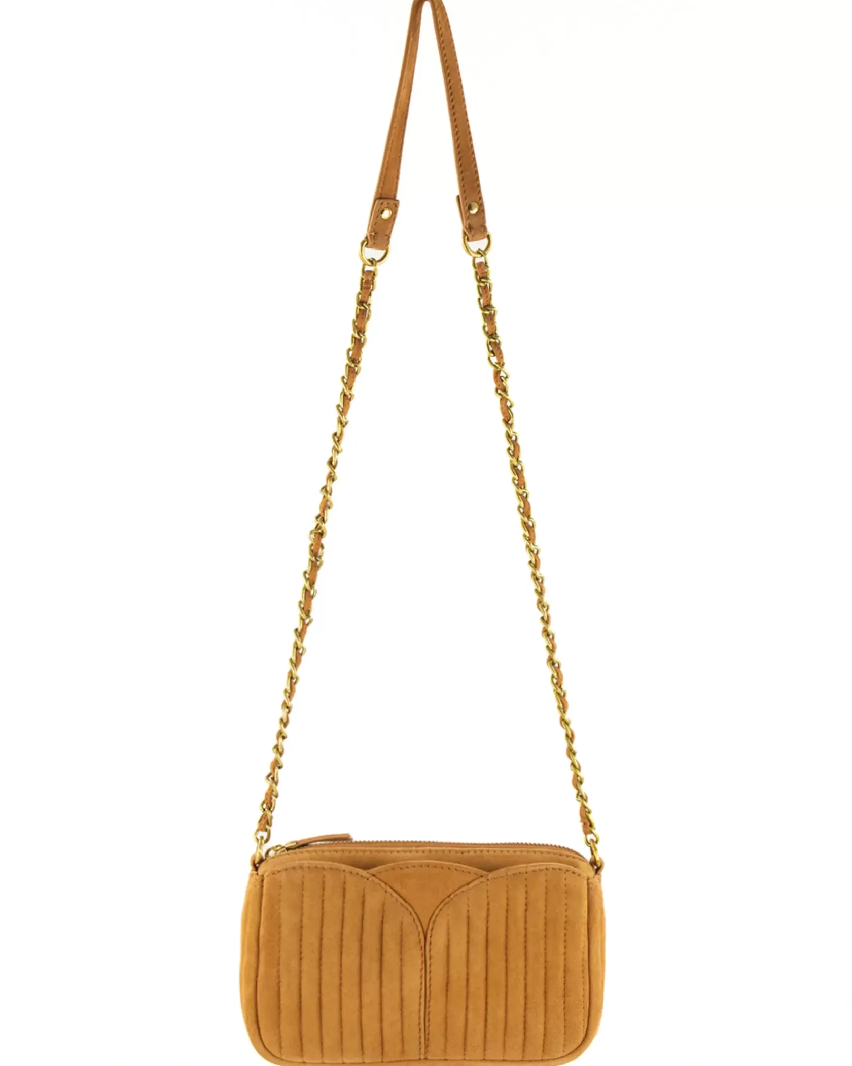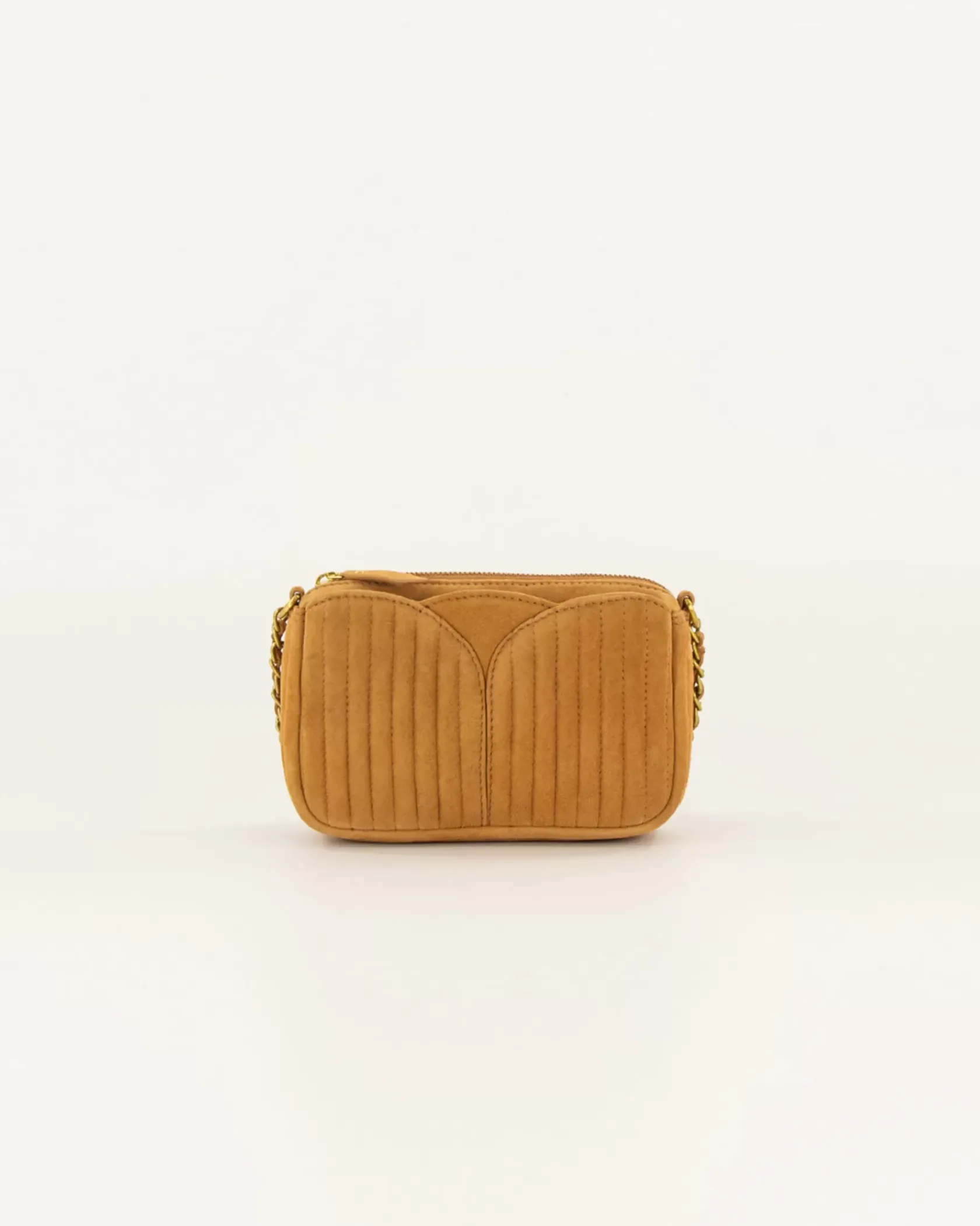 Petit sac en cuir de chèvre suédé métallisé, matelassé surpiqué avec anse chaine bijou.