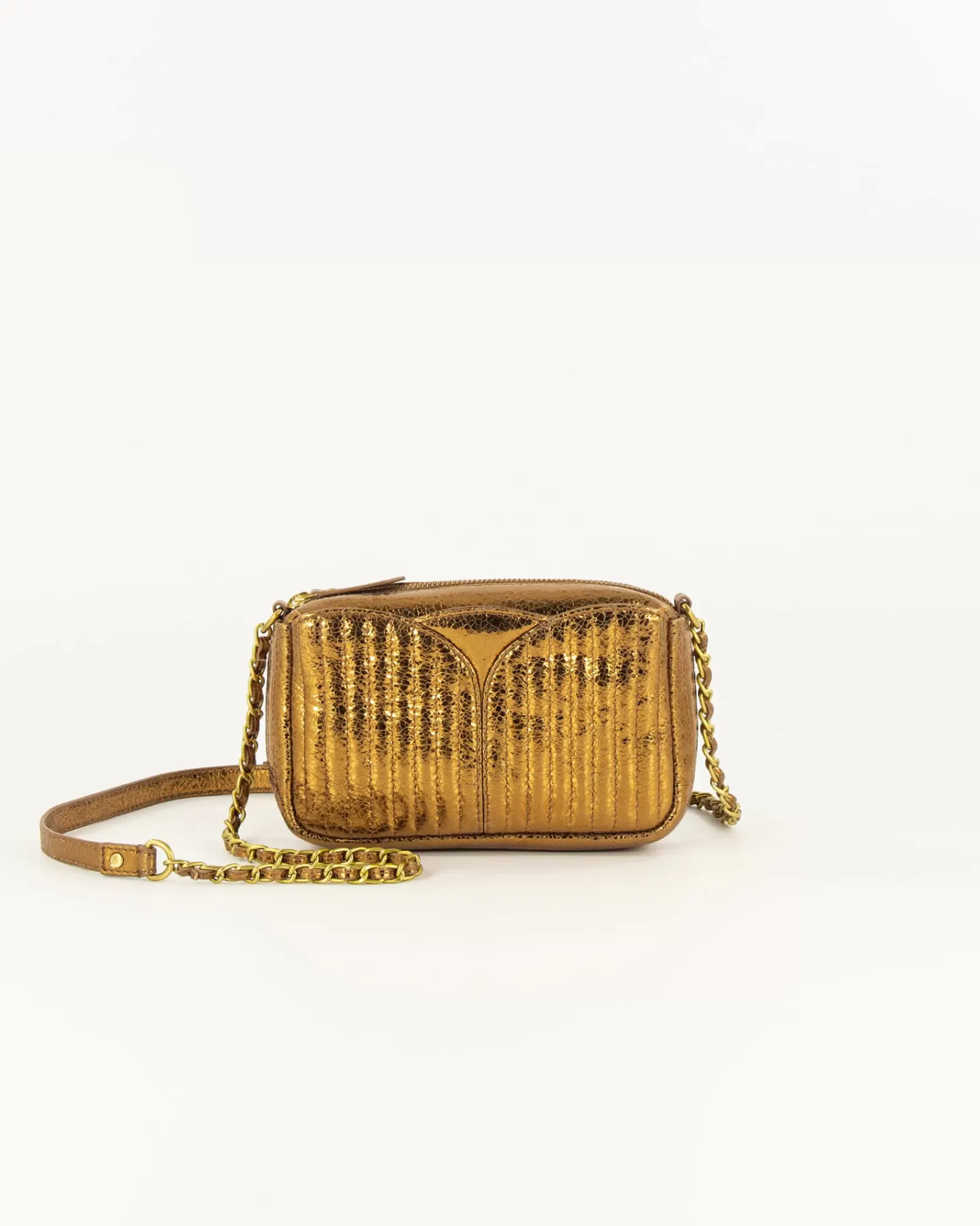 Petit sac en cuir de chèvre suédé métallisé, matelassé surpiqué avec anse chaine bijou.