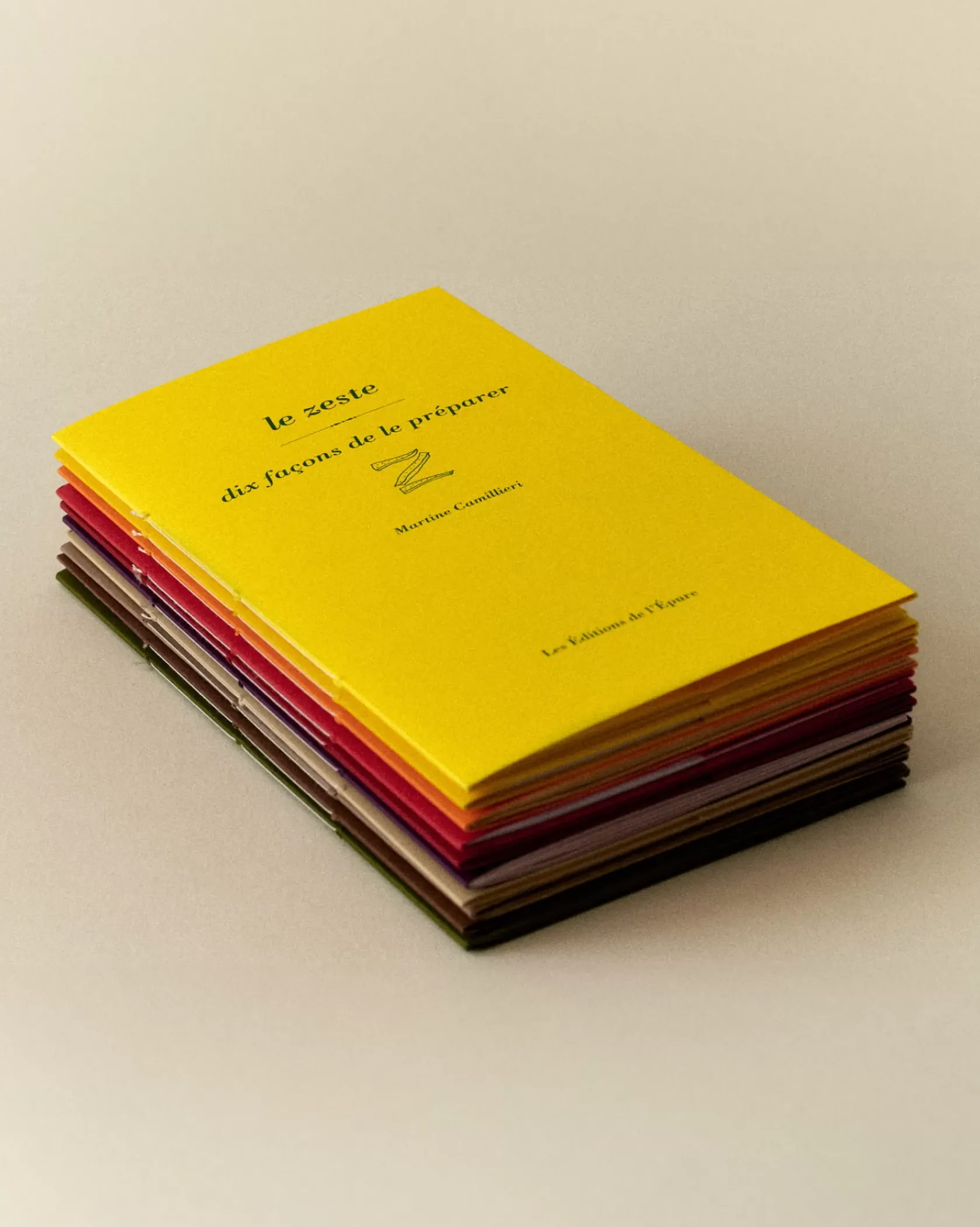 De la pomme de terre à l’huître, en passant par le thon, la courgette ou le chocolat, chacun des livrets de cette collection expose en 24 pages dix façons originales d’agrémenter un même aliment, préalablement présenté dans une courte préface. Le choix des papiers, ingres à la forme, vergé, Velin, stone… la composition typographique, ainsi que la reliure fil de lin en font une édition originale de grande qualité.