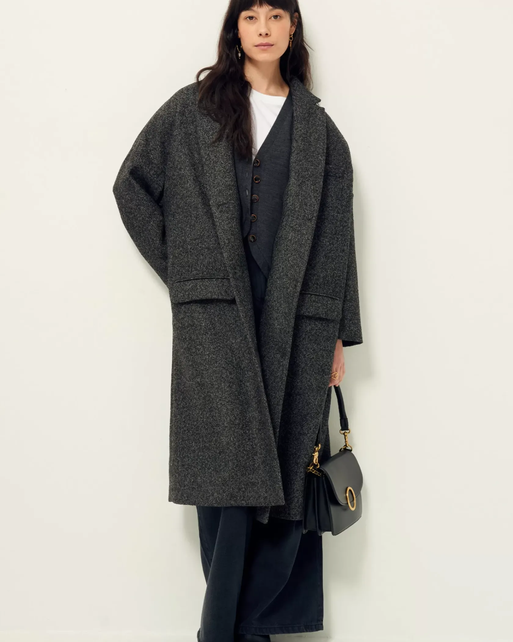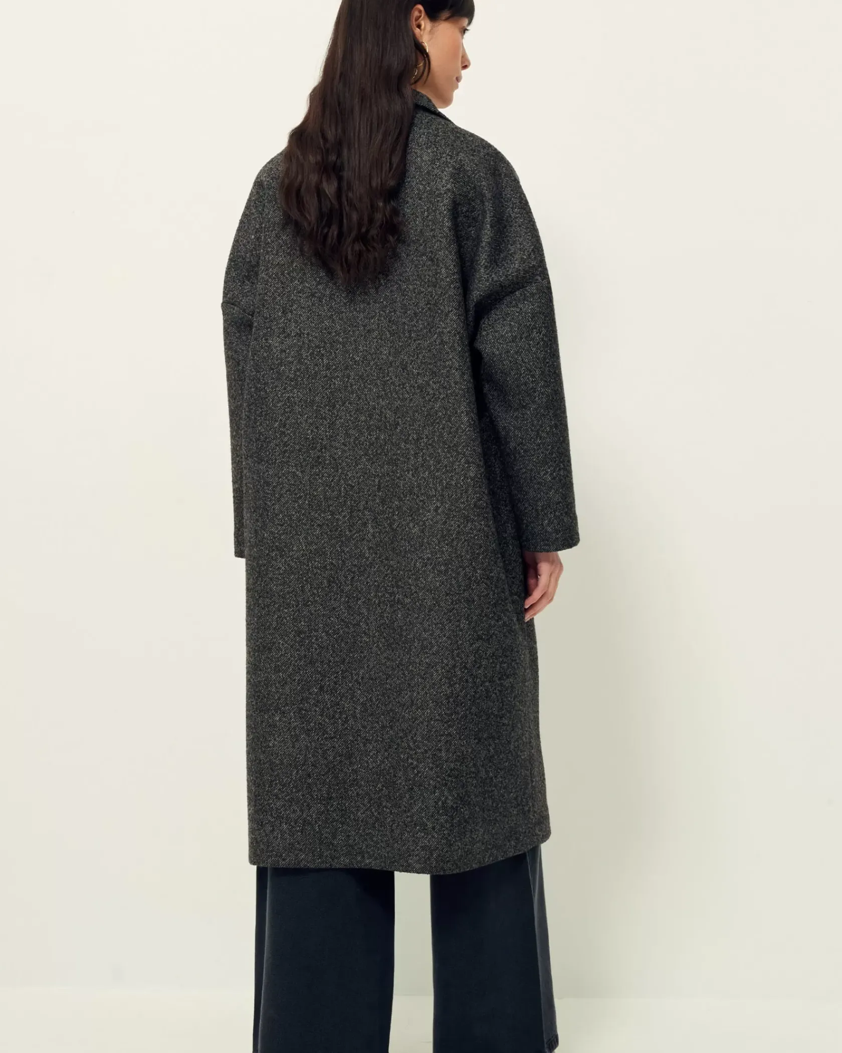 Manteau long non doublé à emmanchures bases en tissage twill fantaisie de fils chinés tissé en Italie.