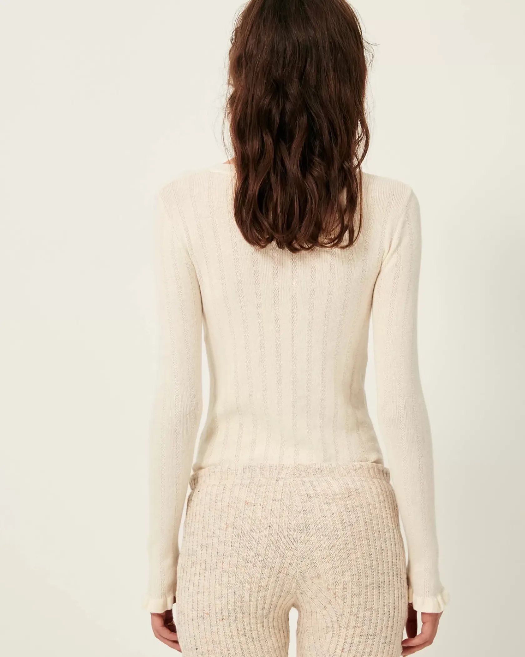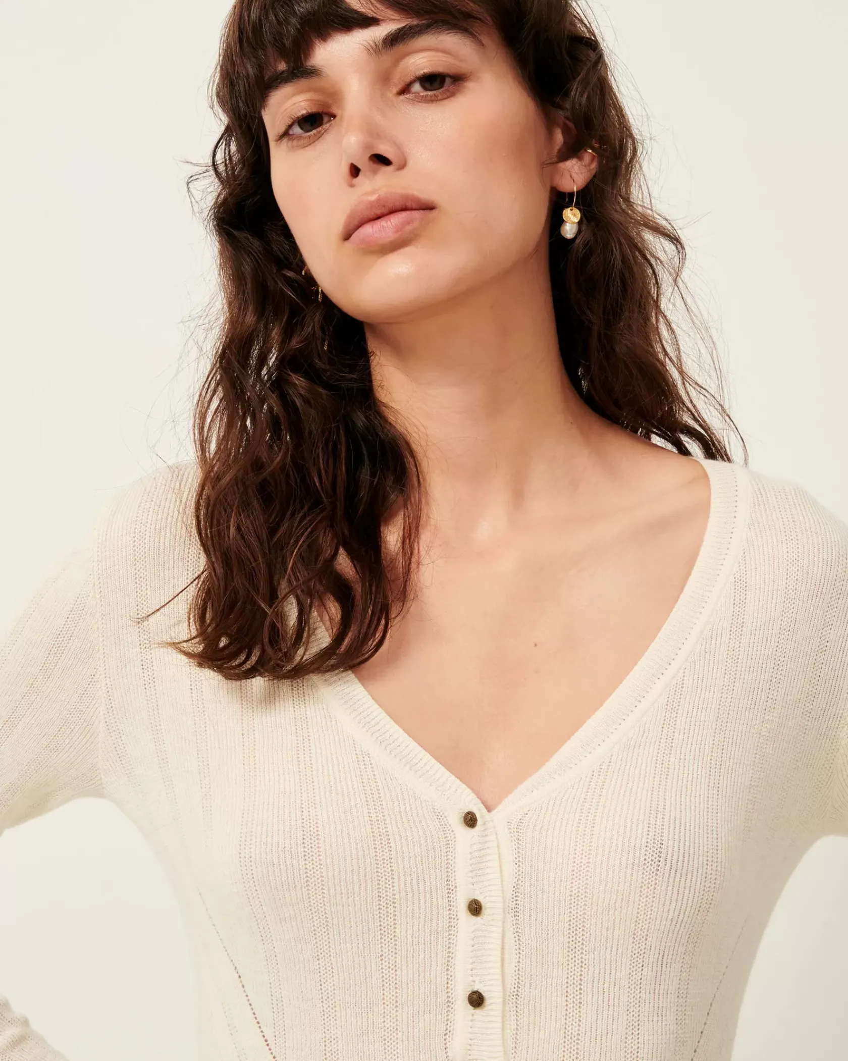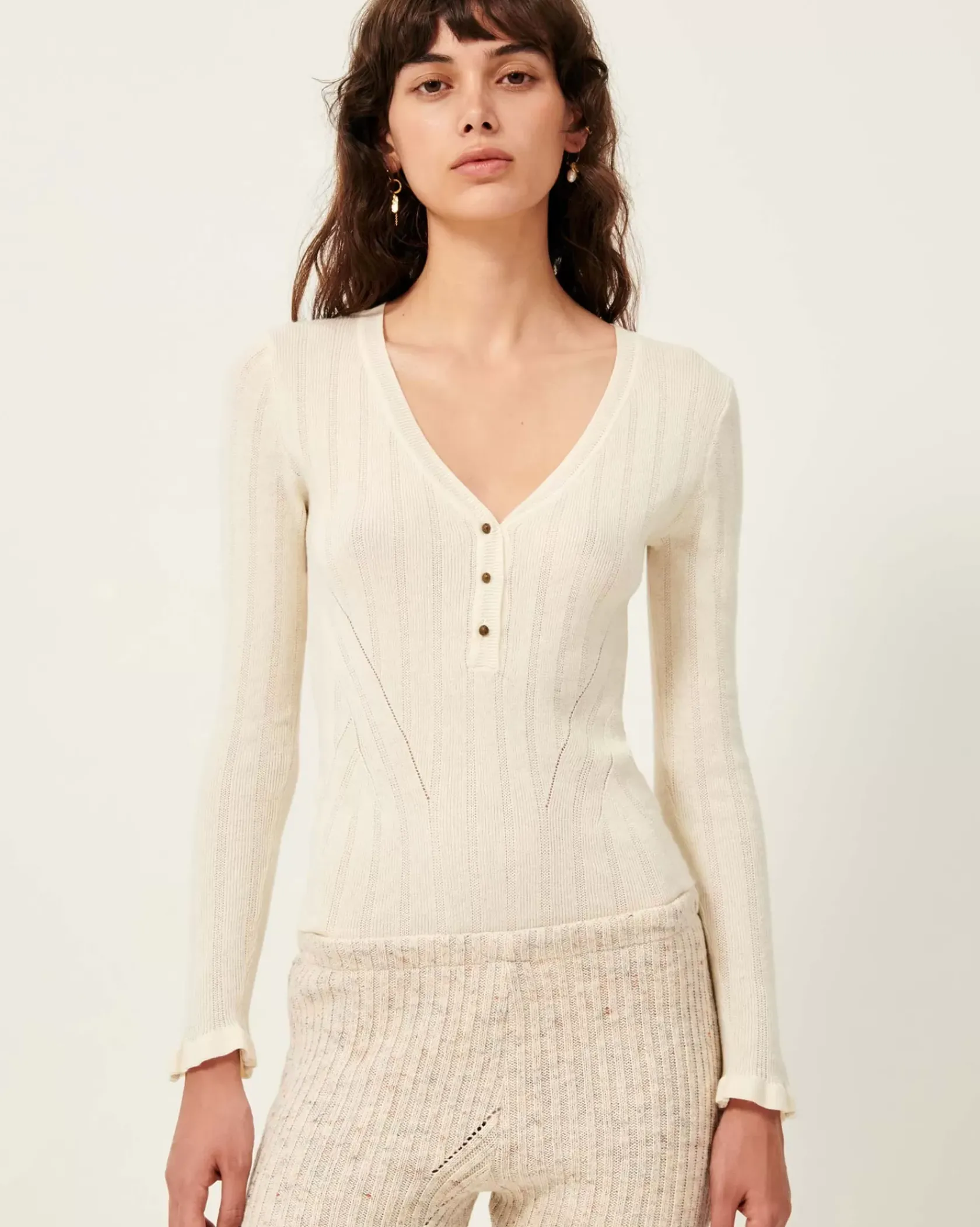 Top ajusté encolure boutonnée en maille fine jauge et jeu de côtes graphique aux côtés.