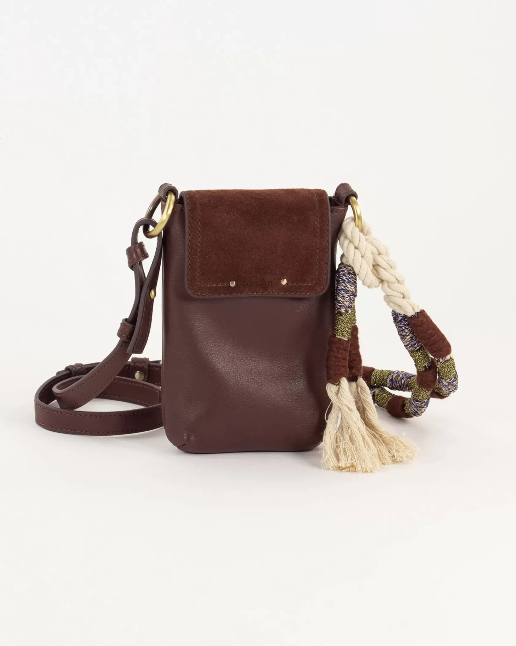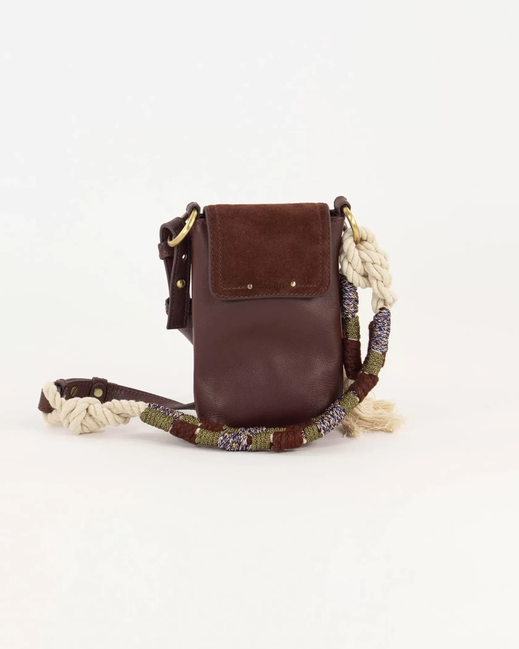 Porte portable en cuir de vache et rabat en cuir de vache suédé, anse corde tressée.