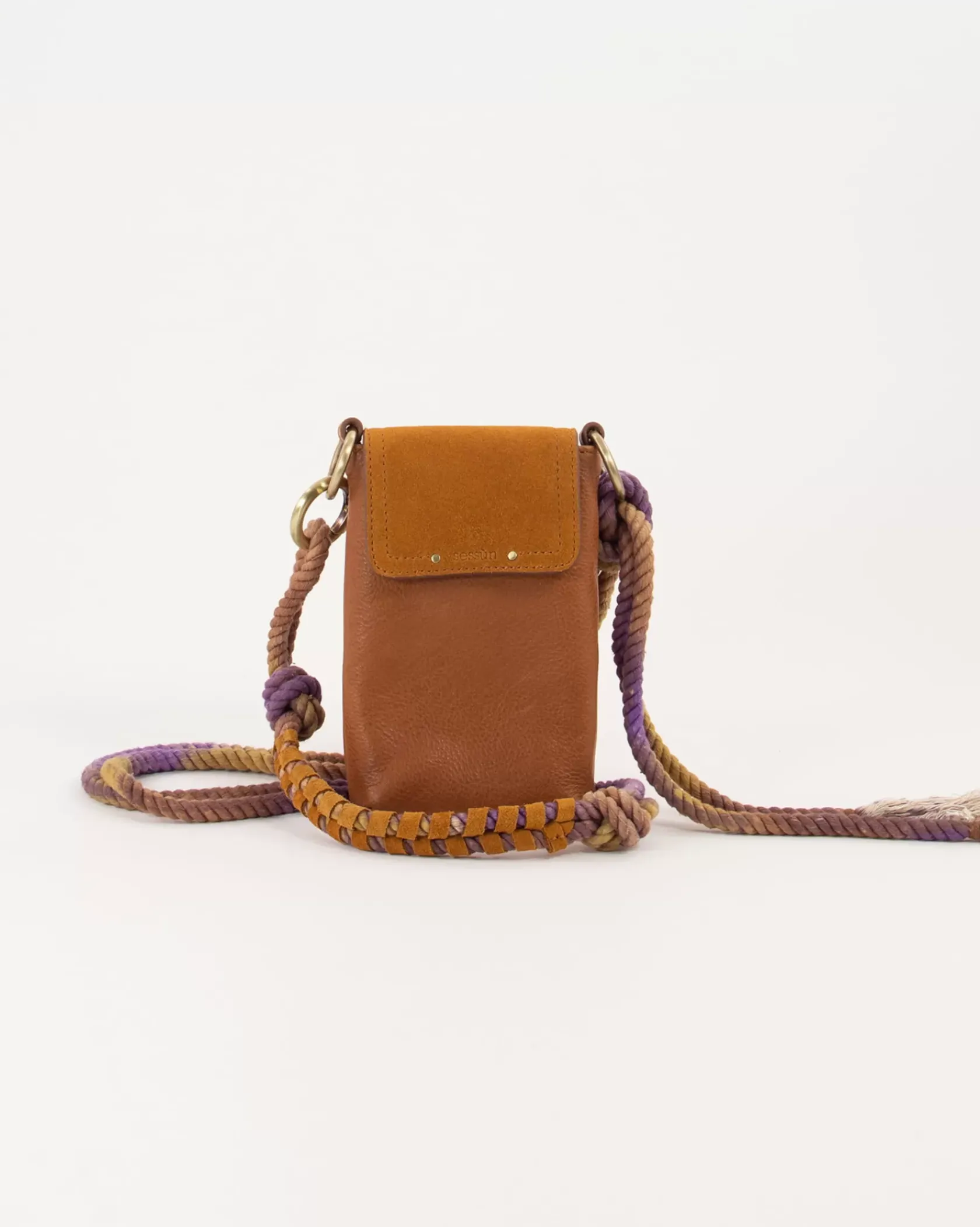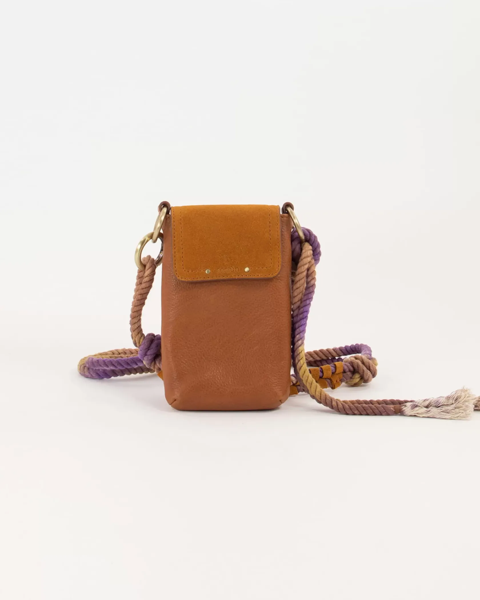 Porte portable en cuir de vache et rabat en cuir de vache suédé, anse corde tressée.