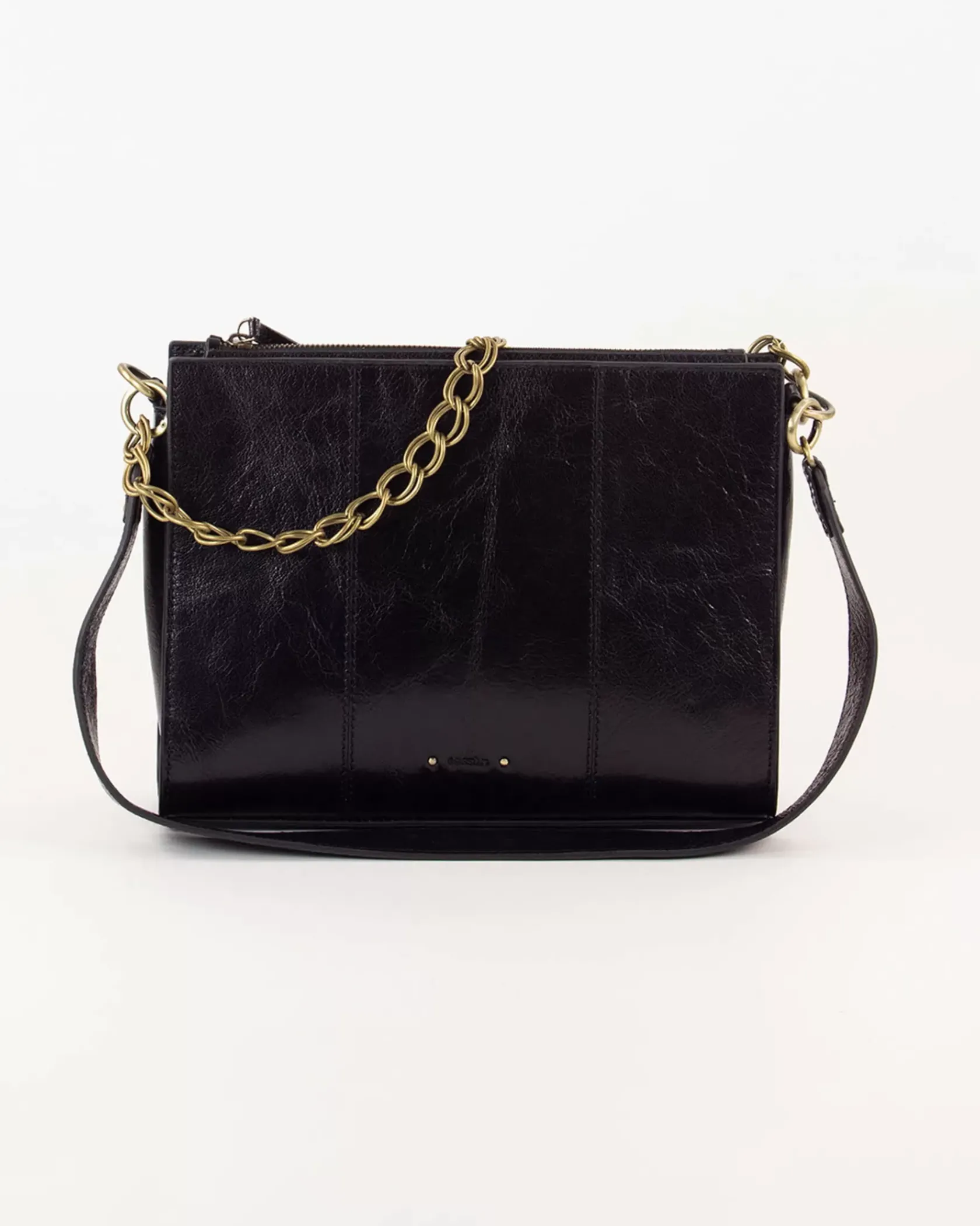 Sac pochette en cuir de chèvre tannage végétal. Détails de surpiqûres, jeu de anses amovibles en chaine et cuir.