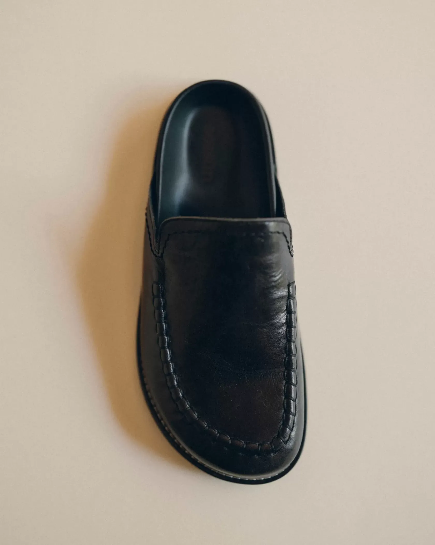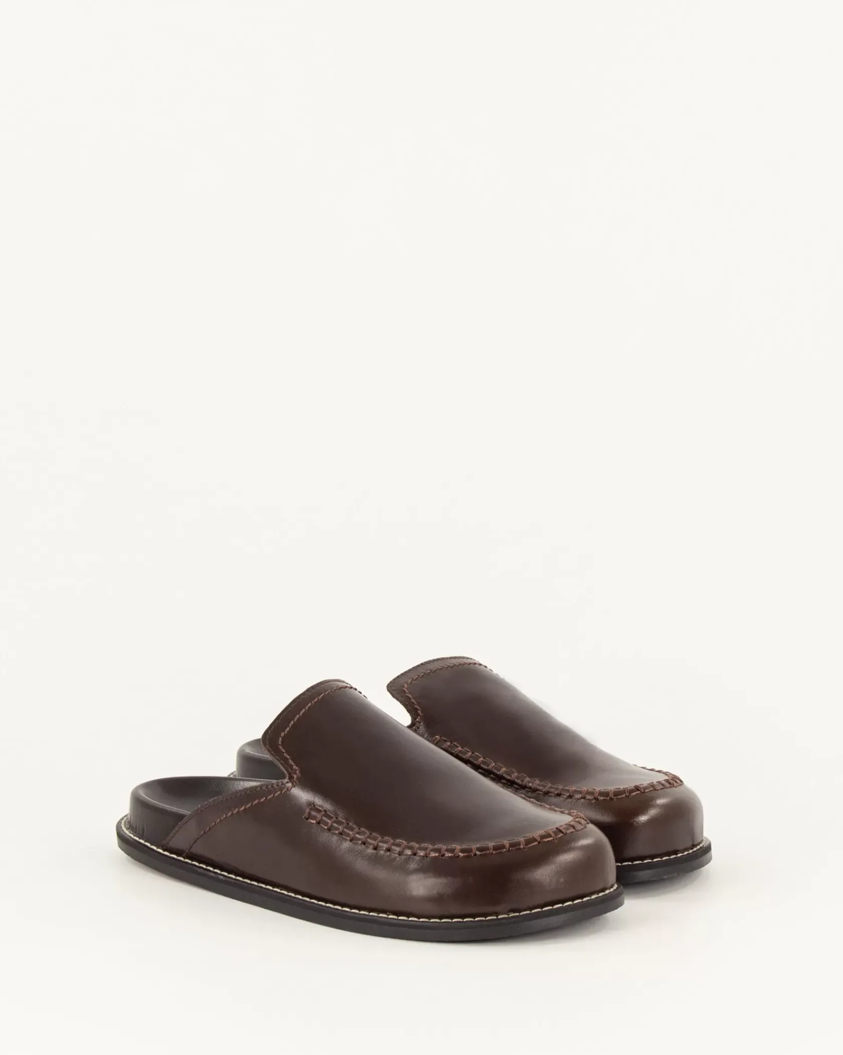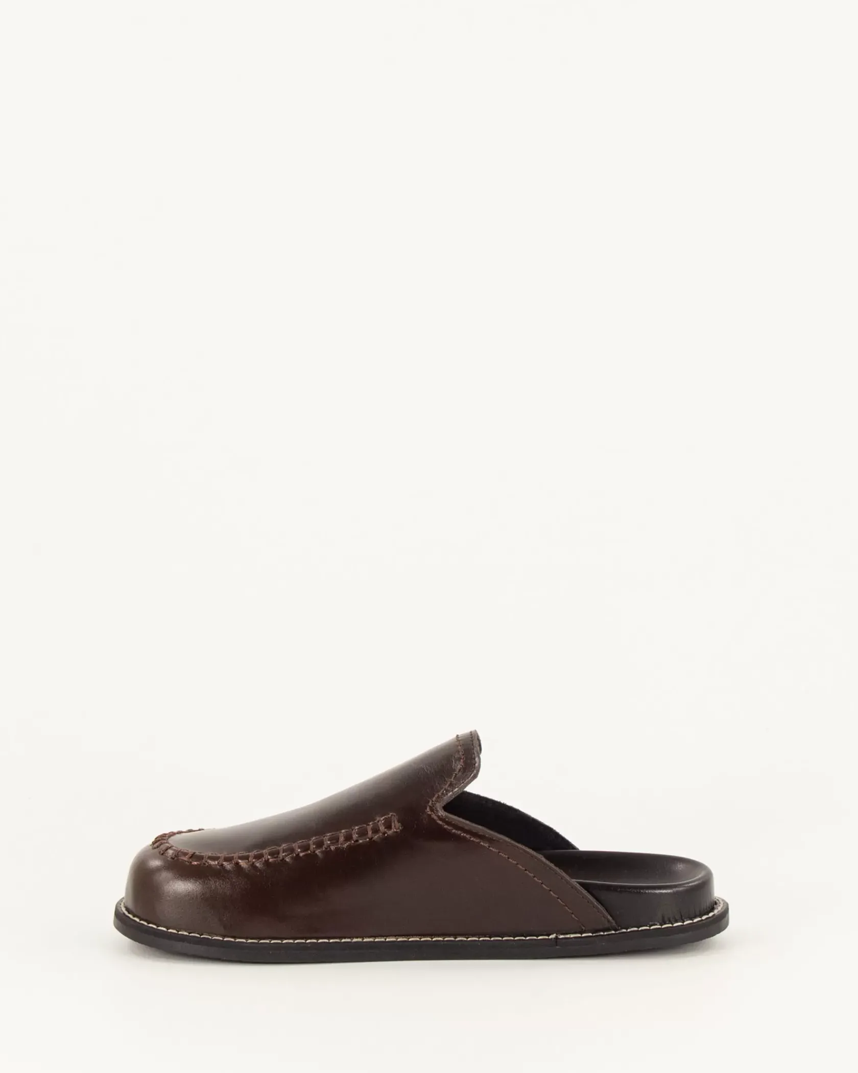 Sabots plats en cuir de vache, surpiqûres ton sur ton en détail, confectionnées au Portugal.