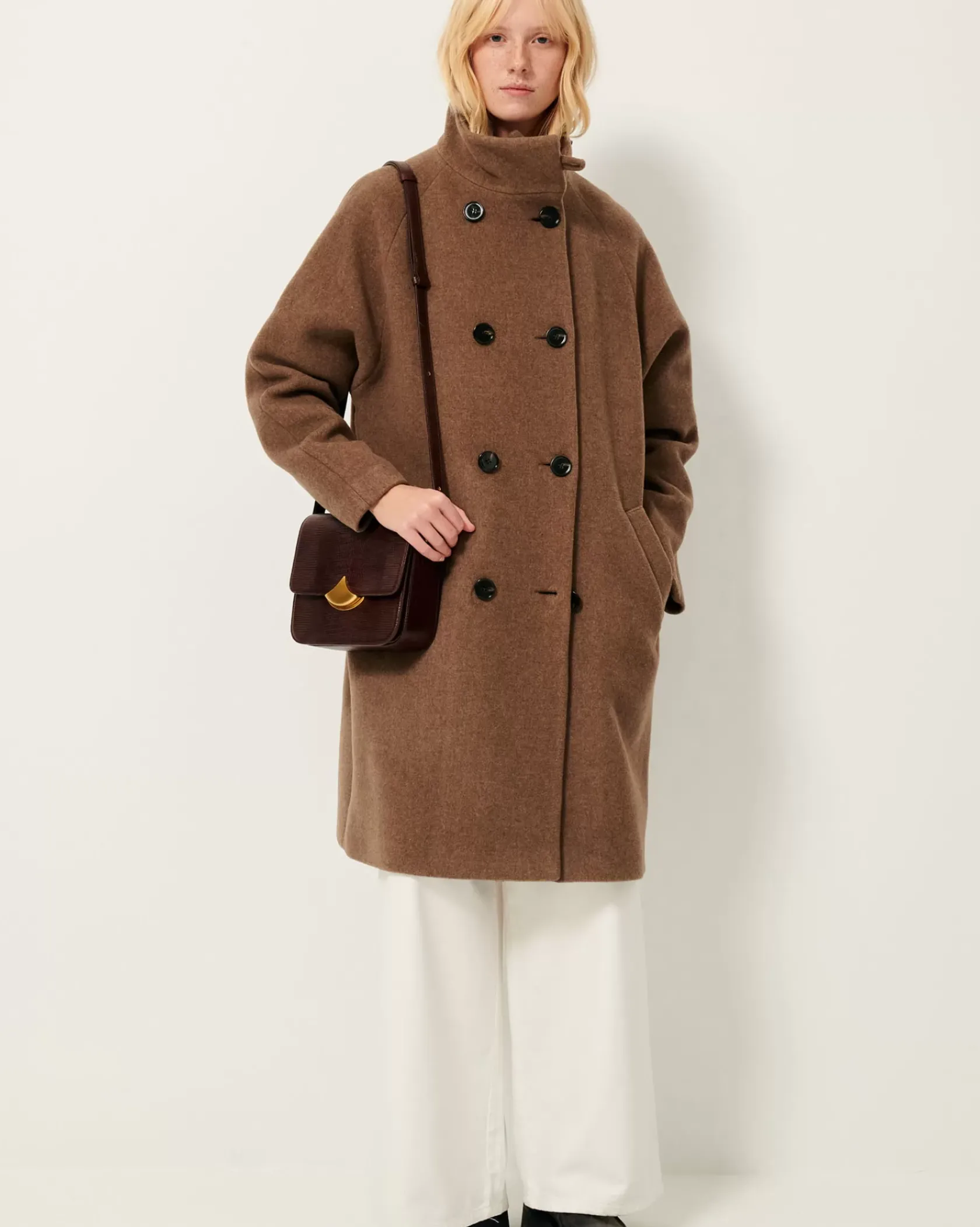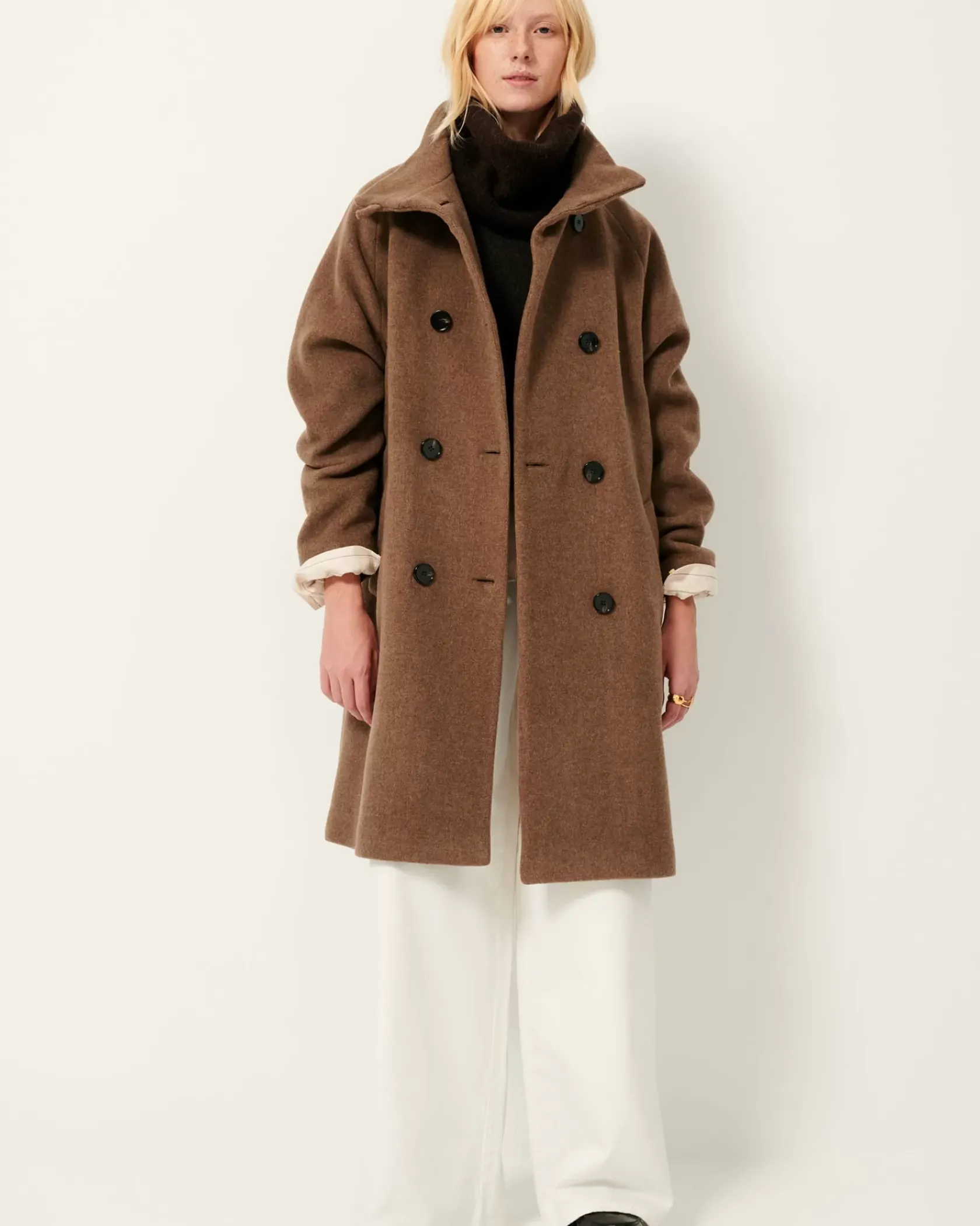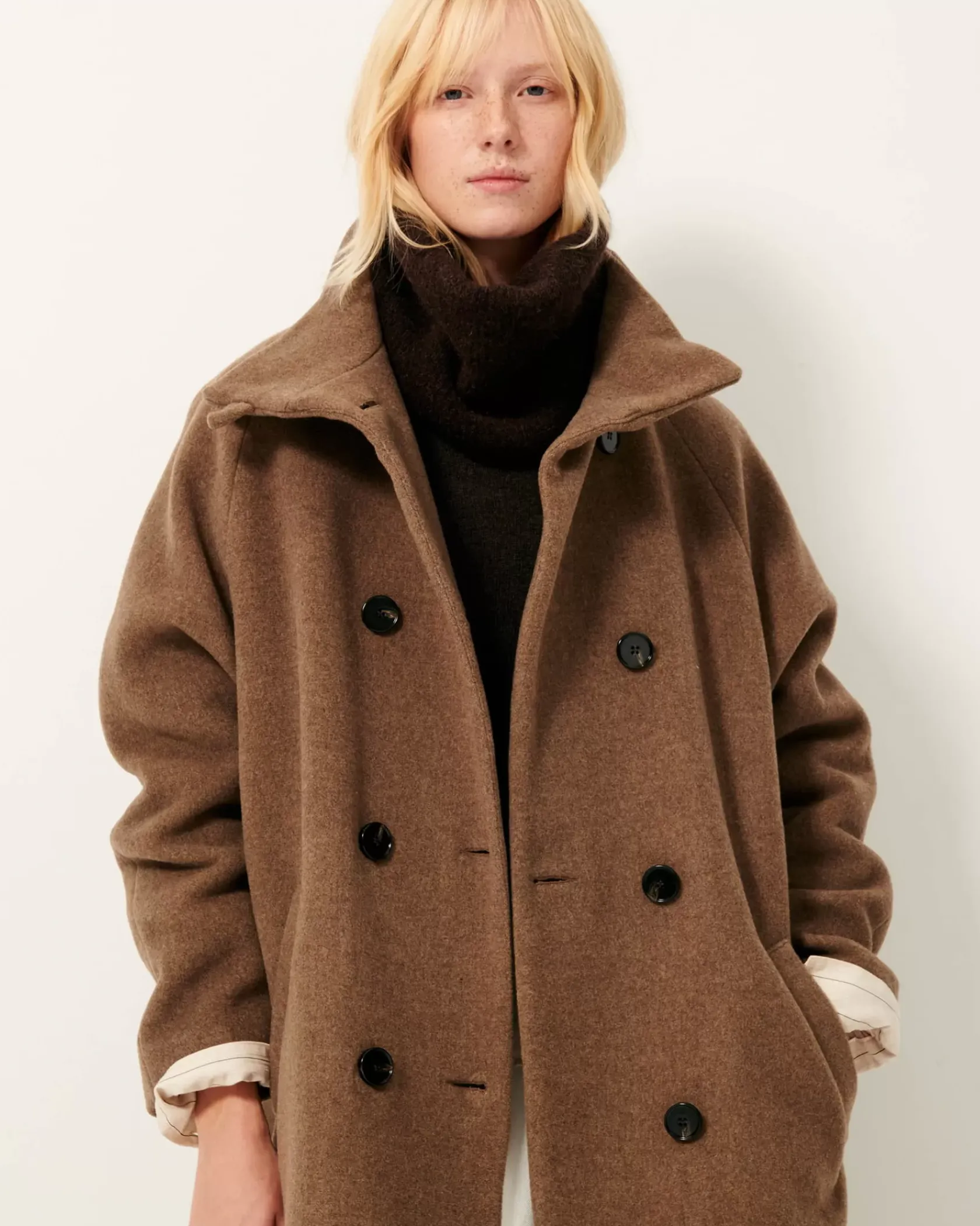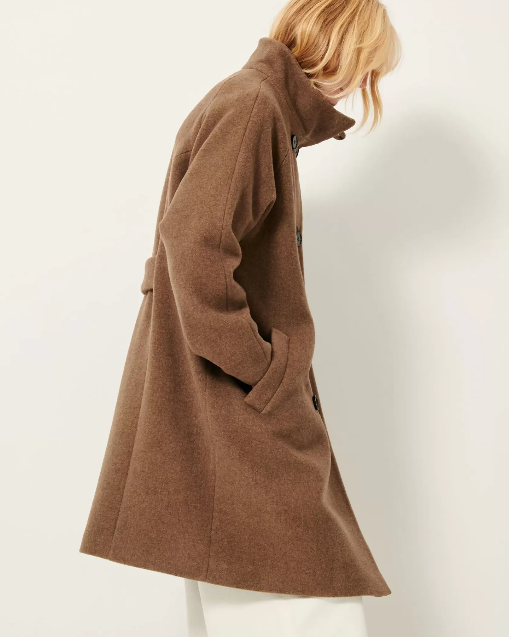 Manteau mi-long à col montant et double boutonnage en double tissage melton finition velvet tissé en Italie.
