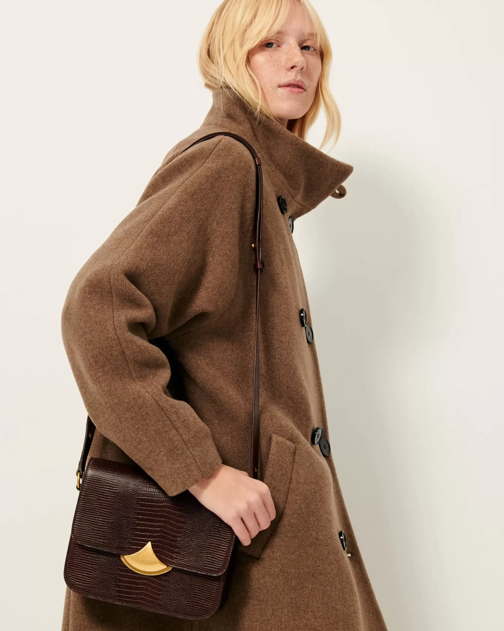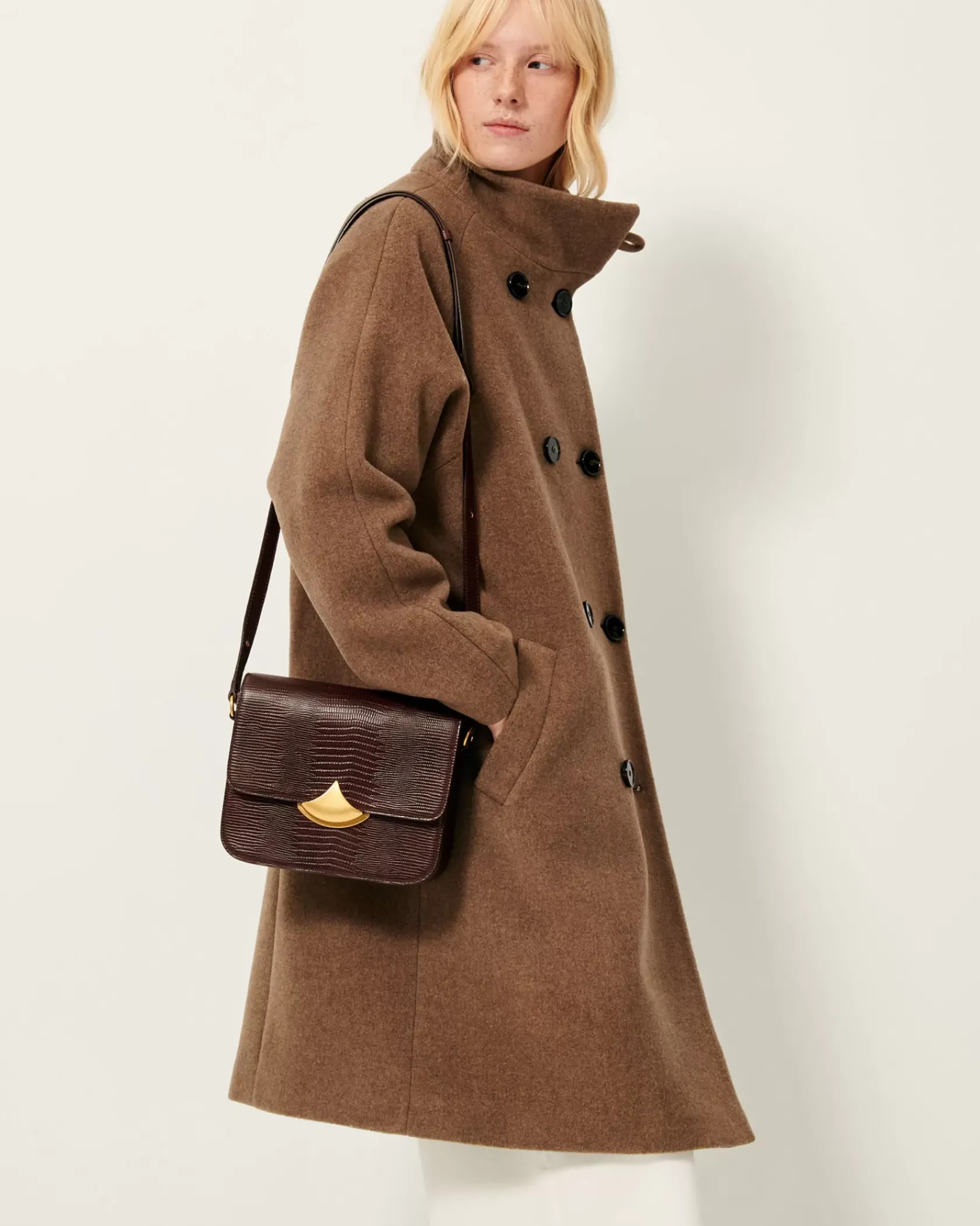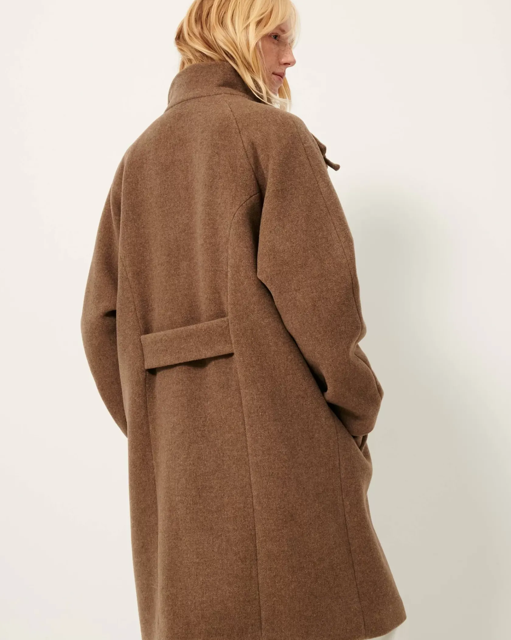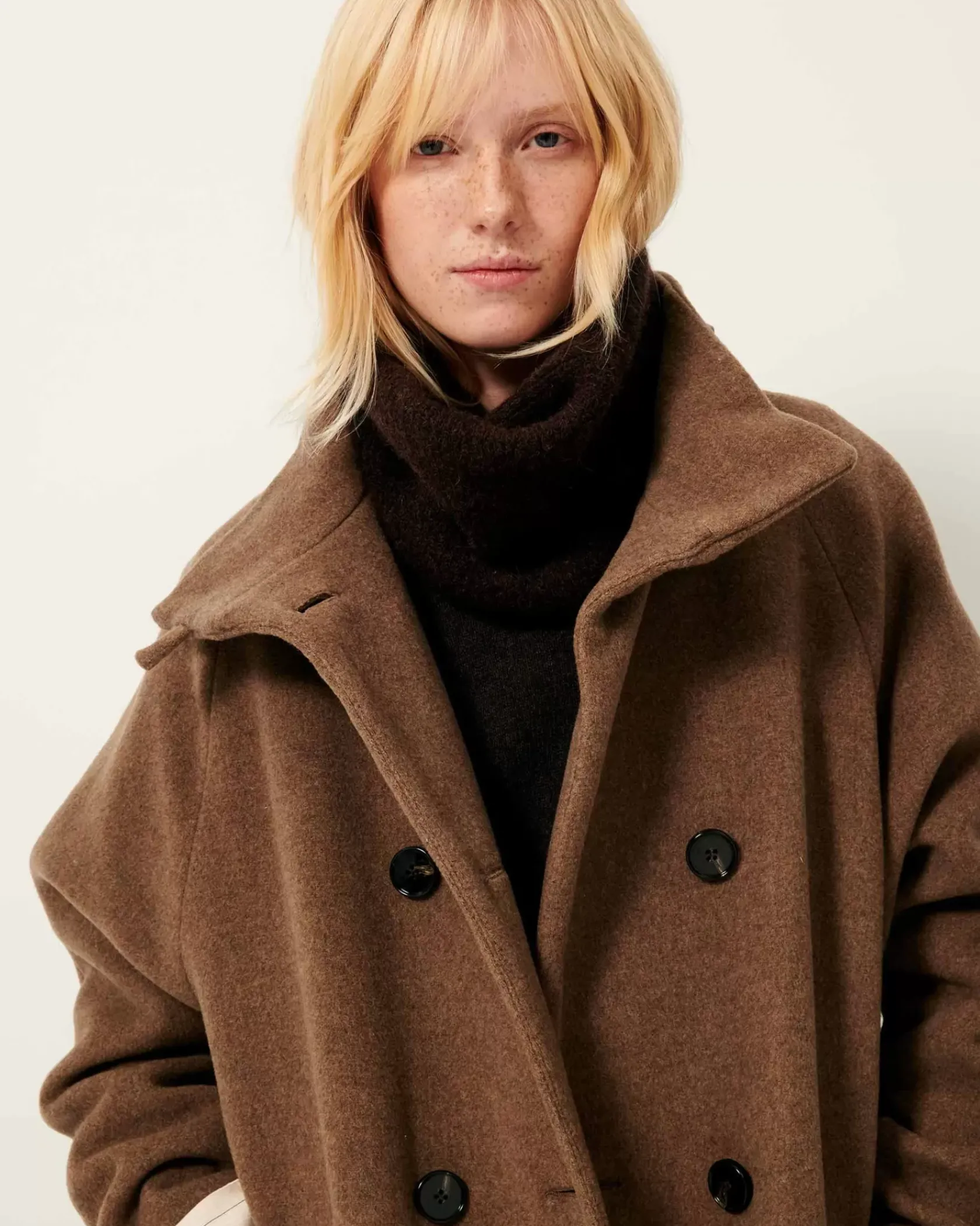 Manteau mi-long à col montant et double boutonnage en double tissage melton finition velvet tissé en Italie.