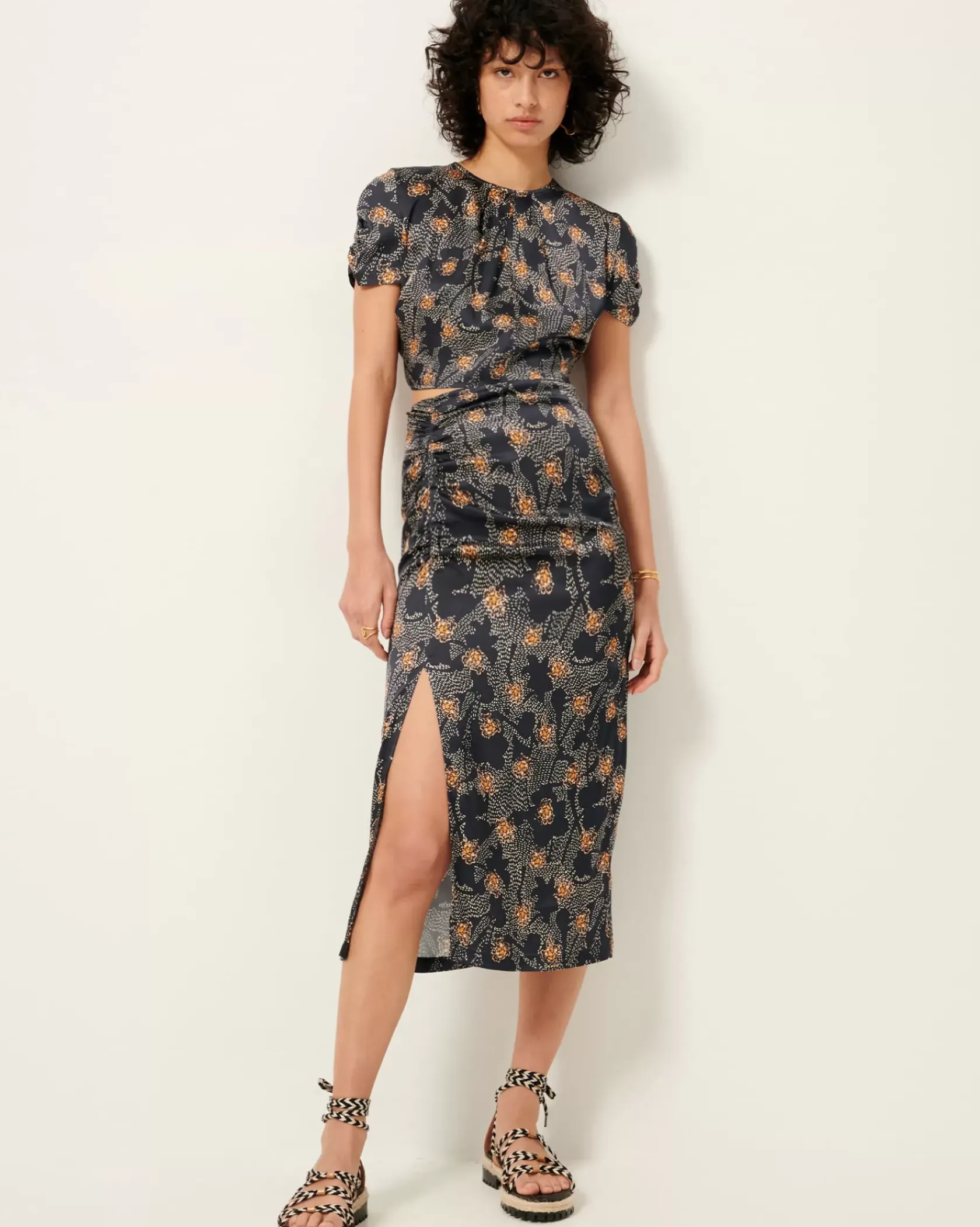 Jupe droite mi-longue fendue en satin fluide imprimé et apprêté en Italie, motif exclusif Sessùn.