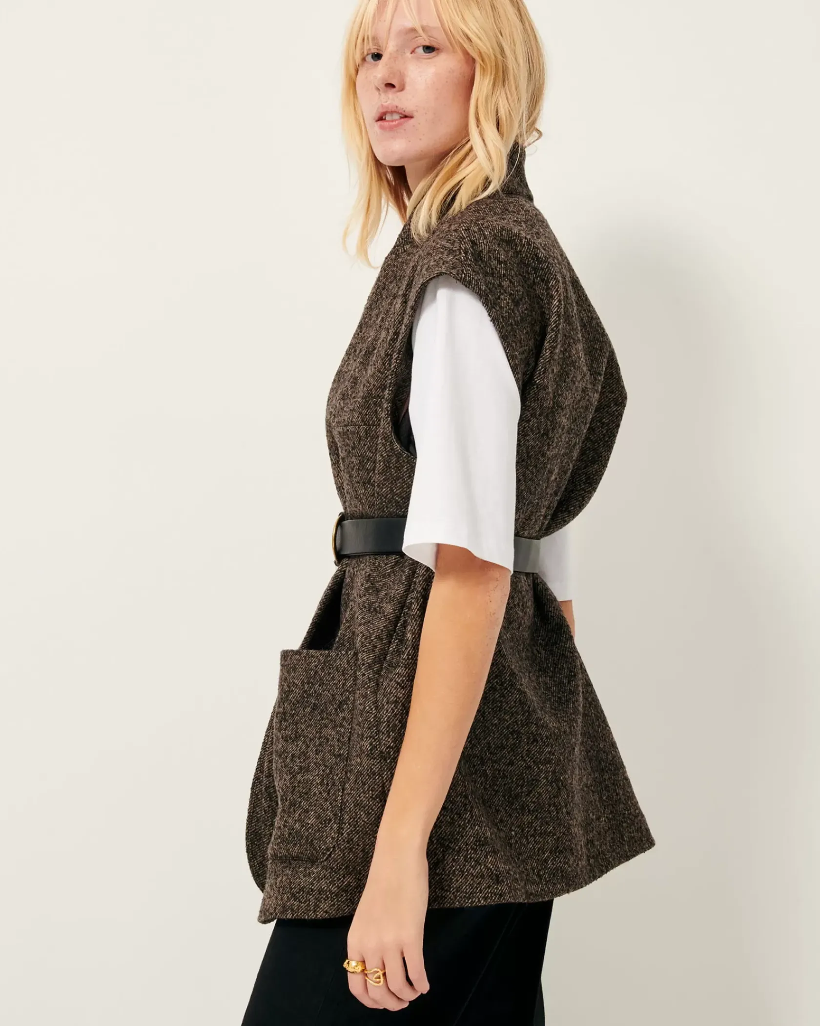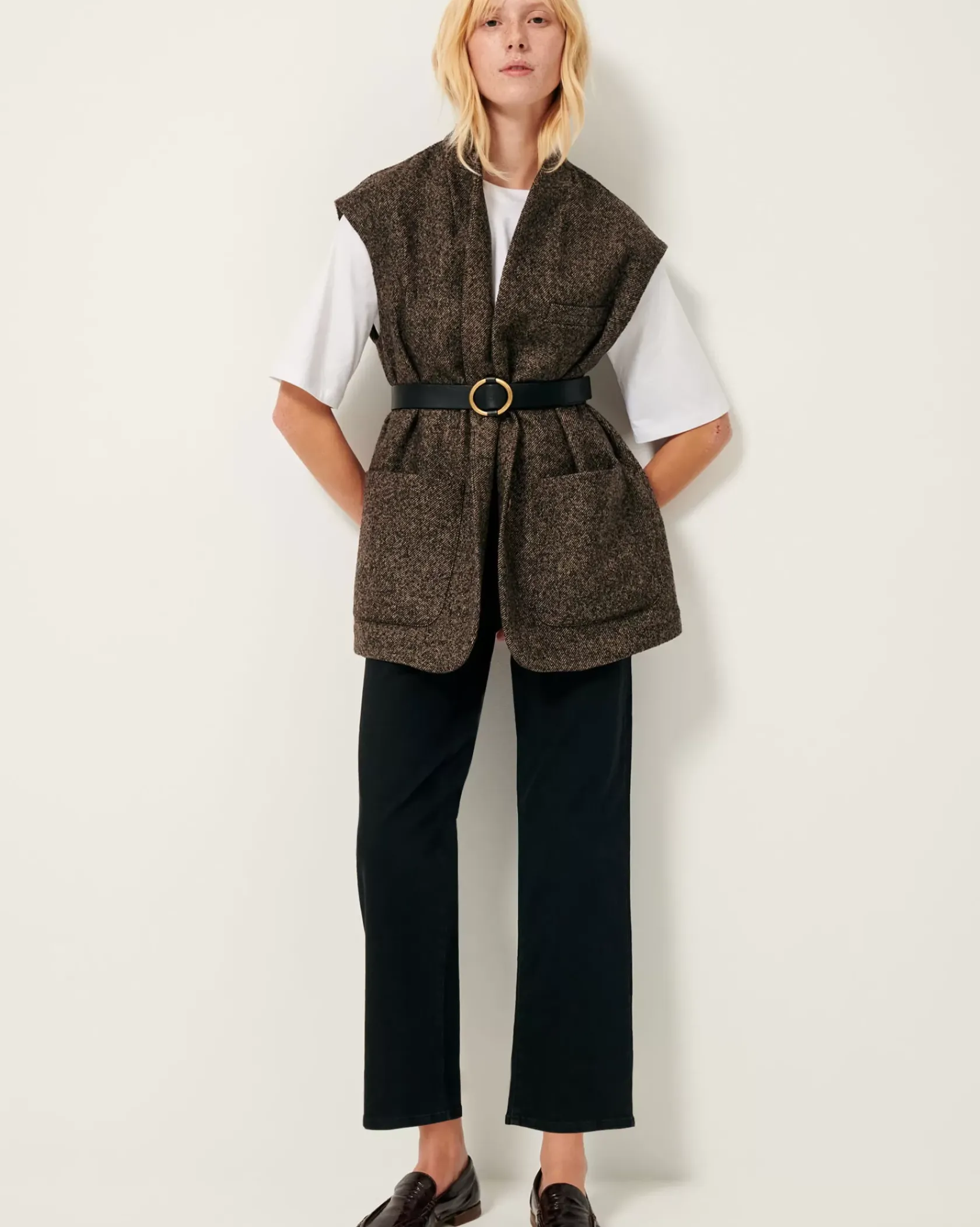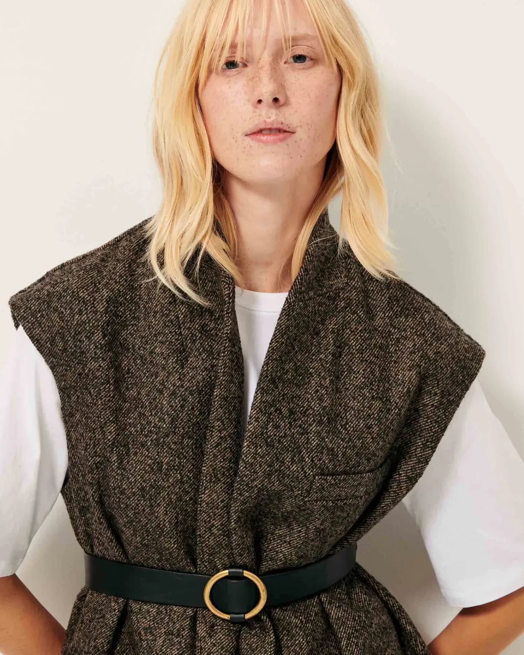 Veste de tailleur à col relevé, sans manches en tissage twill fantaisie de fils chinés tissé en Italie.