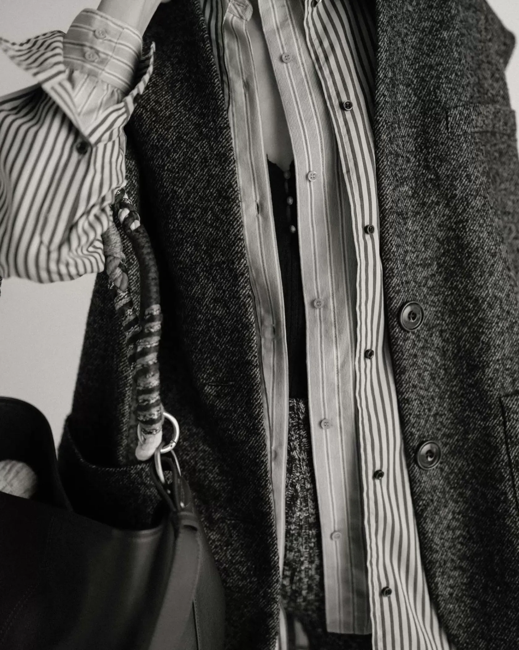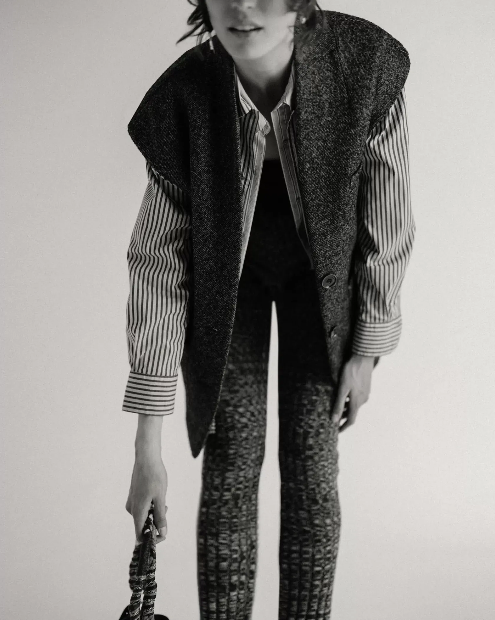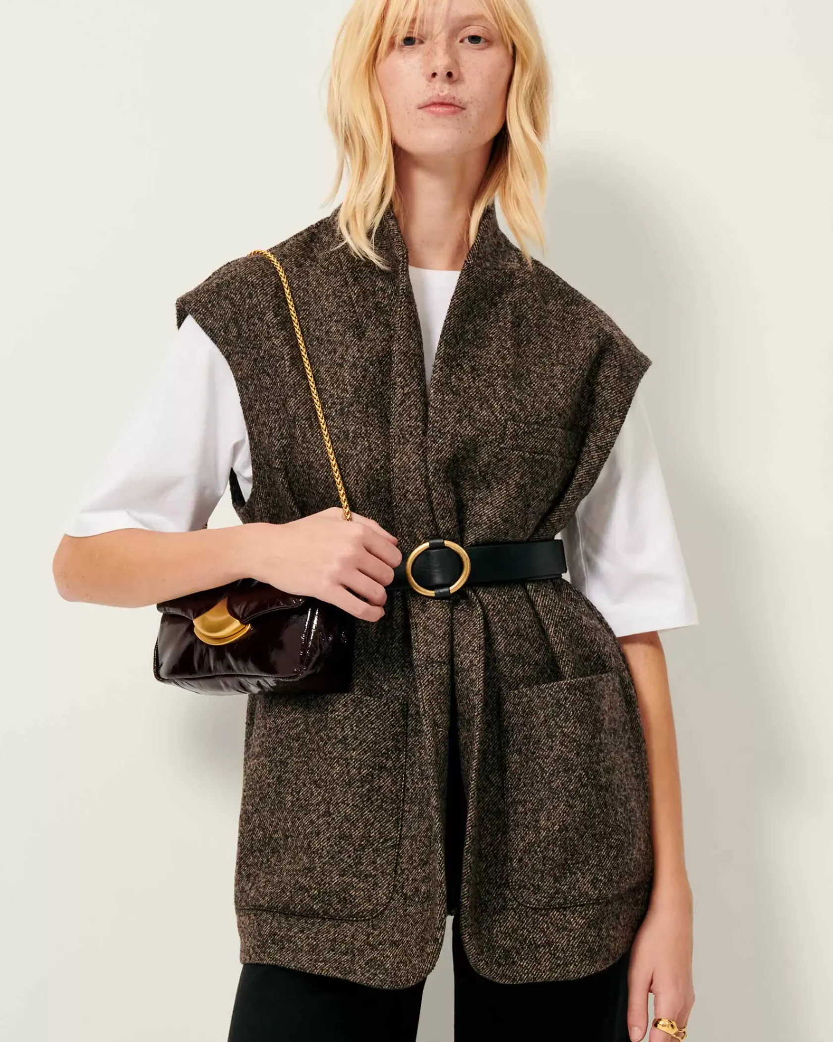 Veste de tailleur à col relevé, sans manches en tissage twill fantaisie de fils chinés tissé en Italie.
