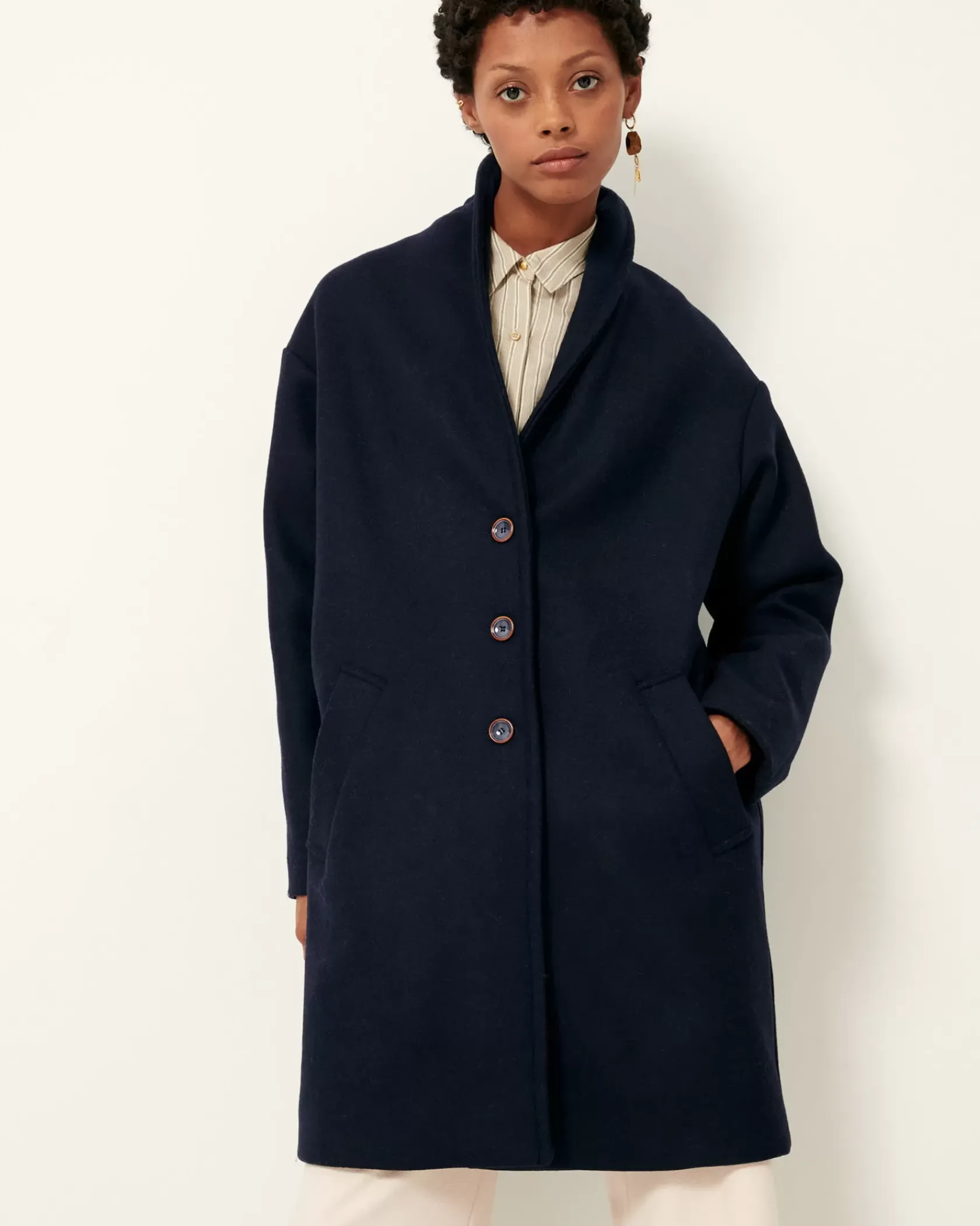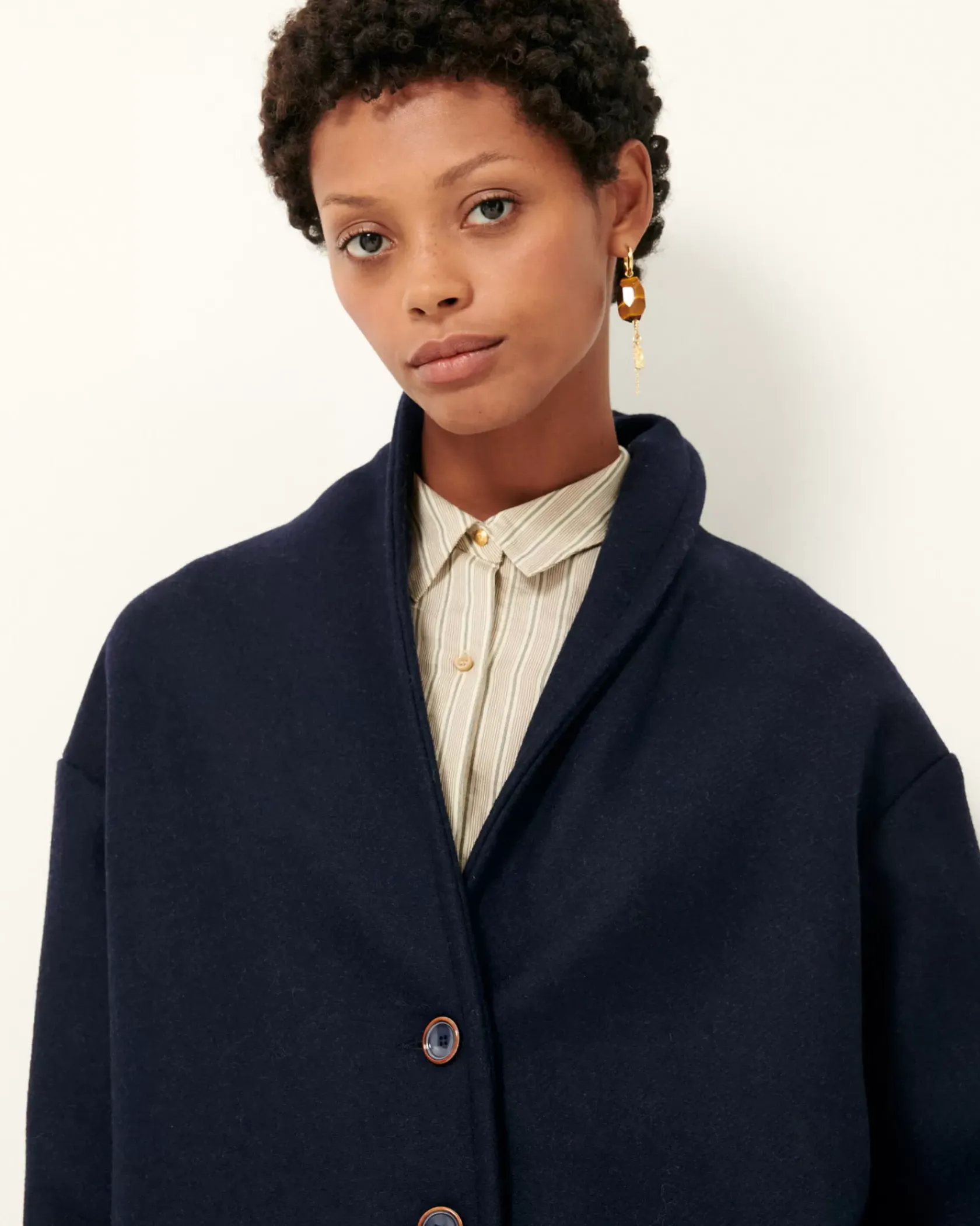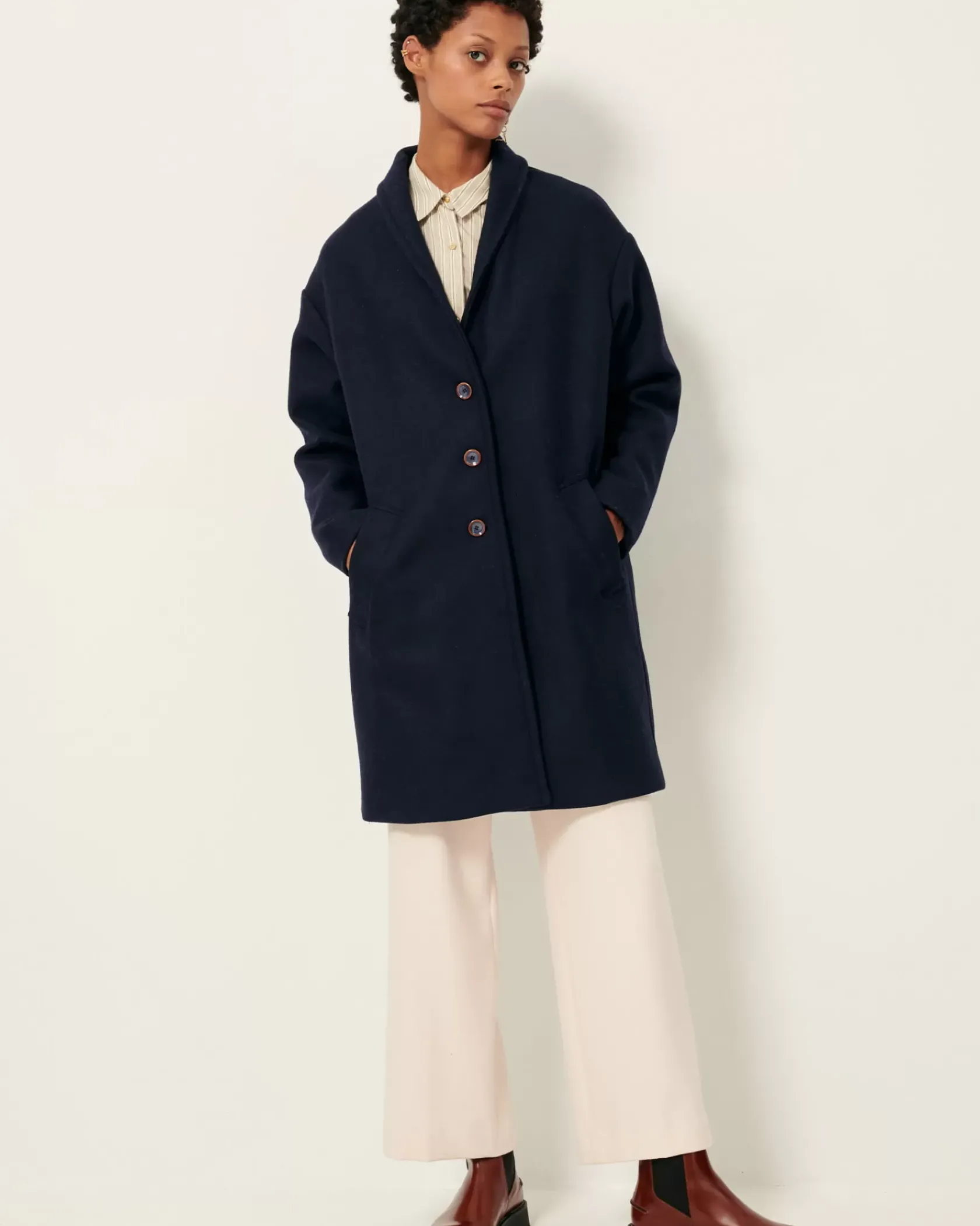Manteau droit mi-long en double tissage armuré chiné tissé en Italie.