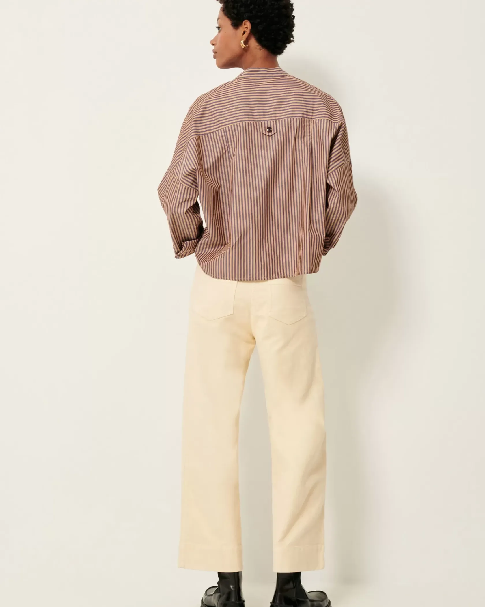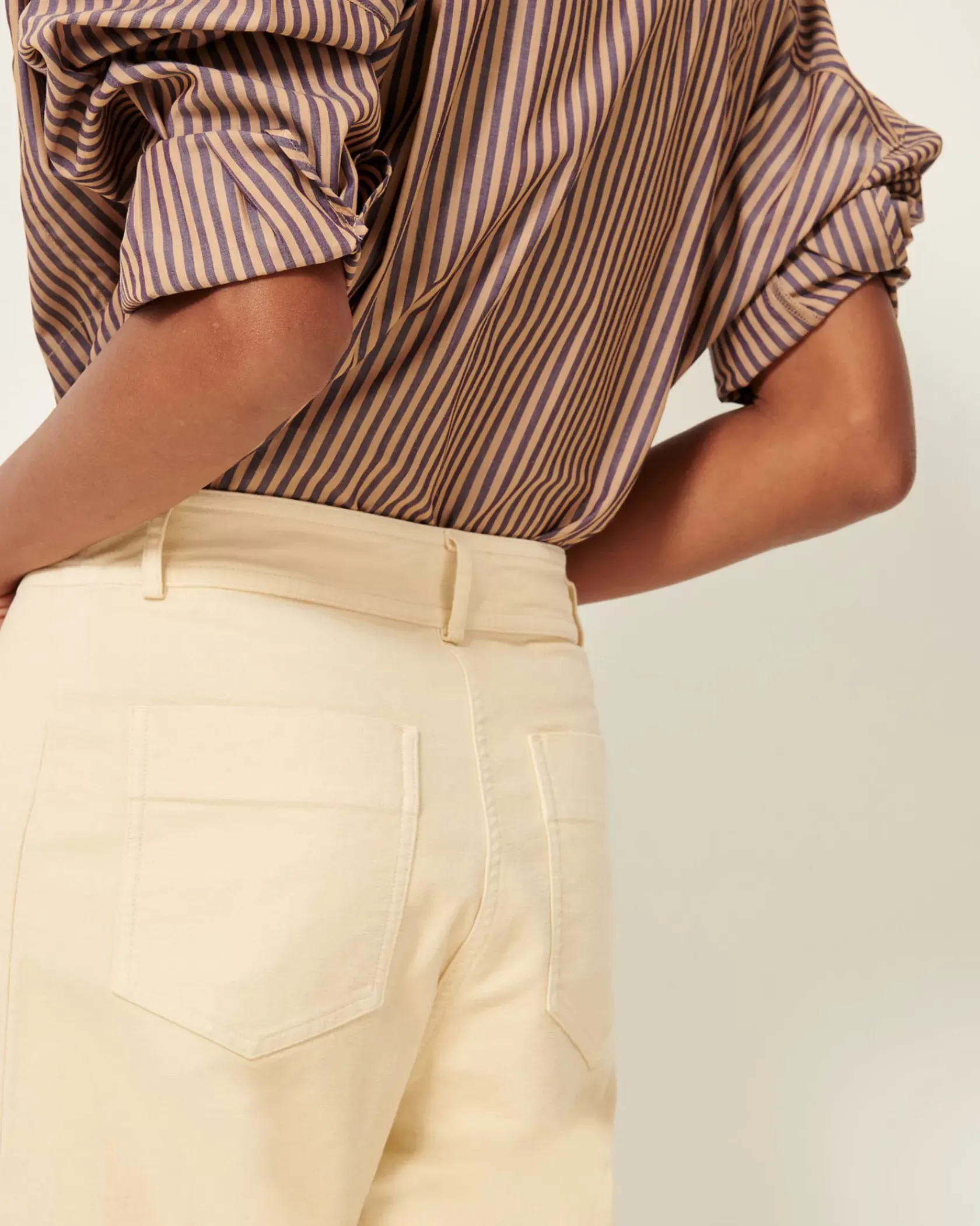 Pantalon en A en gabardine façon suédine, finition velvet, teinte en plongée, tissé en Espagne.