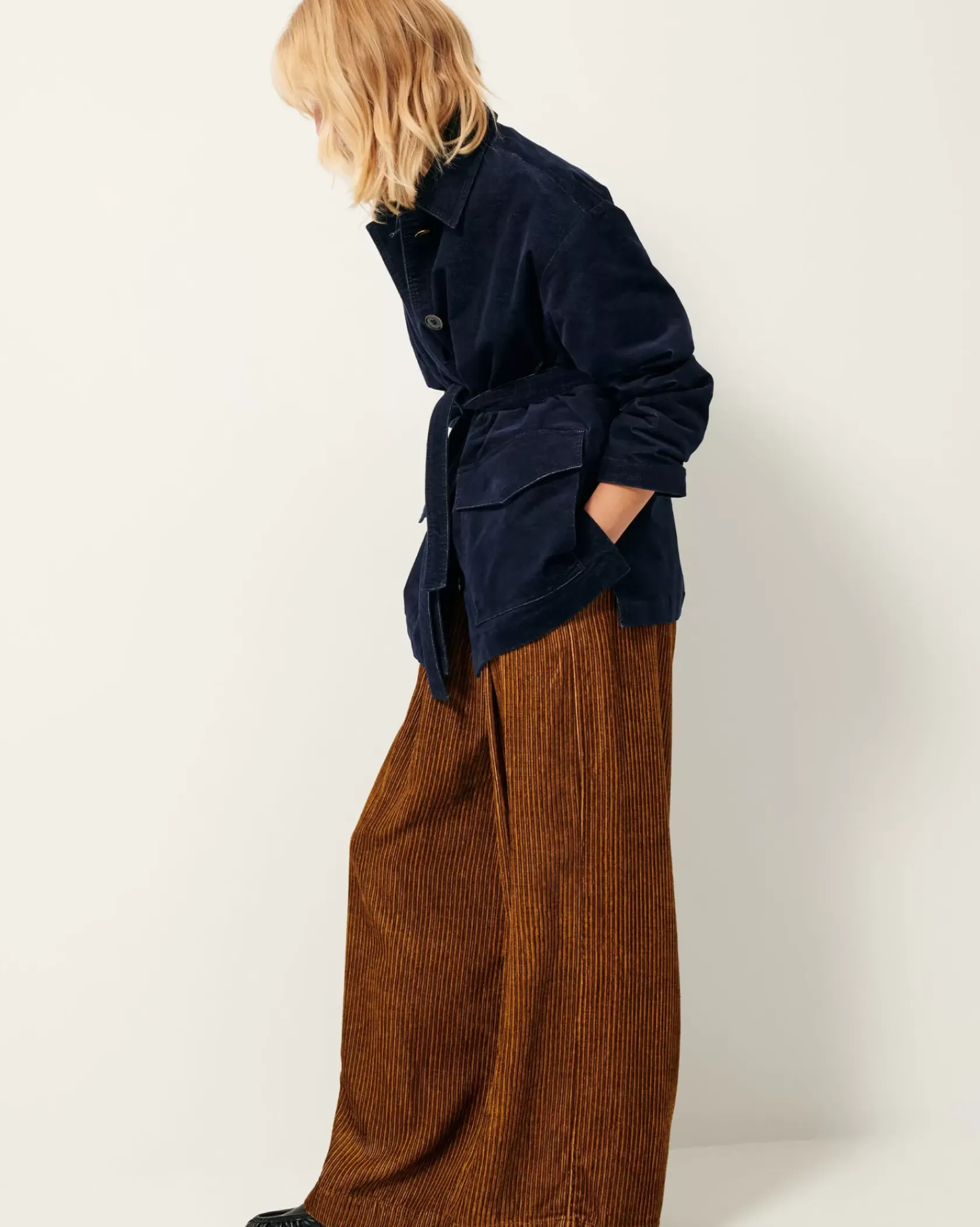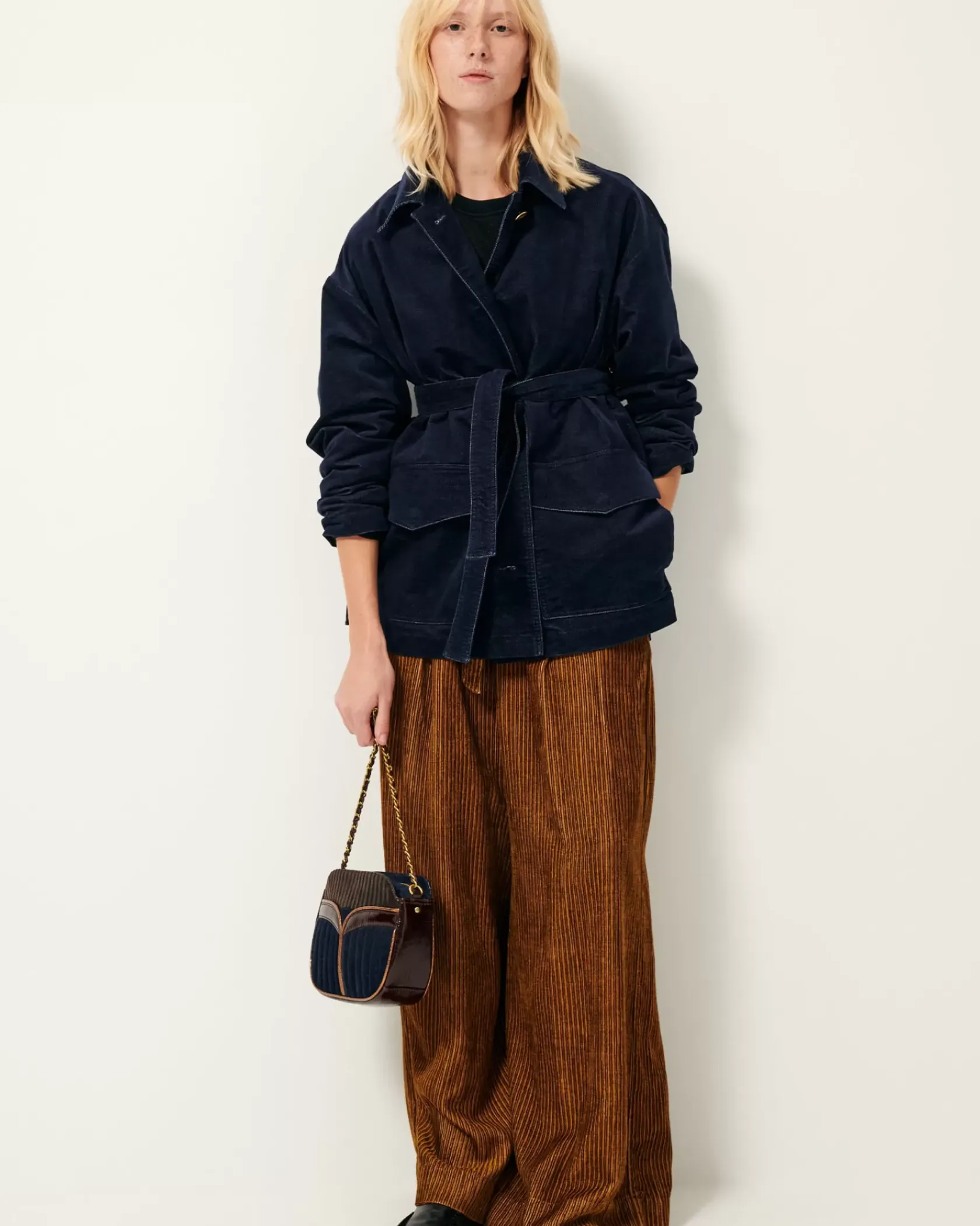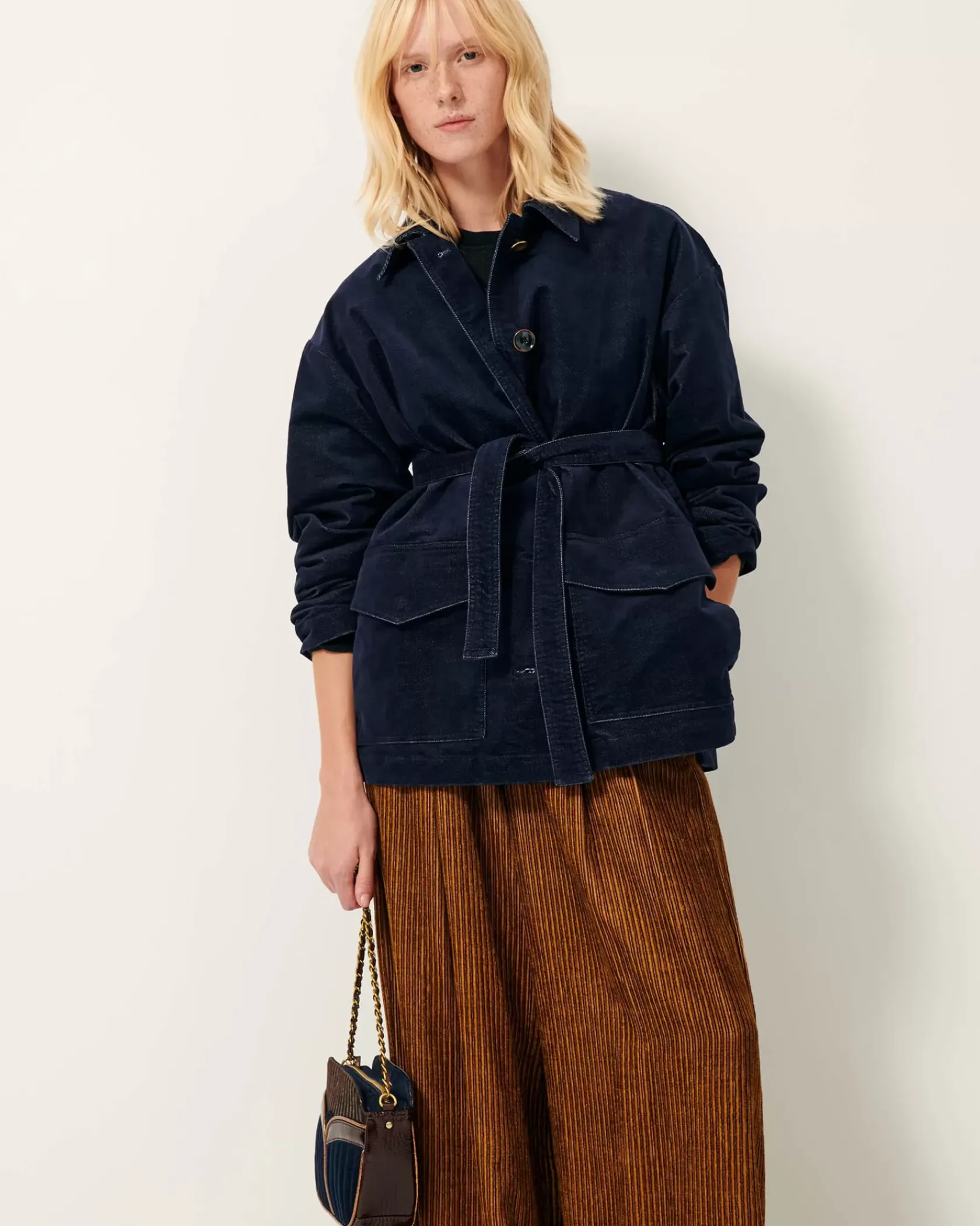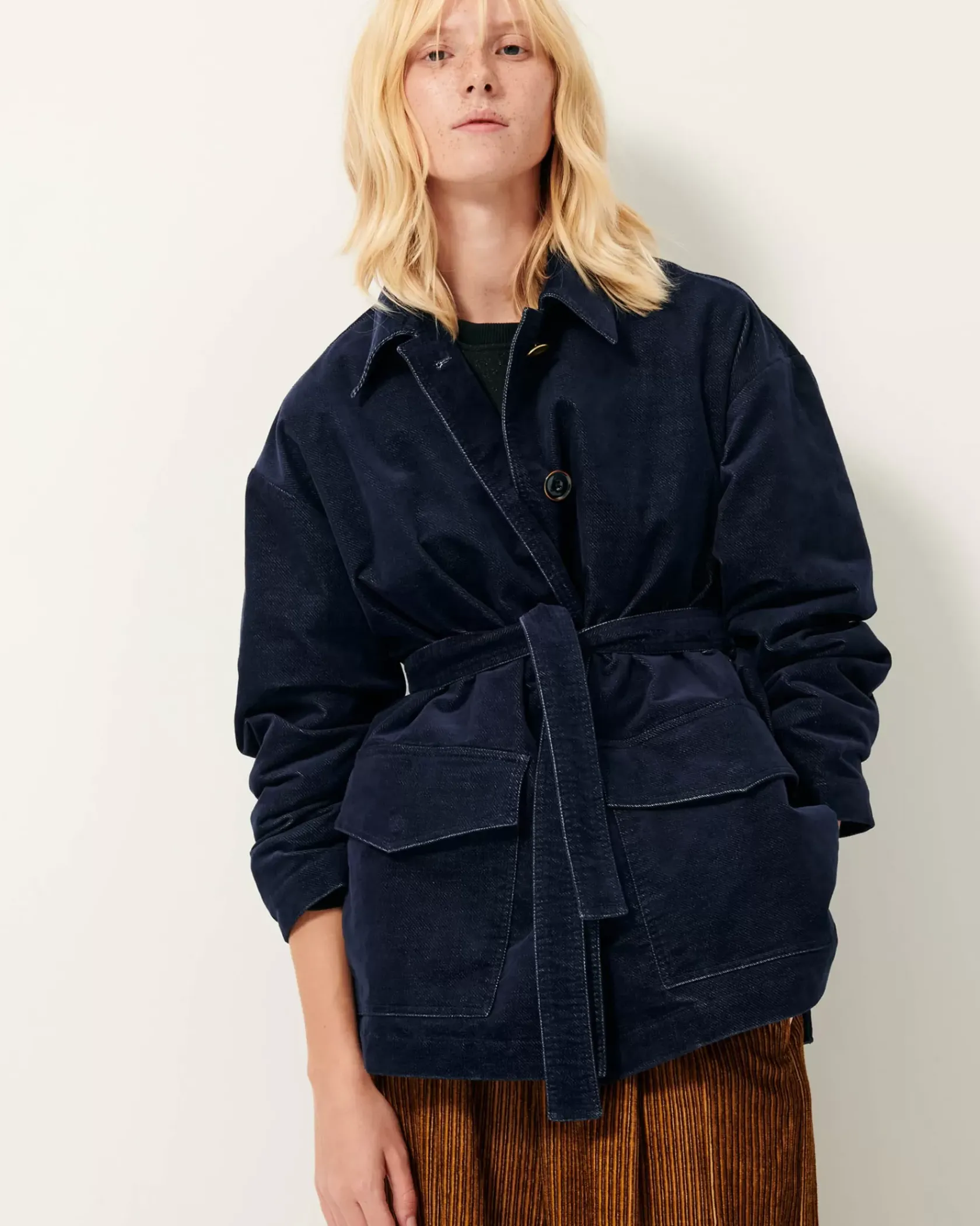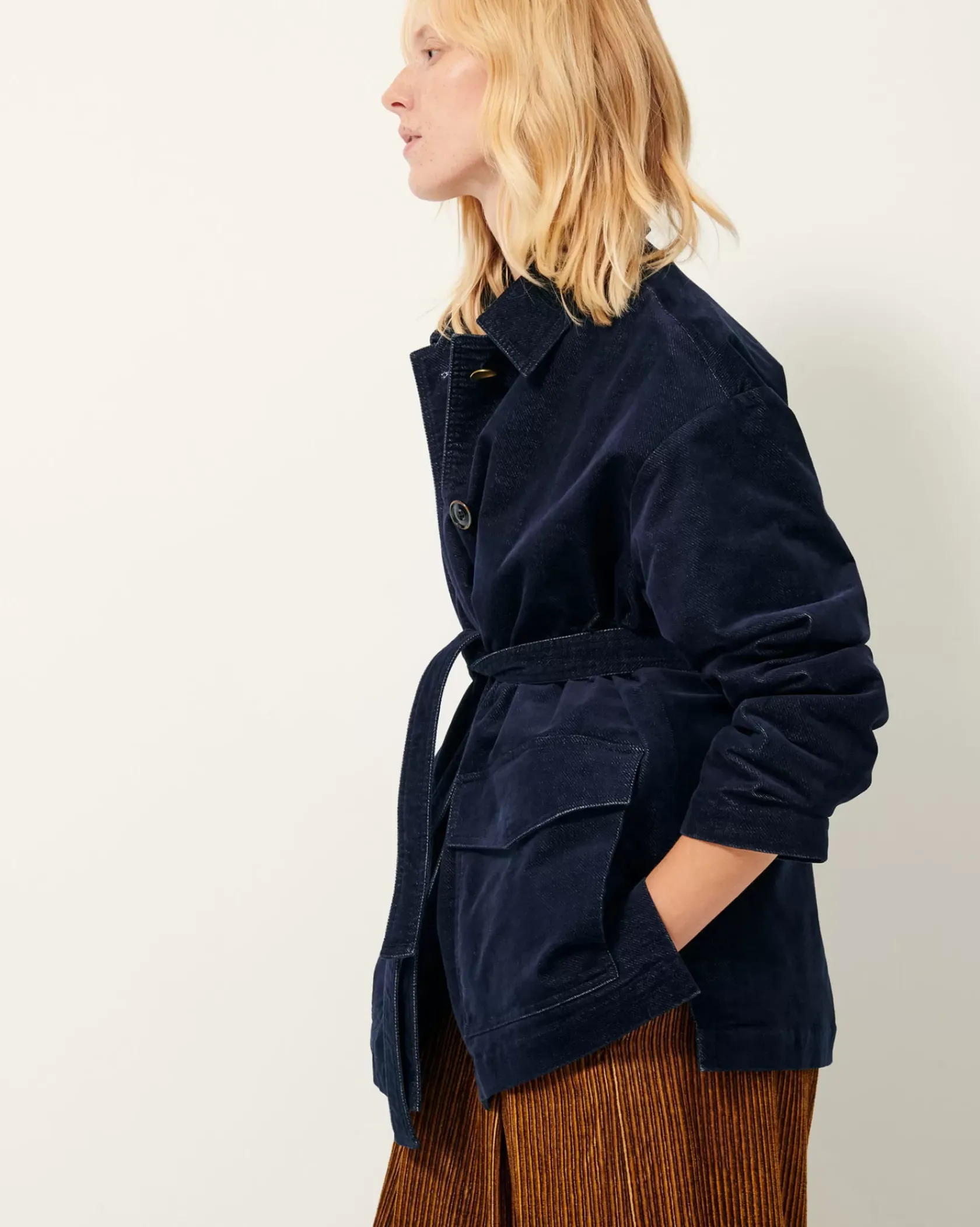 Veste ceinturée esprit worker à poches plaquées en sergé de velours chambray ras, teint et lavé esprit denim.