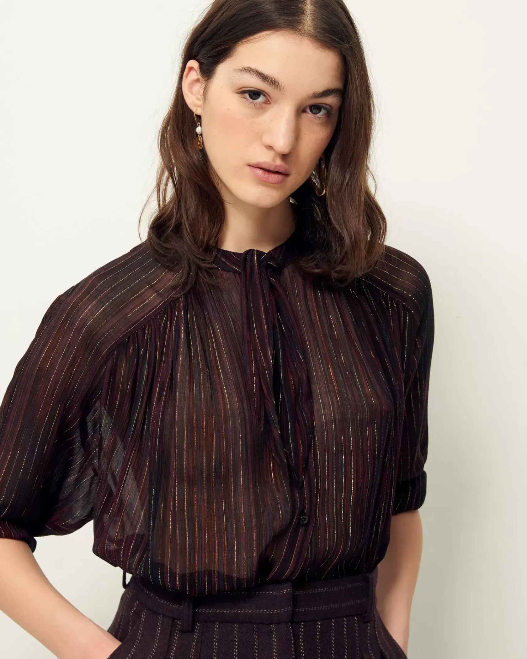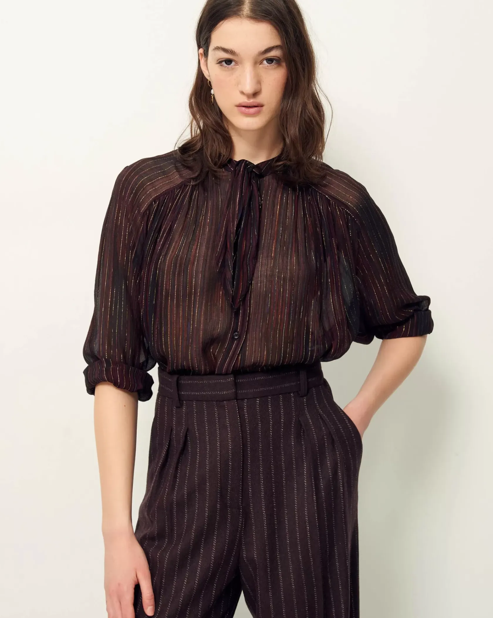 Chemise froncée à col noué en crépon mousseline de soie viscose imprimé, à fines rayures métallisées, motif exclusif Sessùn.