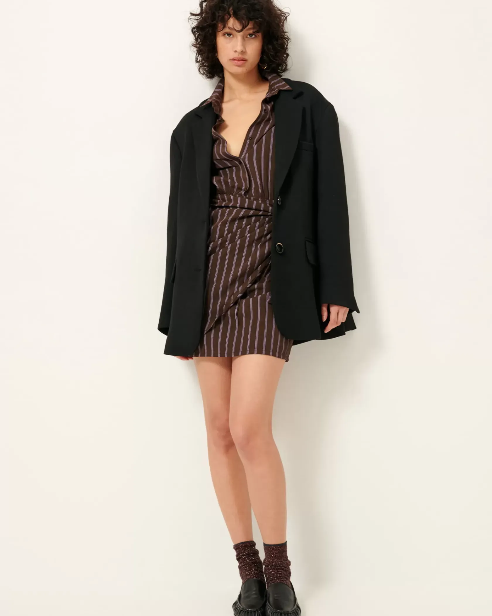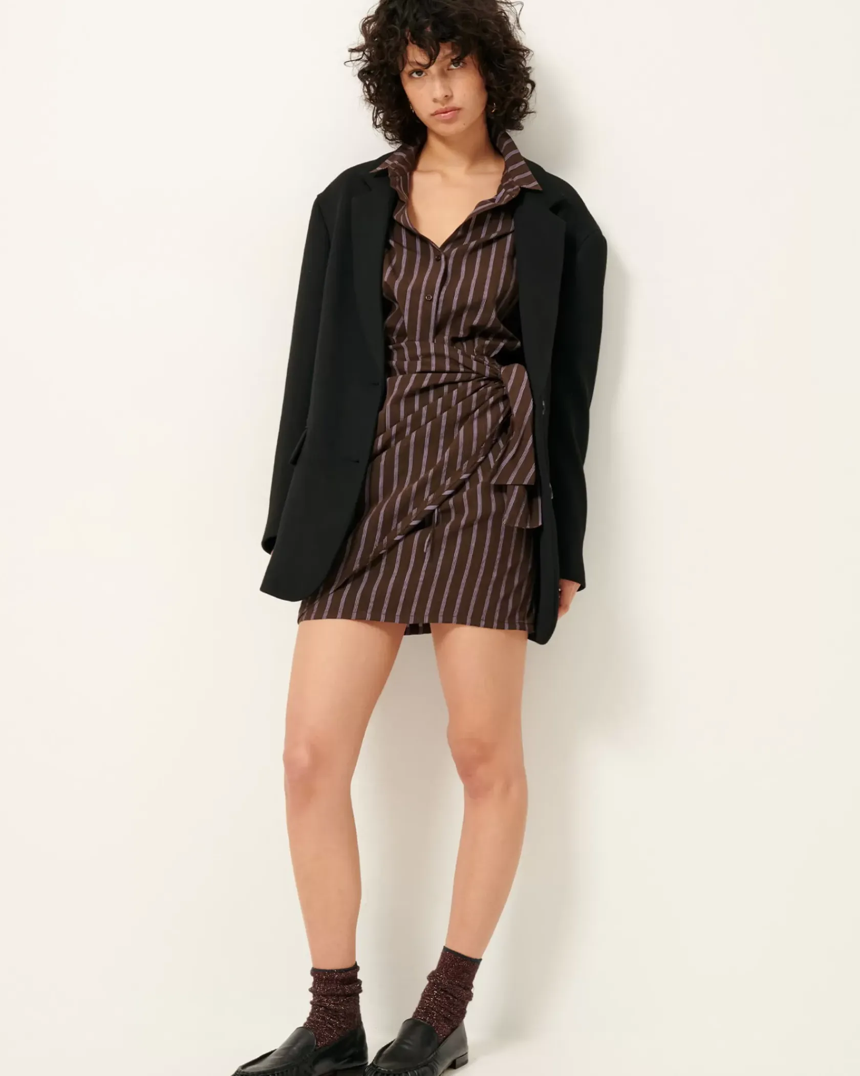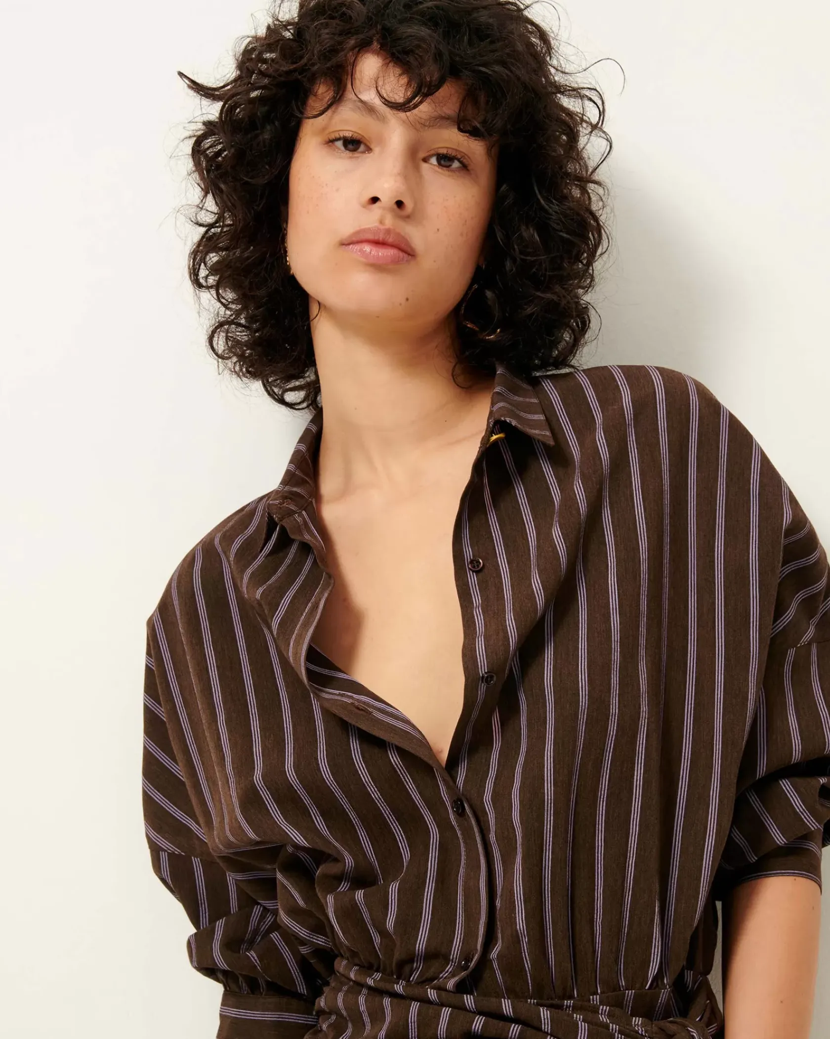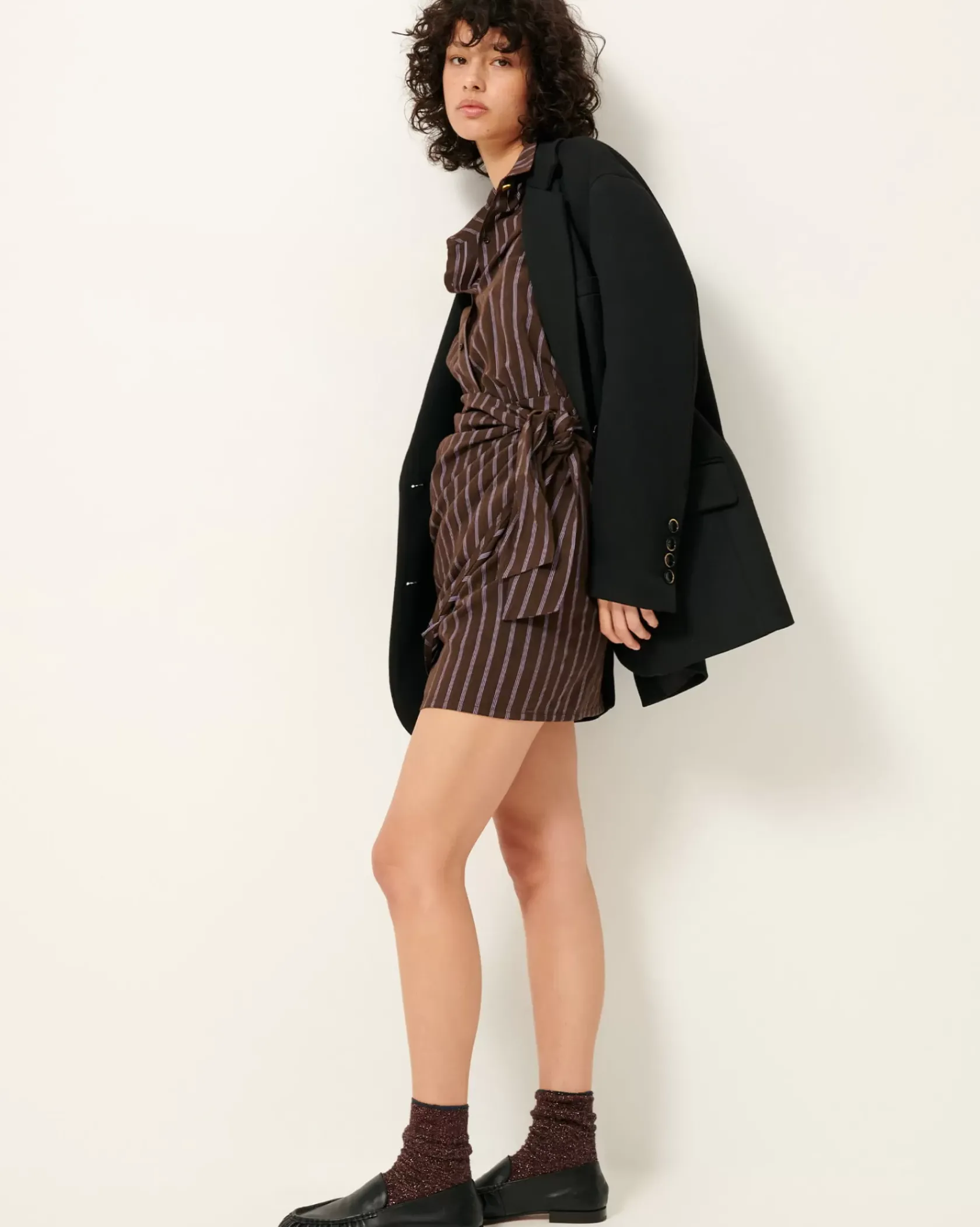 Robe chemisier courte nouée à la taille en linon à rayures avec travail d’armure et fil chiné, tissé en Italie.