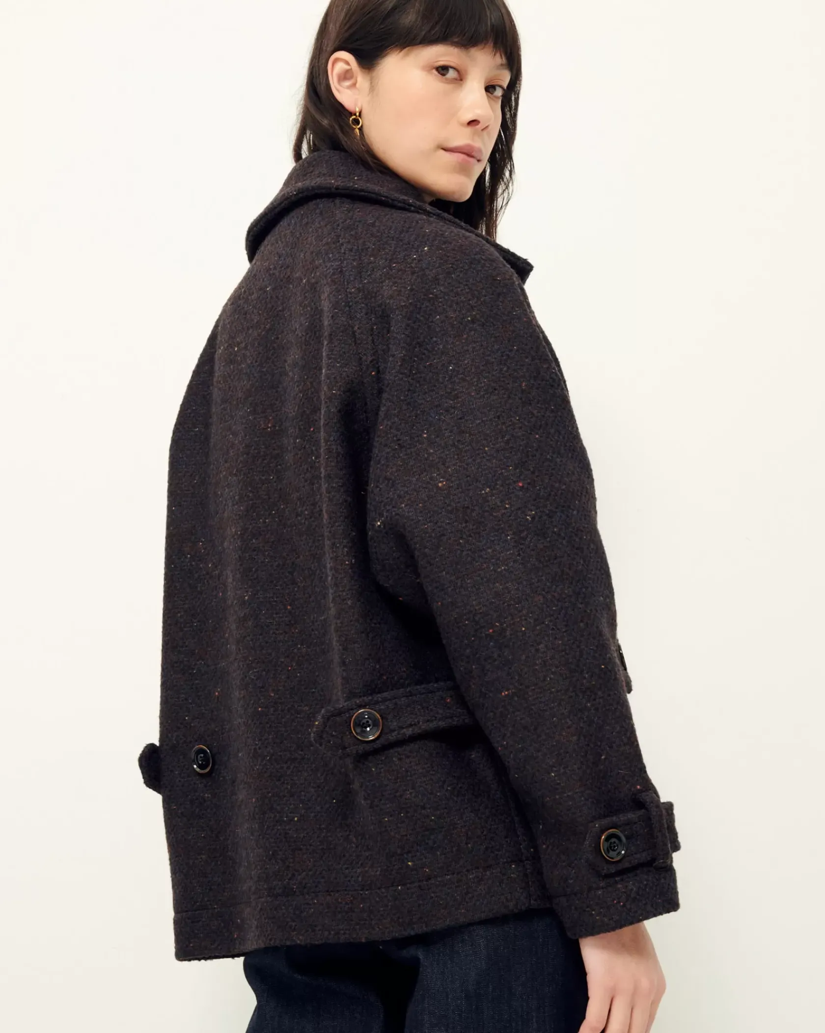 Manteau esprit blouson à emmanchures raglan et col haut en double tissage natté bicolore de fils bouclés, tissé en Italie