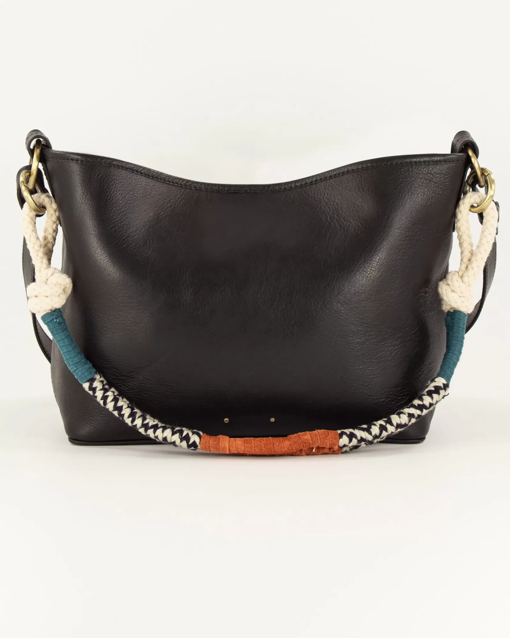 Sac en cuir de vache, jeu de anses corde tressée fantaisie et anse cuir.