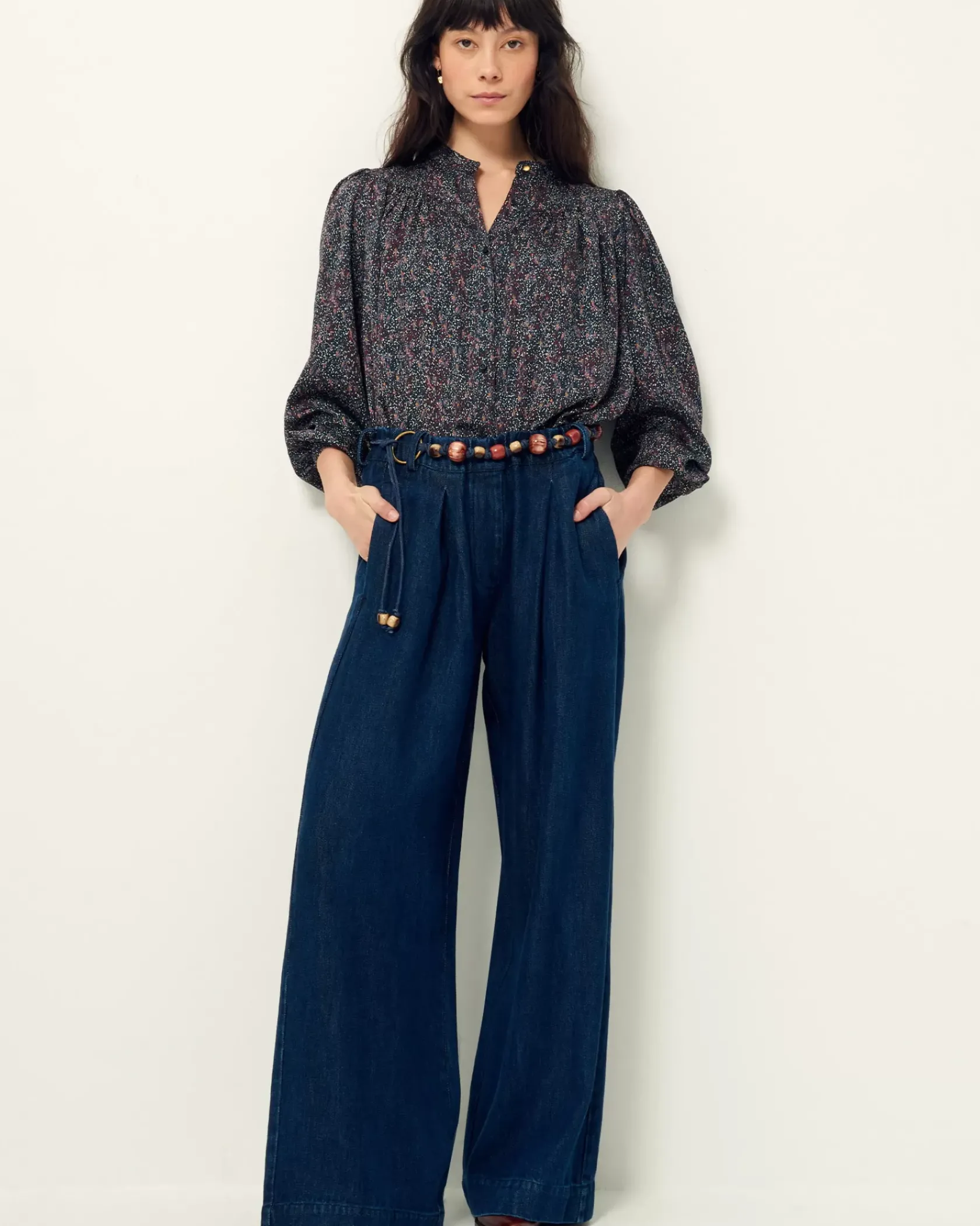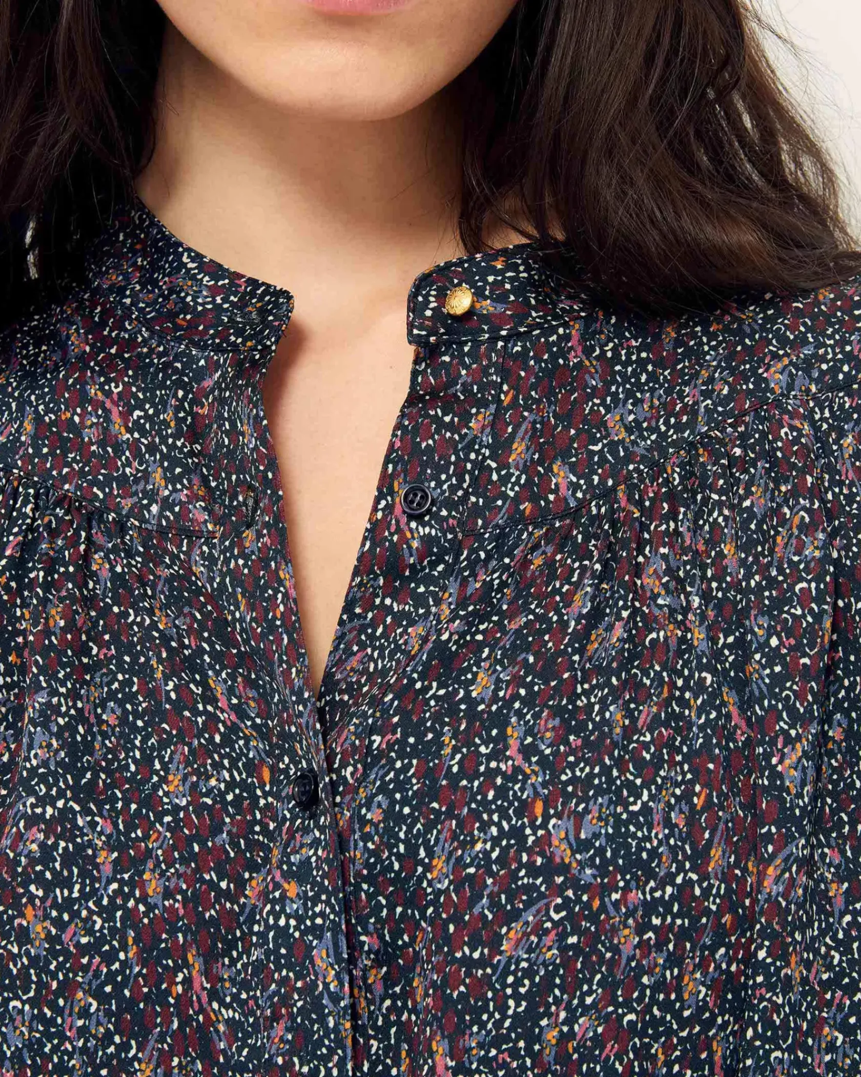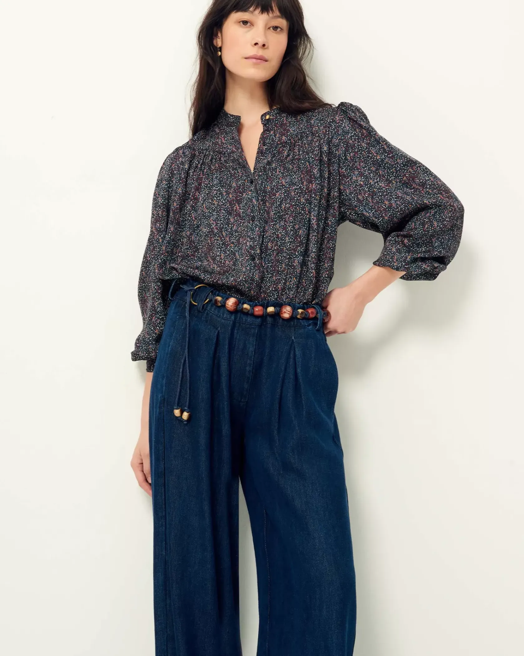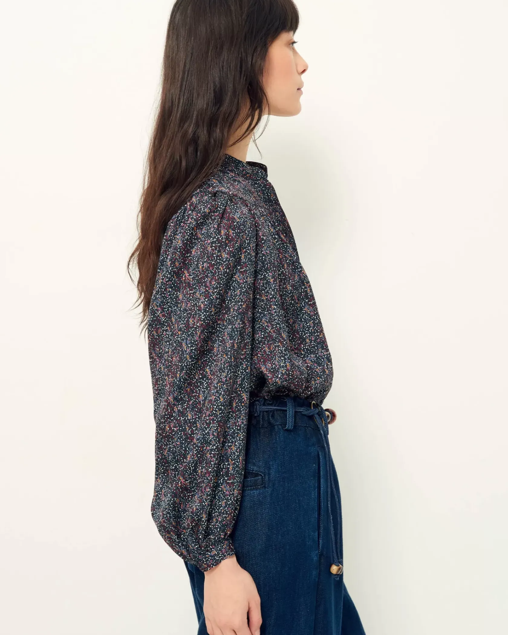 Blouse froncée et manches ballon en satin fluide de viscose.
