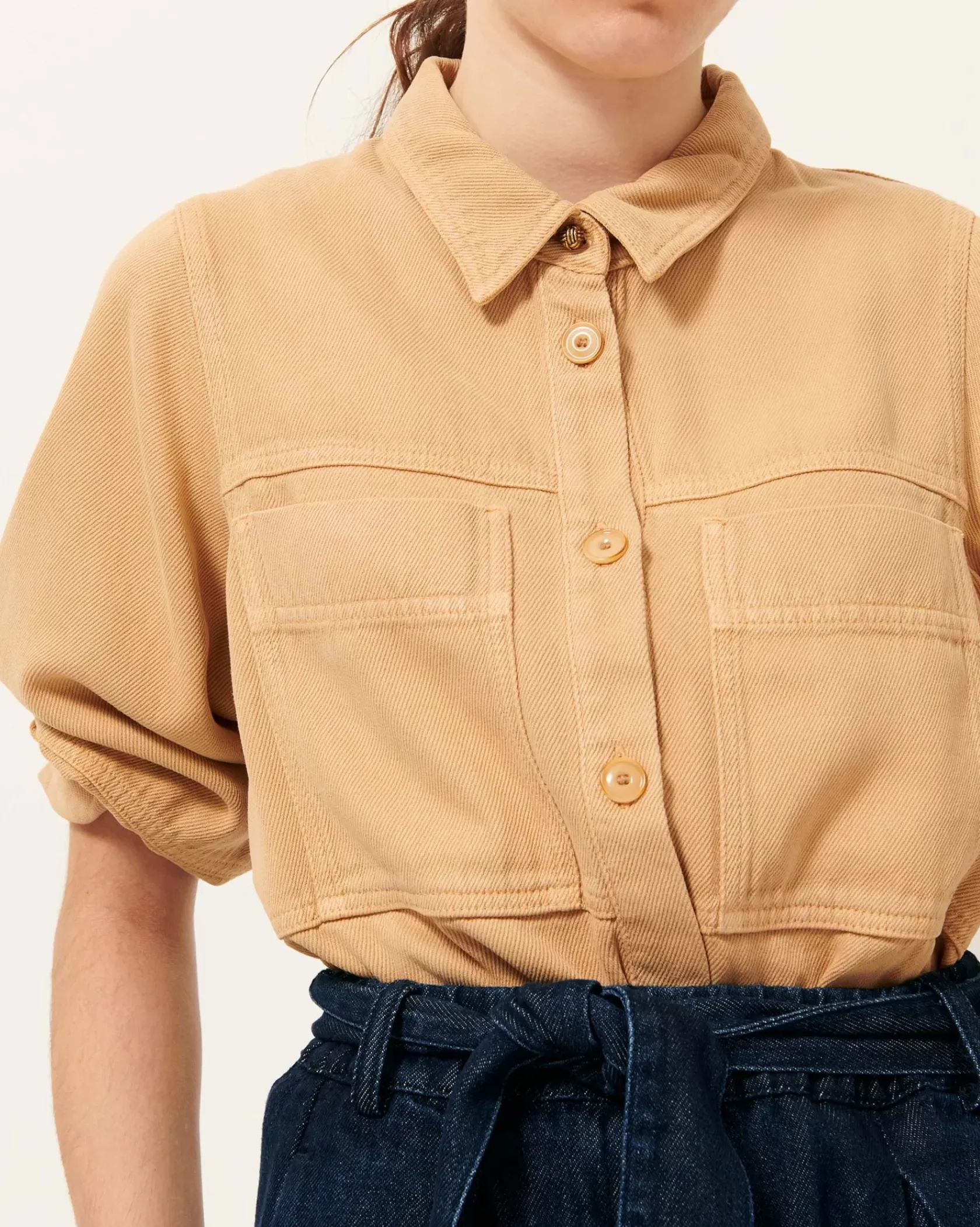 Surchemise à manches ballon en drill souple de tencel teint en plongé et tissé en Espagne.