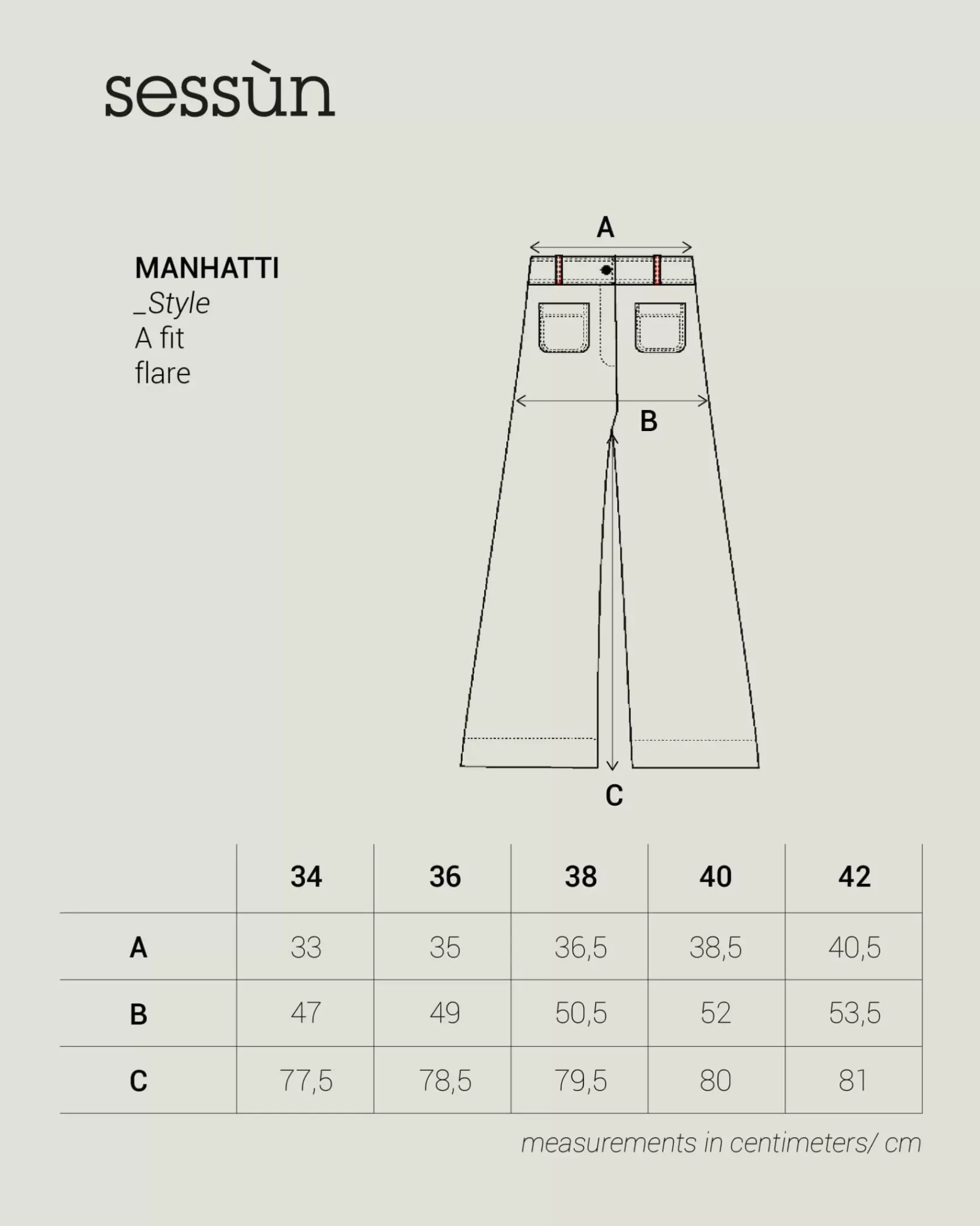 Pantalon évasé taille haute en toile armurée lin / coton rayée bicolore de fil flammé tissée en Espagne, surpiqûres contrastées en détail.