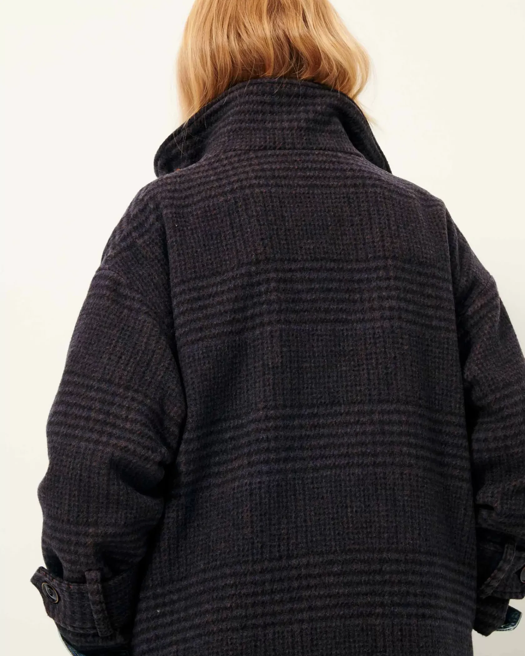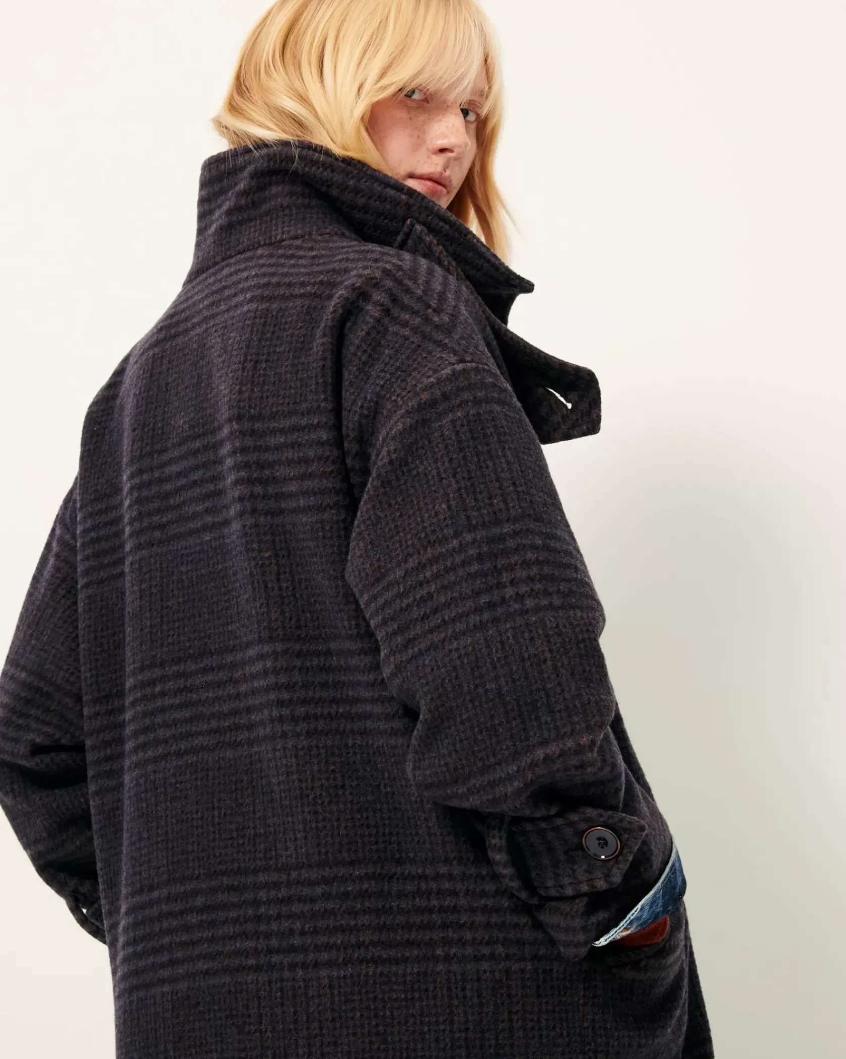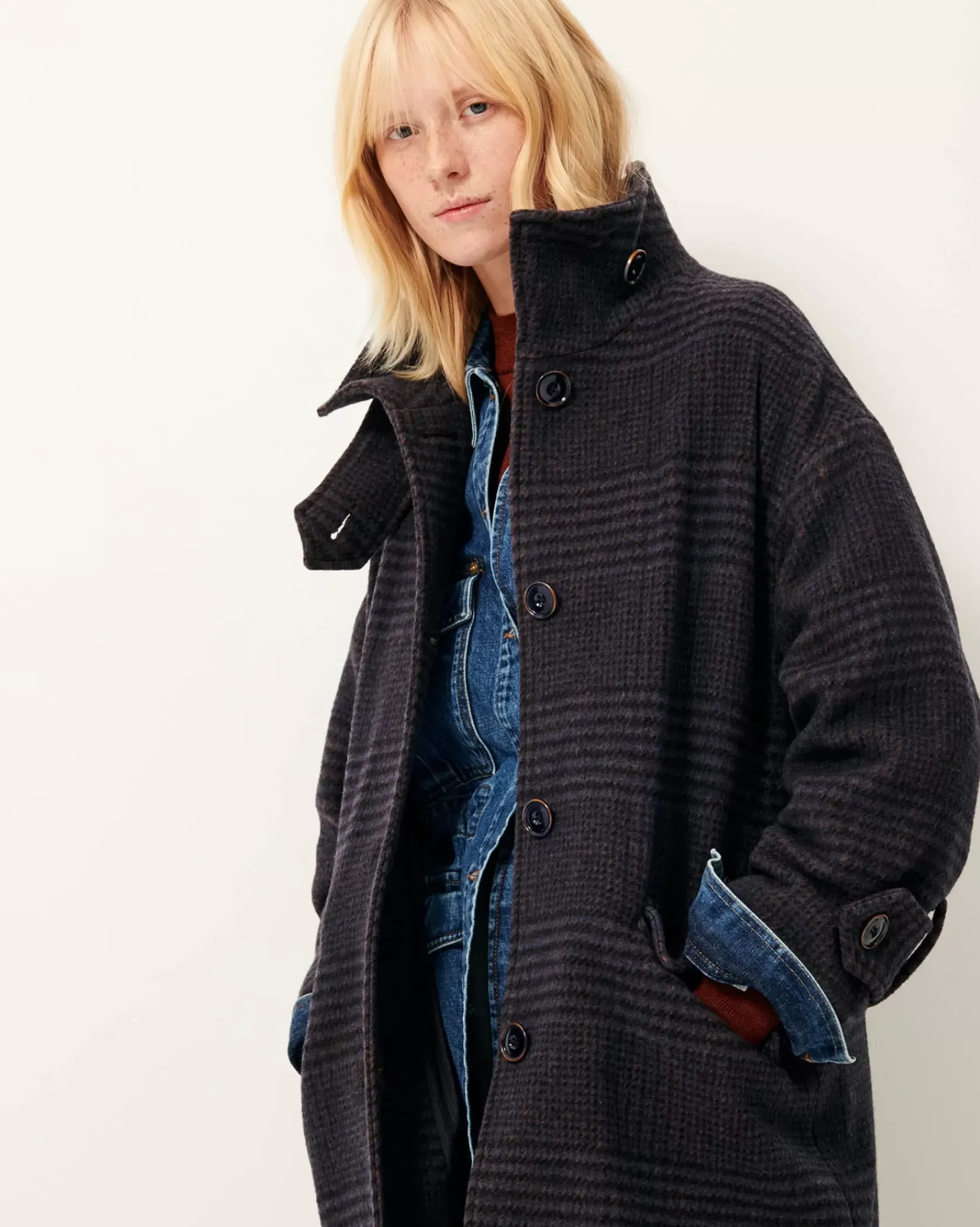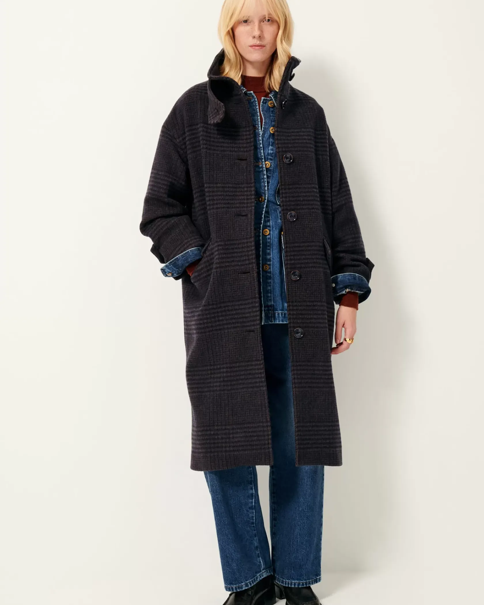 Manteau long col montant simple boutonnage en tartan double tissage finition velvet, tissé en Italie.
