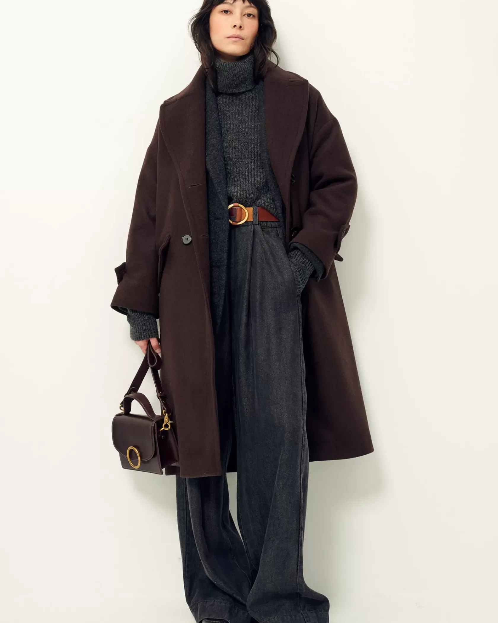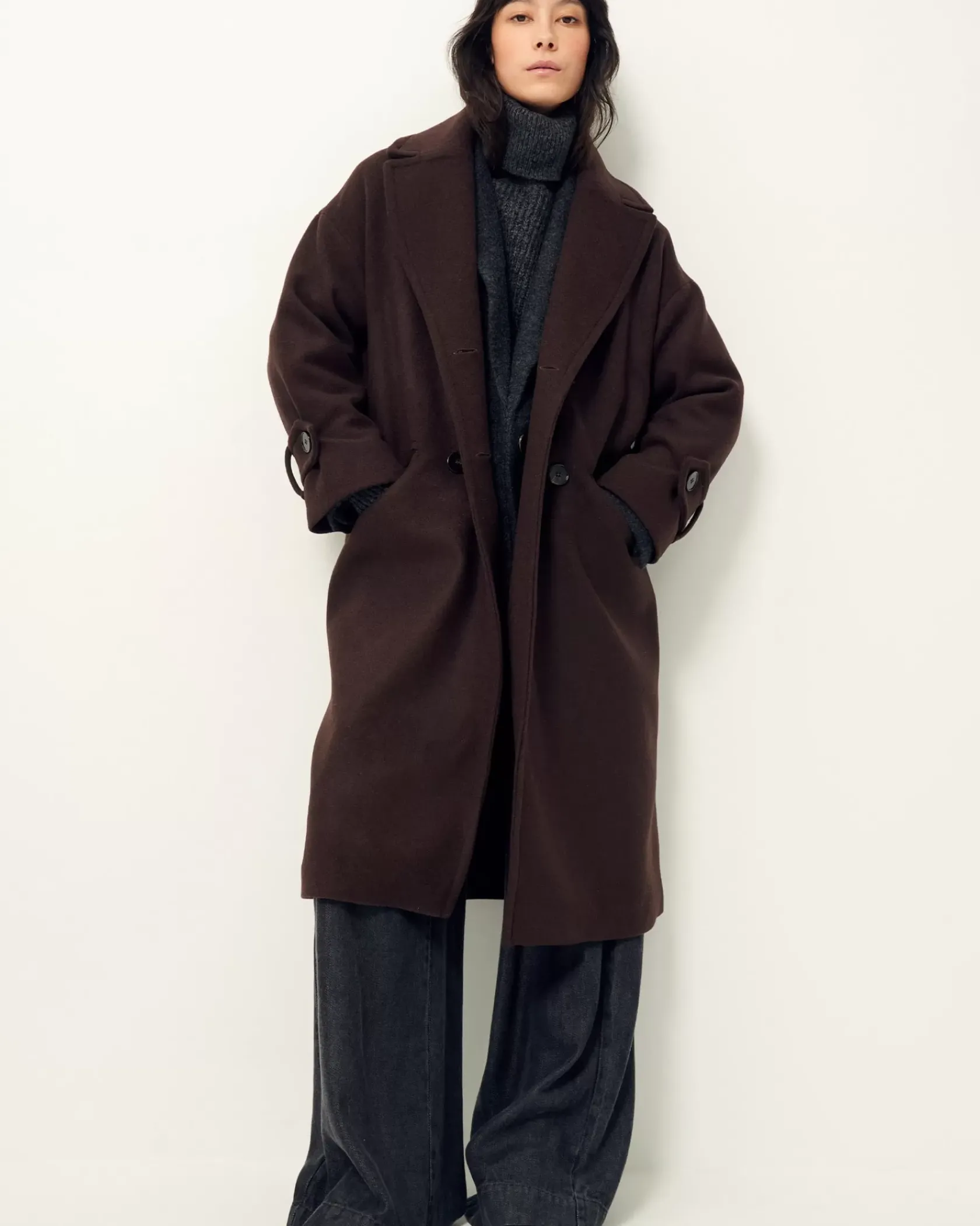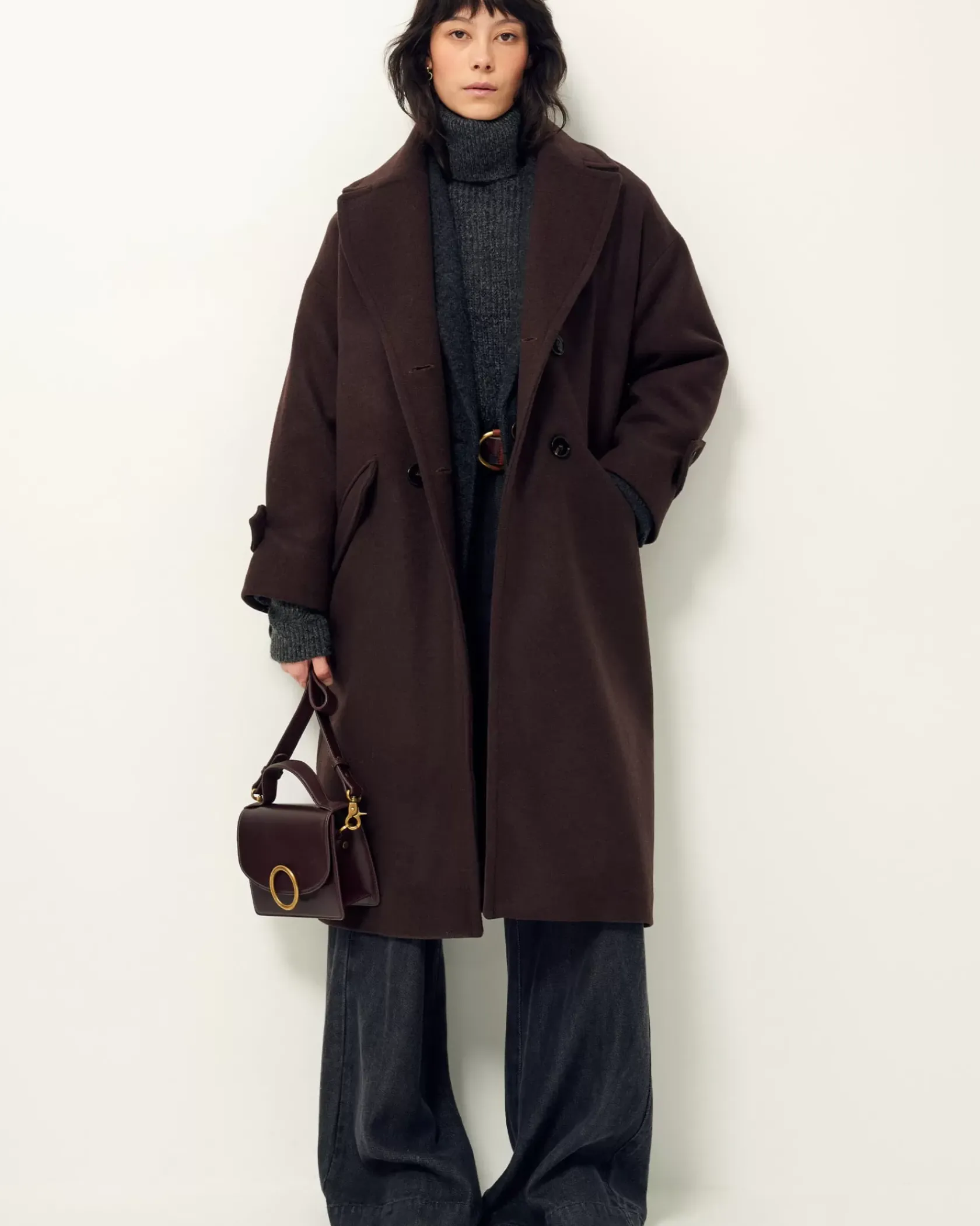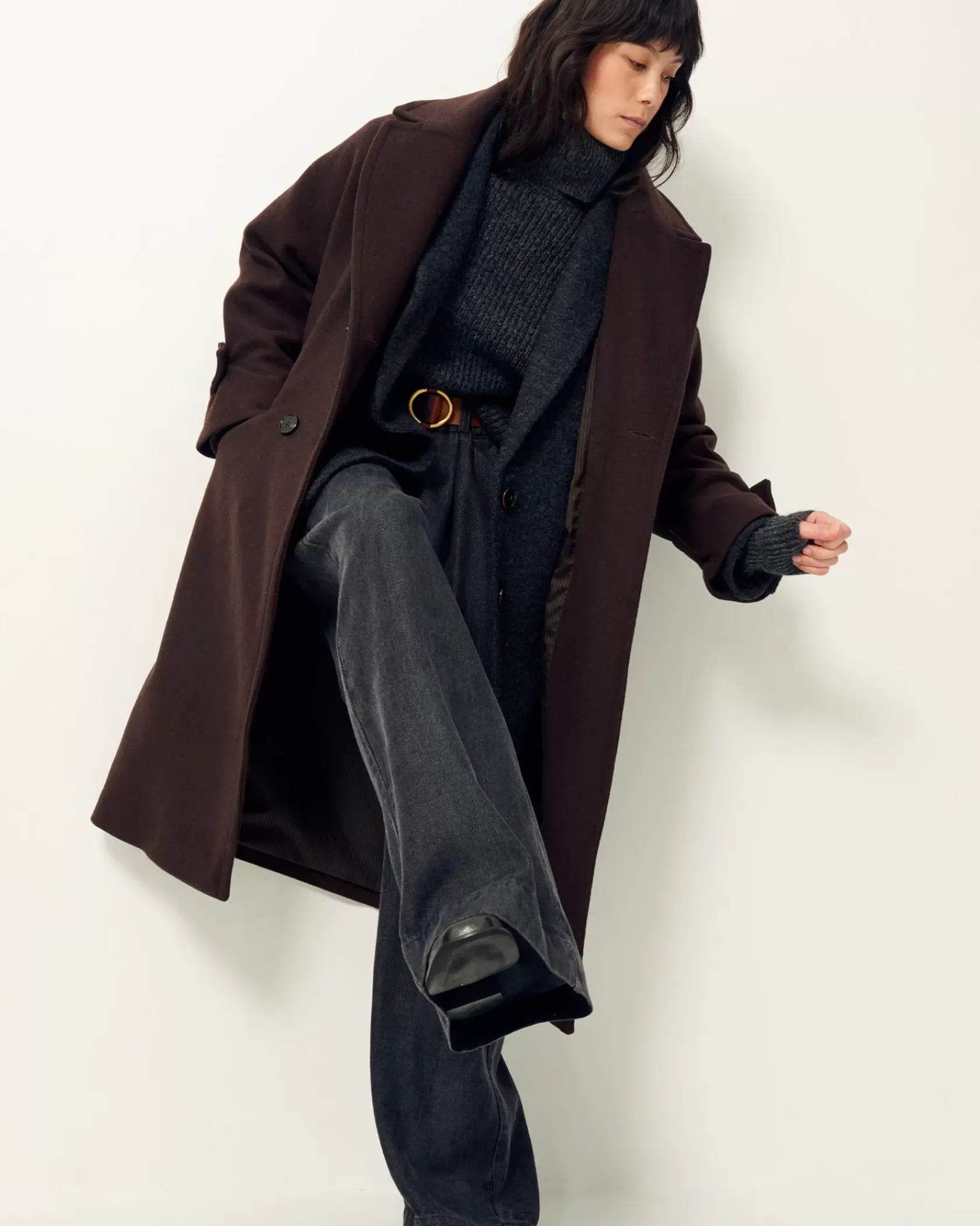 Manteau long à double boutonnage en double tissage melton finition velvet tissé en Italie.